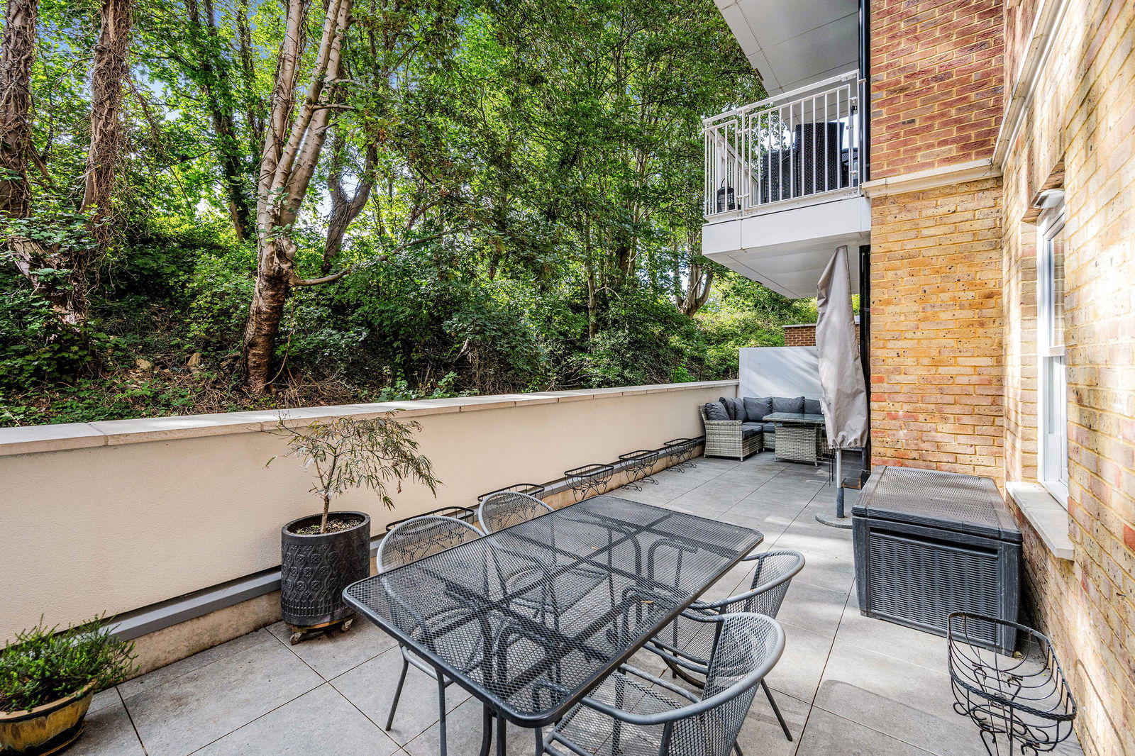 The private terrace gives plenty of opportunity to make a private oasis with room for pots and plants alike, with views of trees to the rear.