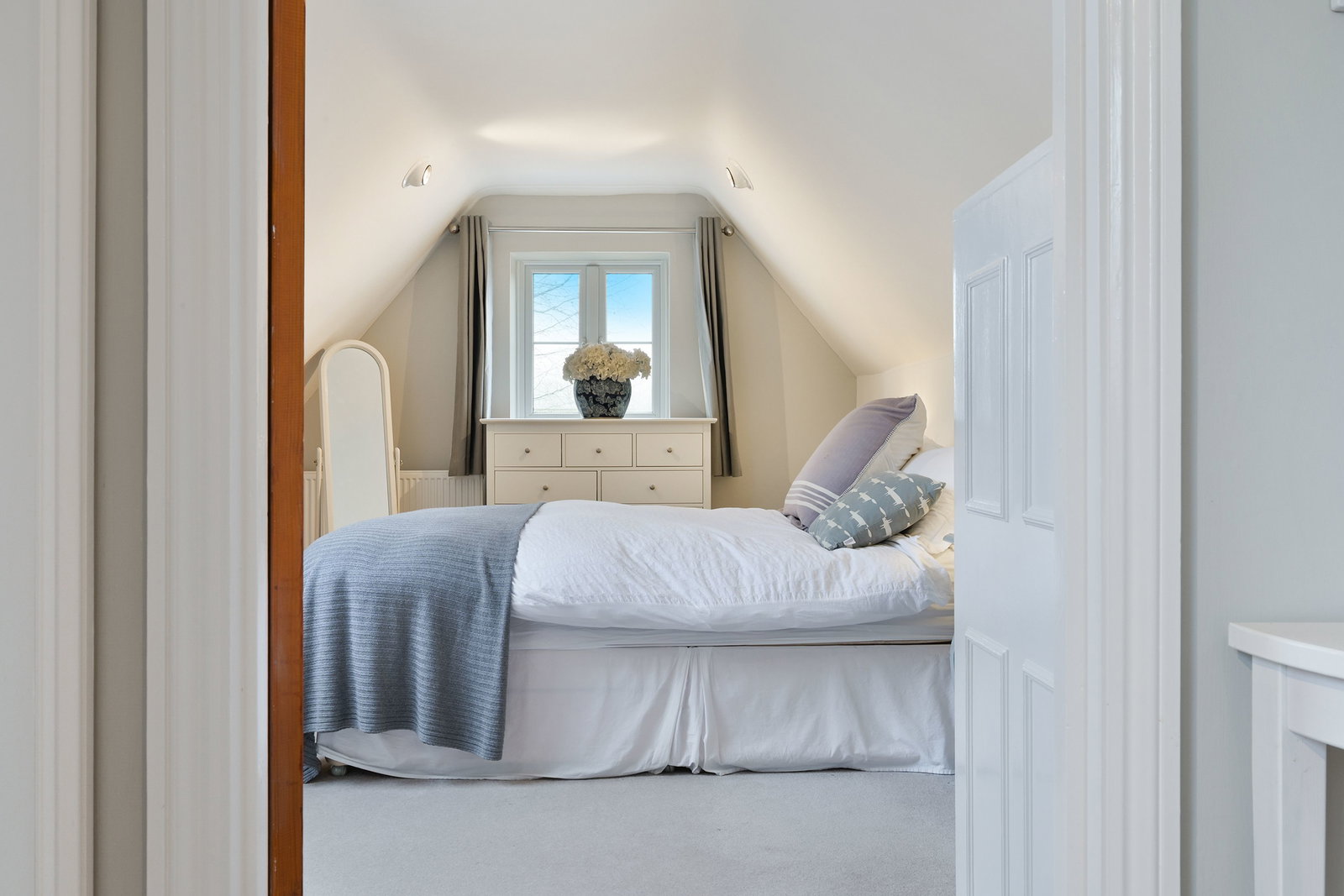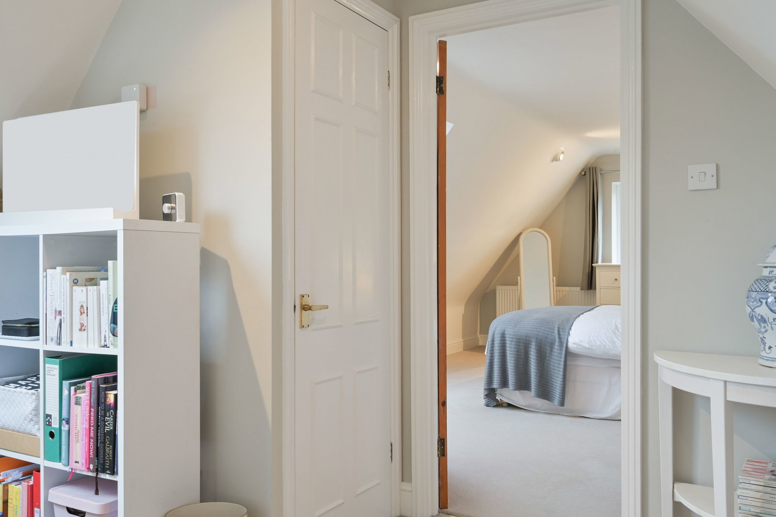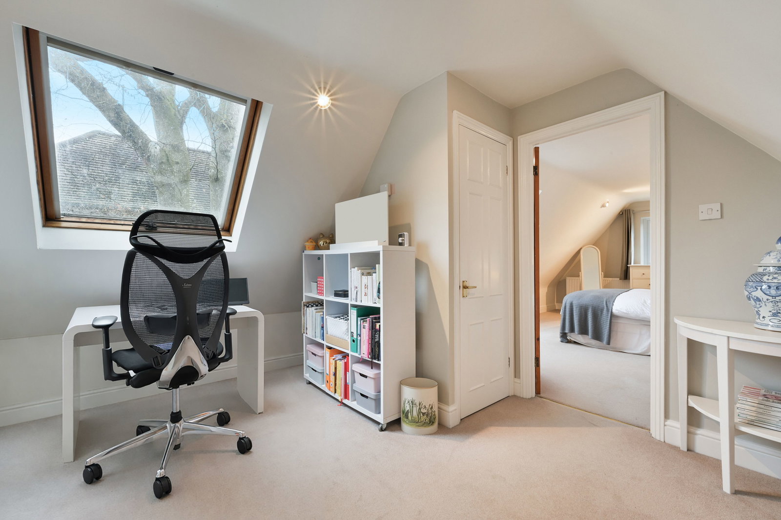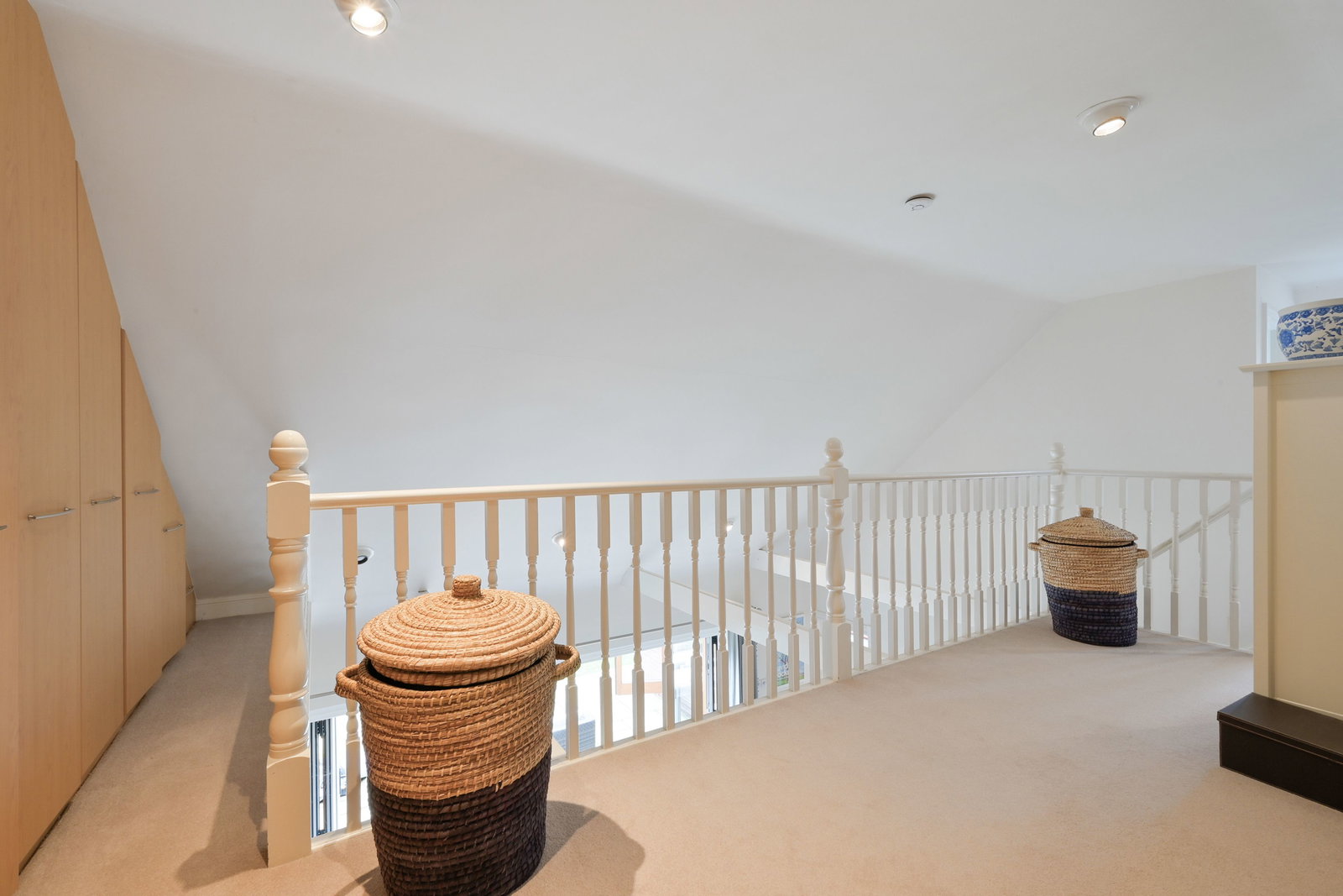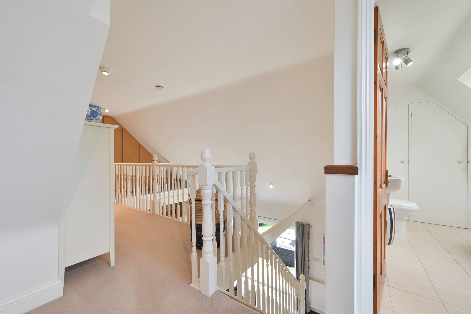 Stairs leading to the first floor which opens up into a most impressive galleried landing which is currently used as a dressing area with wall to wall wardrobes, there is a study area with skylight window there is also a bathroom on this level which incorporates a utility cupboard with space for washing machine and tumble dryer. The principal bedroom has a dual aspect which is bright and airy with eaves storage space and a built in cupboard.