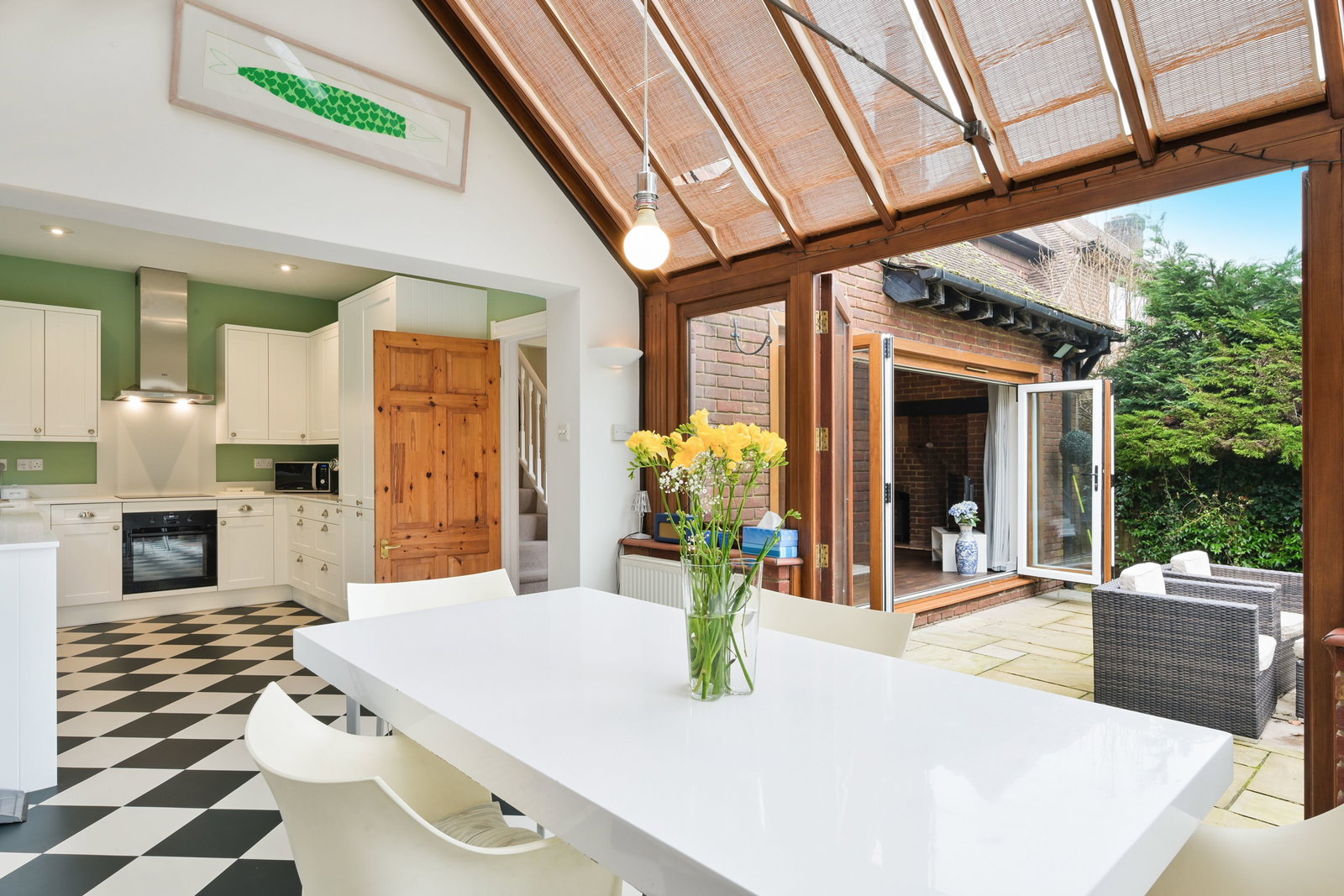 The ground floor entrance hall leads to cloakroom, 3 bedrooms one with an ensuite which would make an ideal an ideal guest room, there is also a family bathroom leading onto the rear reception room which offers an abundance of space, feature brick wall with fireplace and wood burner, bifold doors leading onto the private mature rear garden. The kitchen incorporates to the light-filled conservatory opening onto the garden, ideal for indoor and outdoor living.