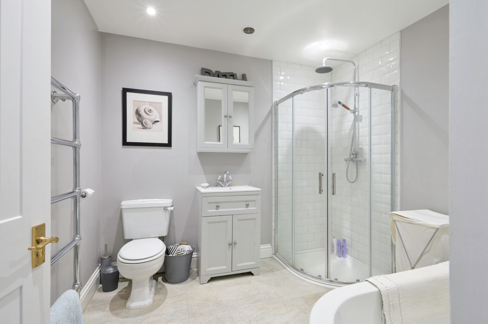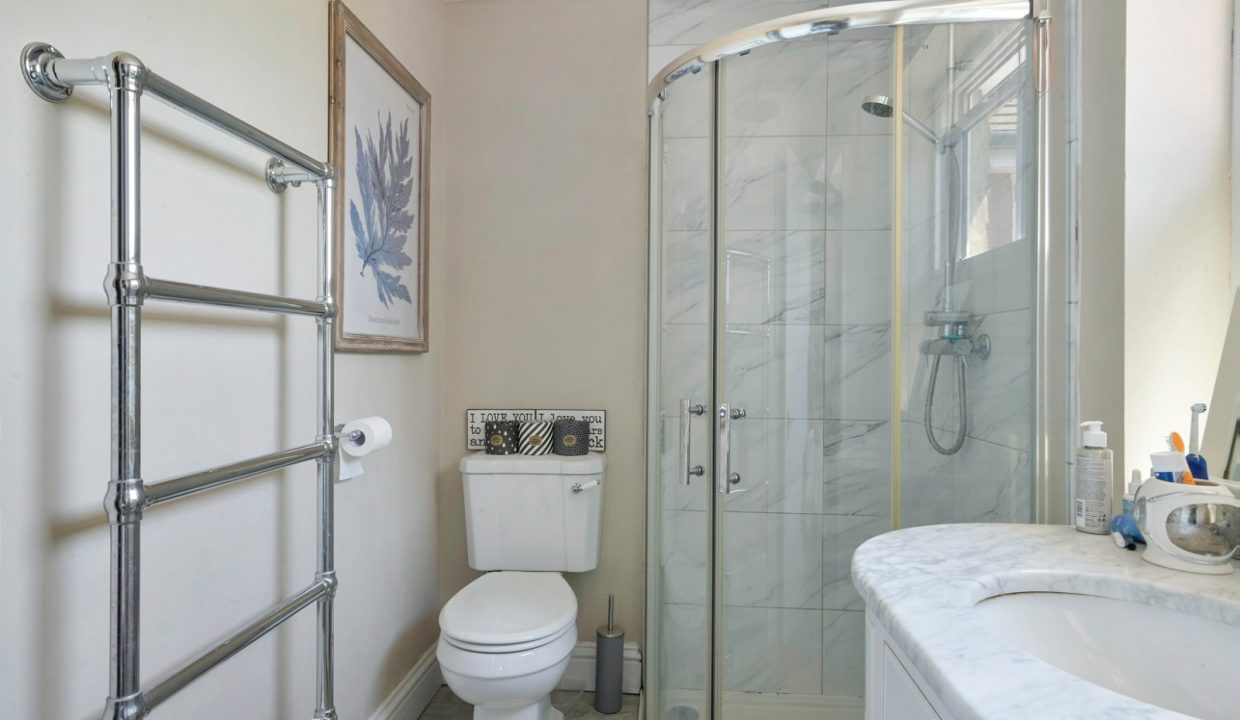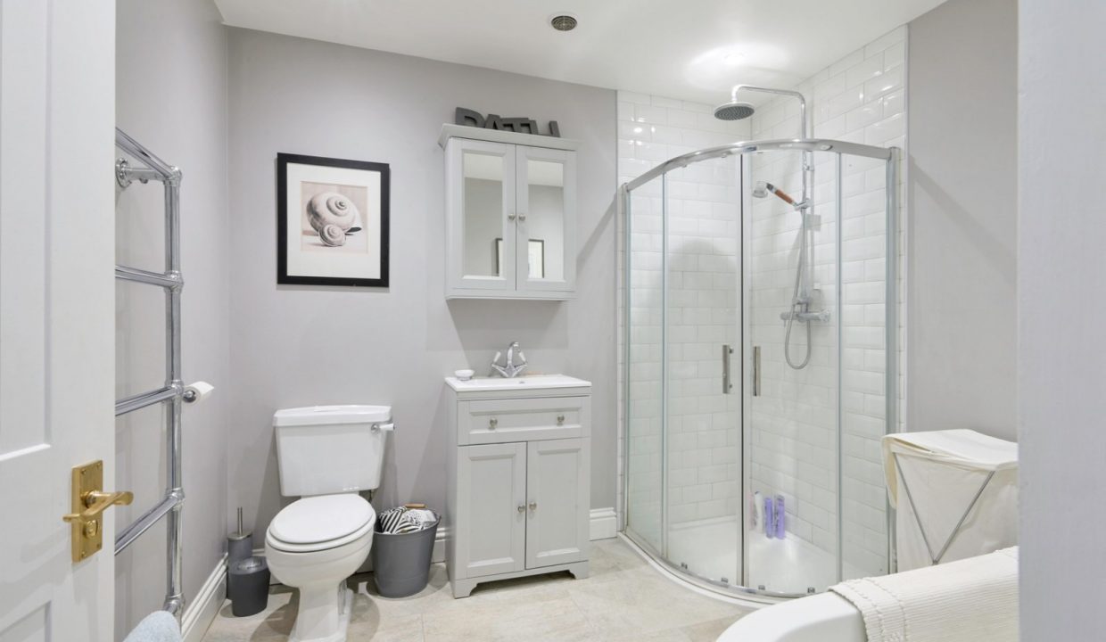 On the first floor the principle bedroom is with en suite shower room, 3 further double bedrooms, spacious landing leading to the family bathroom with white suite comprising wc, wash basin with vanity unit under, corner two-headed shower with roll-top bath.
