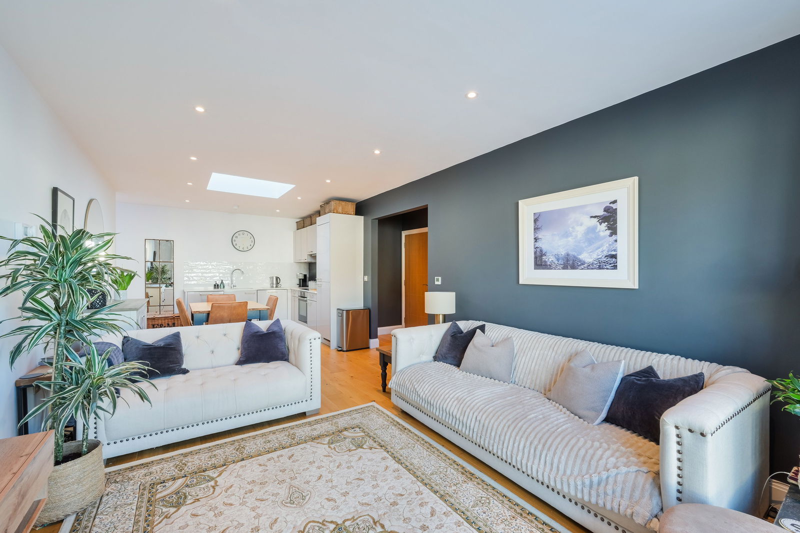 Enter through the welcoming hallway into a spacious open-plan kitchen and living area with media shelf, designed for modern living. The kitchen is fully fitted with attractive contemporary units and a range of integrated appliances, creating a sleek and functional space.