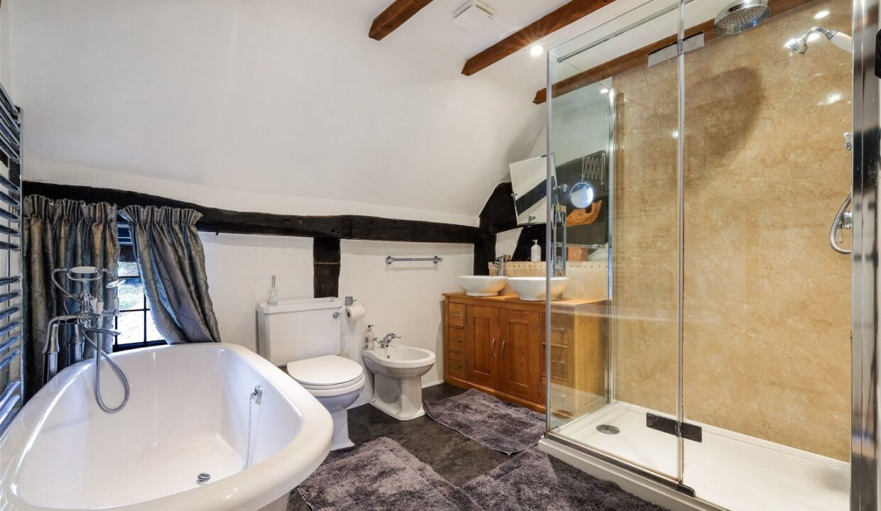 Upstairs are three double bedrooms. The triple aspect Master bedroom is surprisingly spacious and boasts a vaulted ceiling. There is a recently refitted bathroom including bath, walk in shower, w.c., bidet and double basins. The property also features the original Priest Hole entrance in the landing.