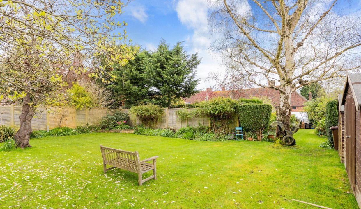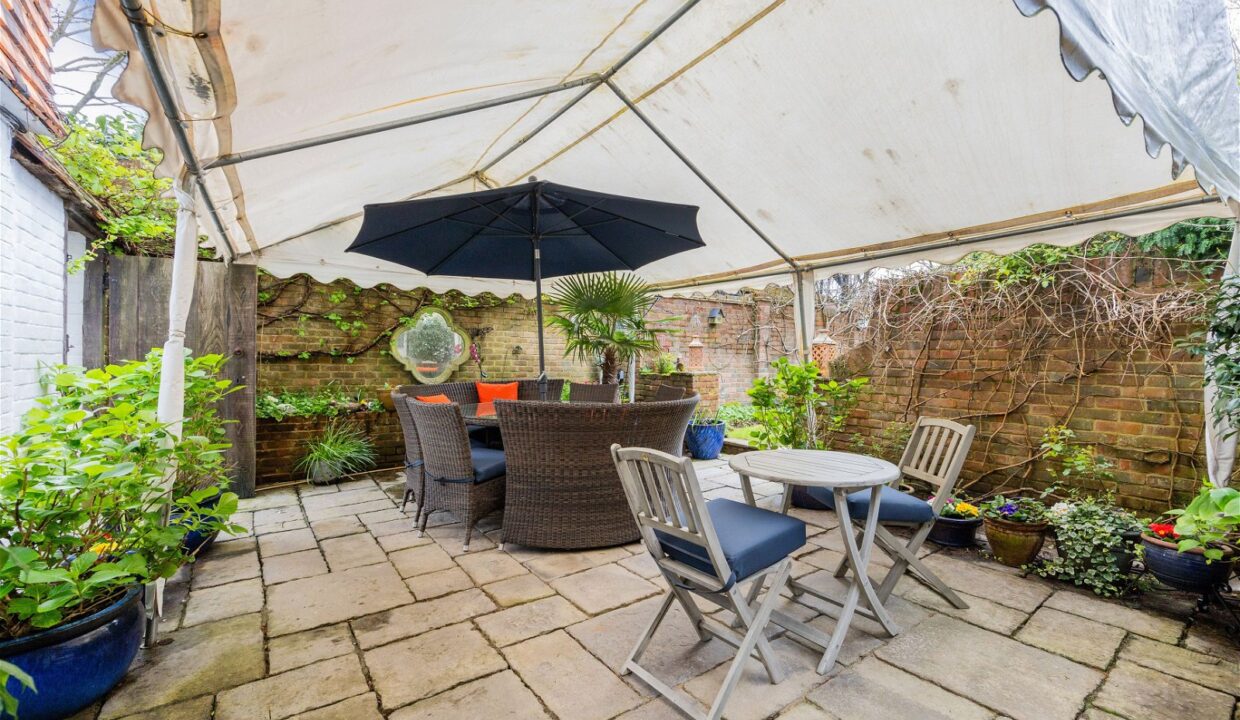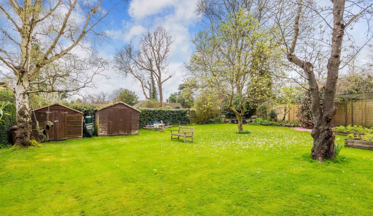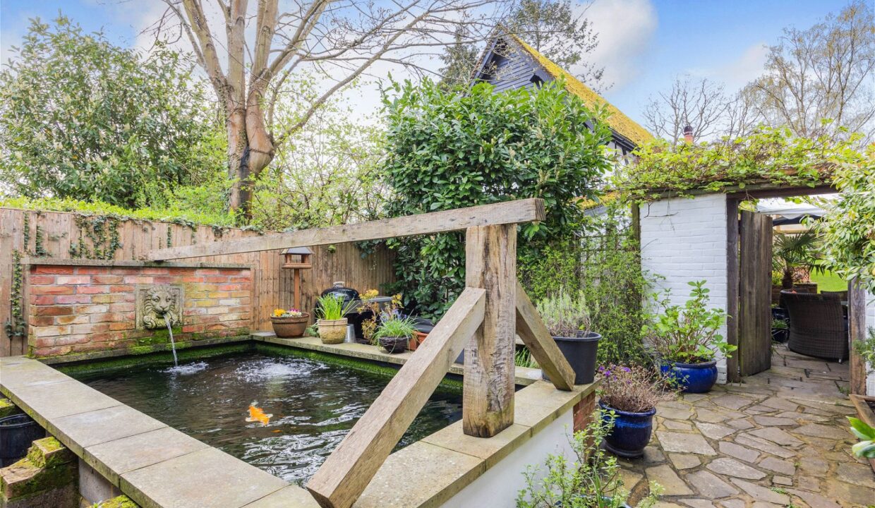 Outside is a beautiful West facing courtyard/patio area with a lawned area leading to a good sized private rear garden with mature trees and two sheds. To the side is a further courtyard area with raised pond, access to the front of the property and garage.