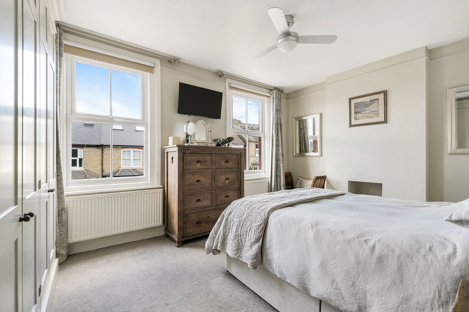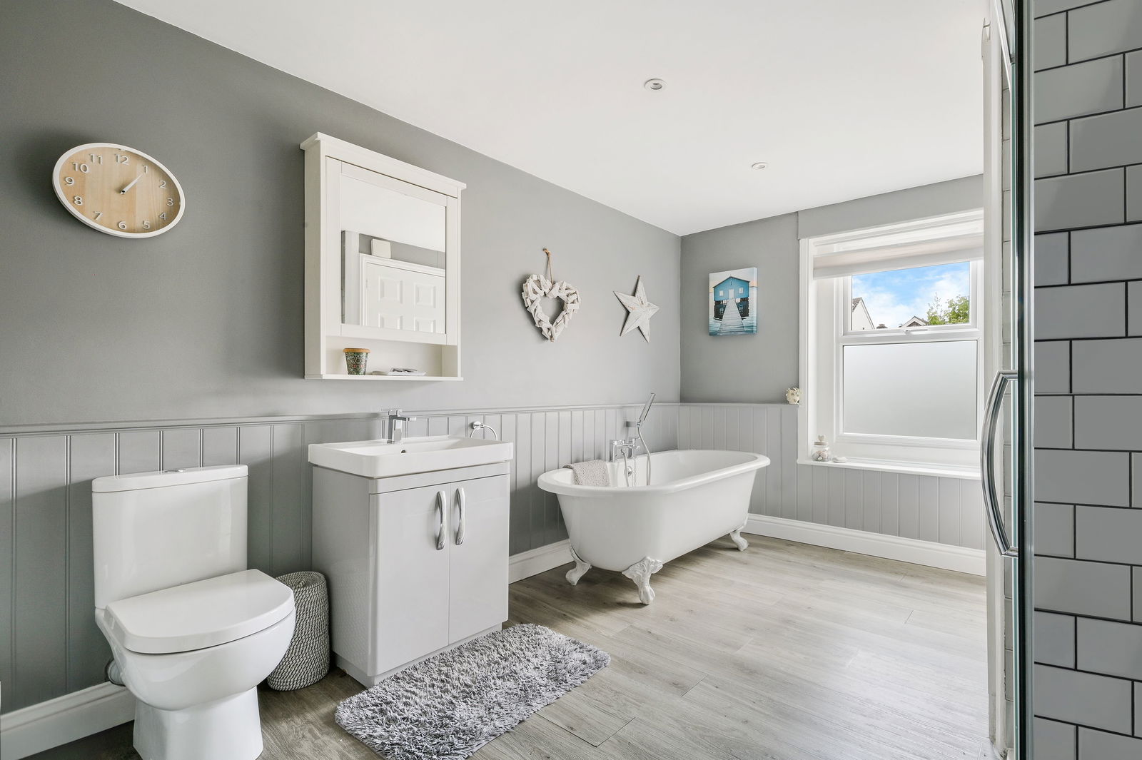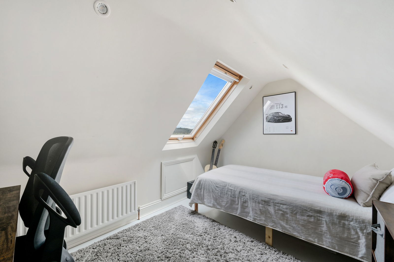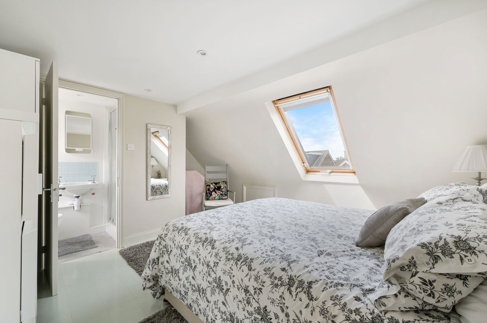 The first floor hosts two generous double bedrooms, including the principal bedroom at the front, flooded with natural light. A modern family bathroom is located on this floor, stylishly appointed with a full-size bath, overhead shower, and contemporary tiling. A further two bedrooms, one with ensuite bathroom, are located on the top floor, offering charming rooftop views and ample space for children, guests, or additional workspace.