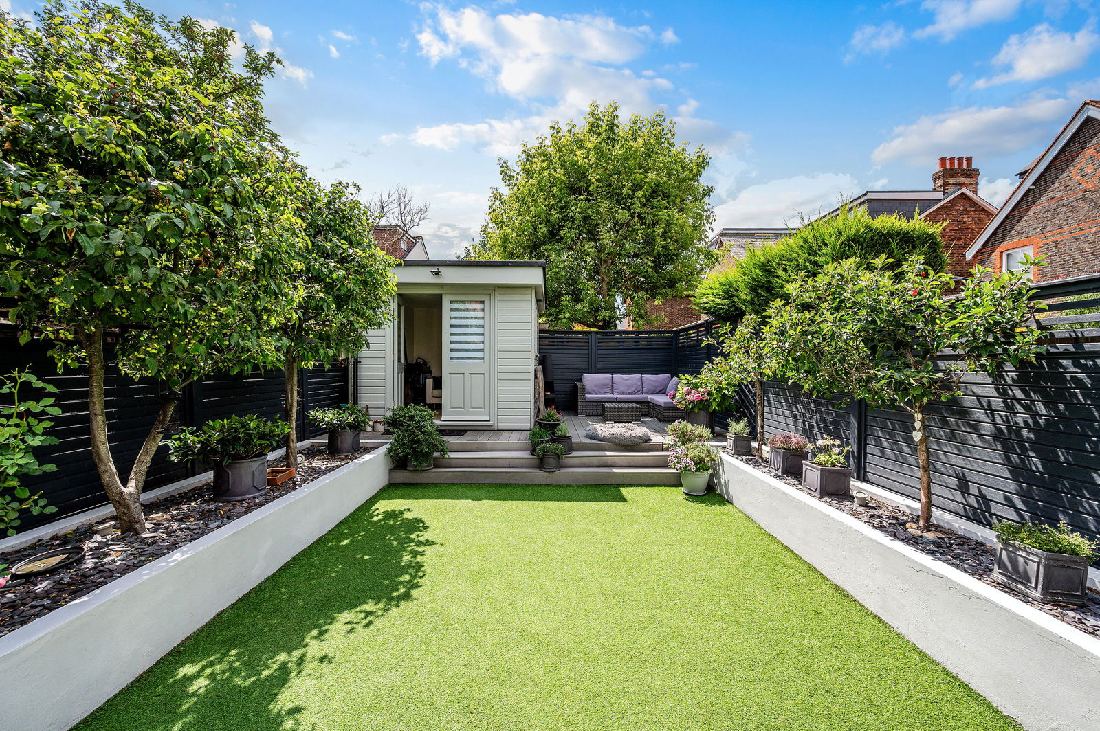 The private rear garden has been carefully landscaped with a patio seating area, Astro turf, and low-maintenance borders, creating a serene outdoor haven. The garden benefits from a South West facing orientation and includes a stylish home office and side access.