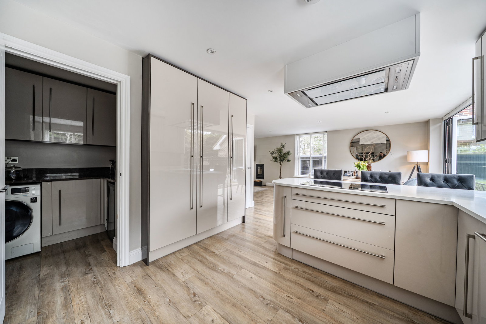 The ground floor is centred around an impressive open-plan kitchen/reception/dining room, creating a superb space for both everyday living and entertaining. The kitchen is well-appointed with modern fittings and flows seamlessly into the dining and living areas, with direct access to the garden allowing for an abundance of natural light. A separate study provides an ideal work-from-home space, complemented by a useful utility room and cloakroom. The integral garage offers excellent storage or further potential, alongside off-street parking to the front.