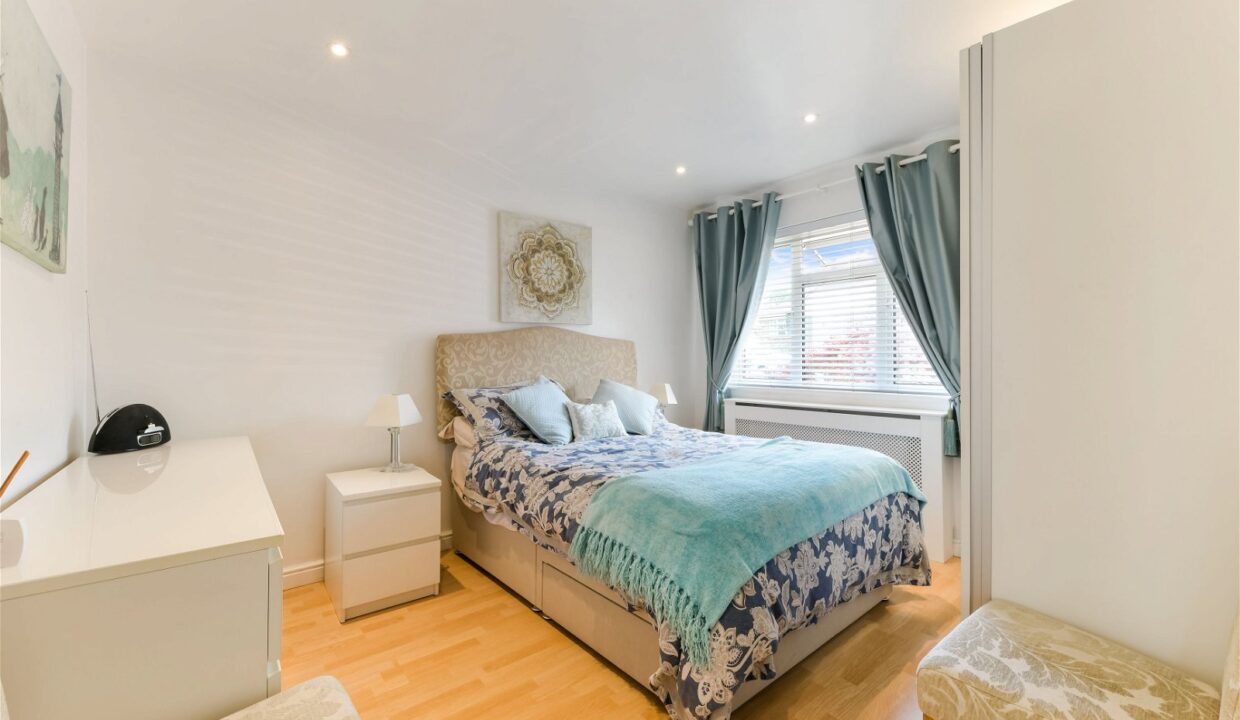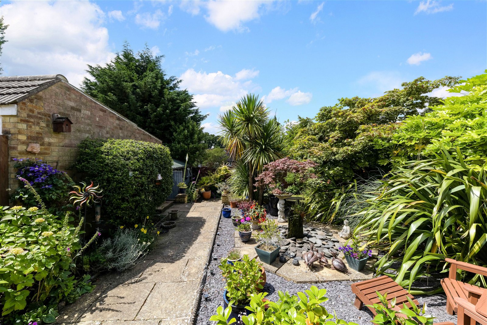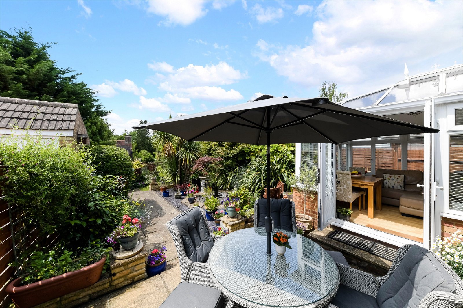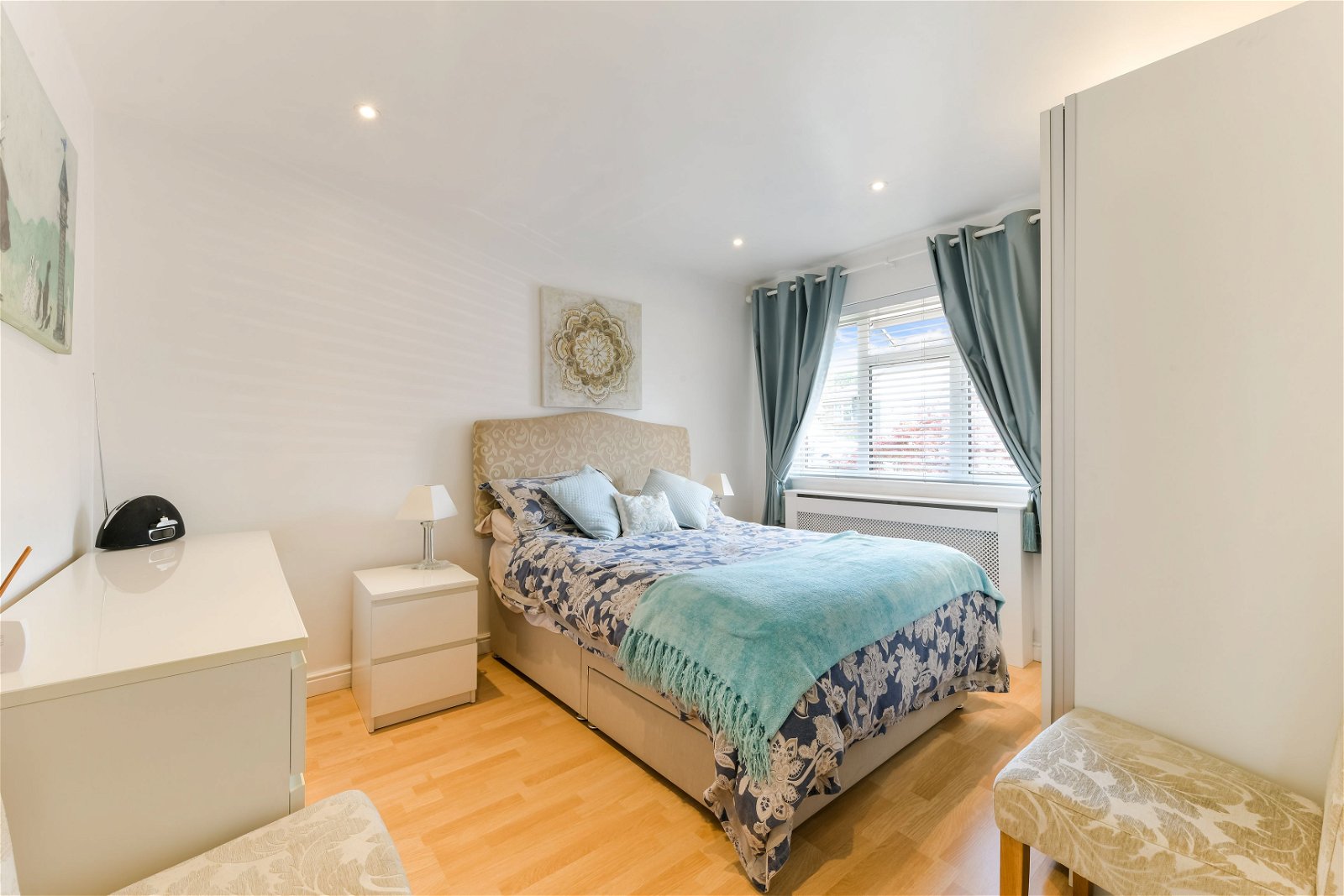 Once inside, the convenient entrance hall leads to two spacious double bedrooms (the master bedroom has fitted wardrobes) & bathroom. At the rear of the property is the modern kitchen with built in appliances, and which has views over the rear garden. There is a generous sized living/dining room which has French doors that then lead to a good size terrace and stunning west facing rear garden with a water feature, offers privacy and is the ideal space for both relaxing or entertaining.