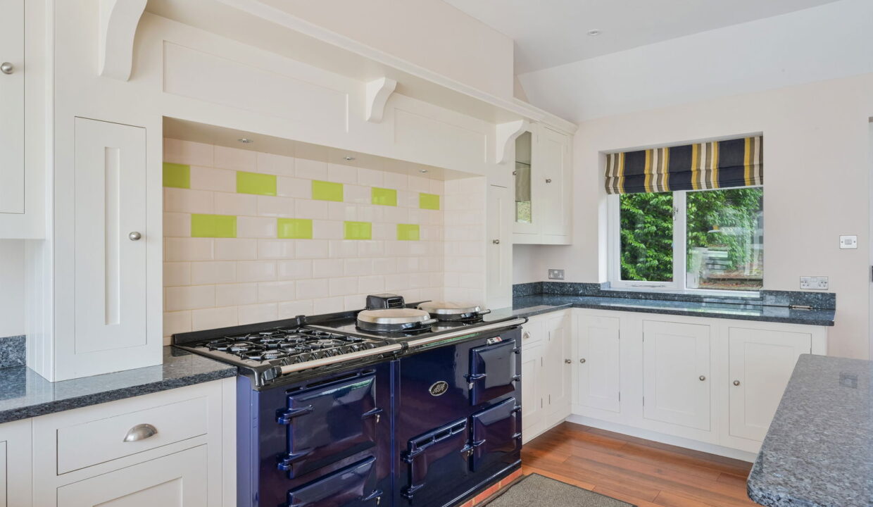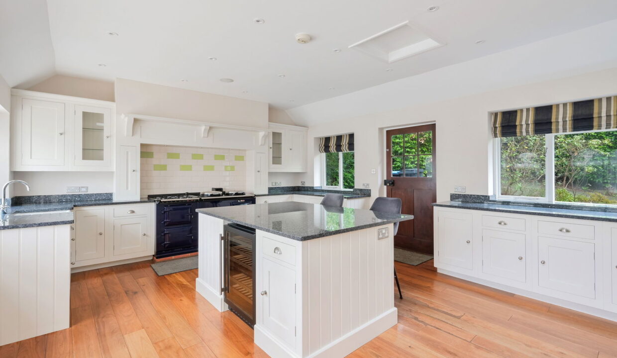 -Kitchen/breakfast room with comprehensive range of wall and base level units in a traditional style, sink and drainer. AGA four oven cooker to high fireplace recess. Central island with breakfast bar