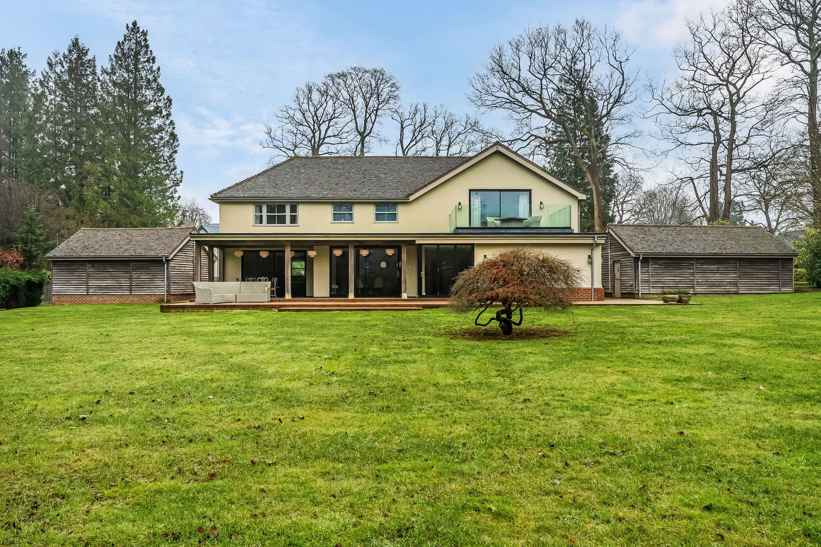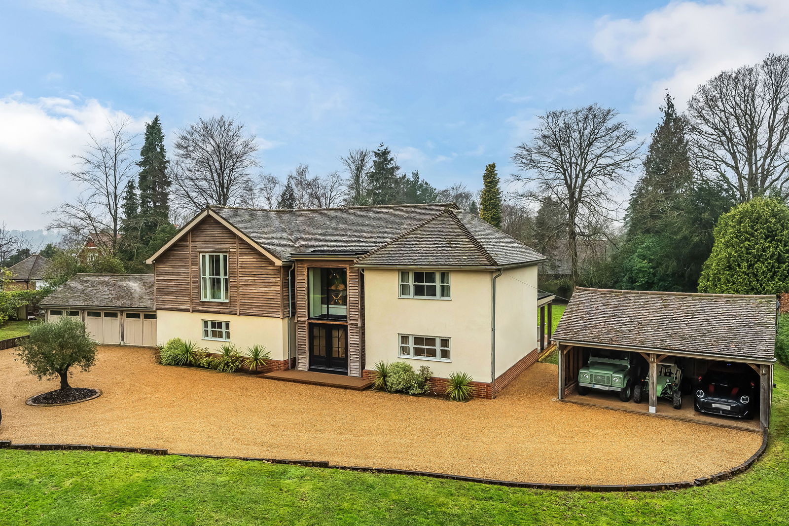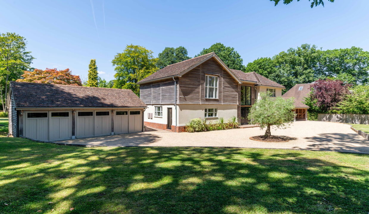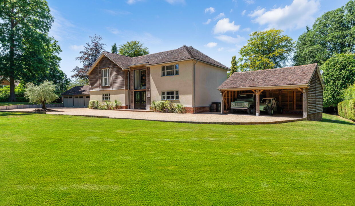This distinctive detached country residence has been the subject of comprehensive extension and rebuilding. Completed only in 2023, the house is designed for opulent living. Whilst there is an ‘open’ feel, bespoke Bomen doors with complimentary Buster & Punch brass furniture stylishly divide the ground floor rooms into specific living areas. The kitchen/family room is firmly at the heart of the house. With bespoke cabinetry, the thoughtful design caters for the demands of modern living, retaining functionality and style. On the first floor, the principle bedroom is a further feature with vaulted ceiling, twin dressing rooms, well appointed en-suite bathroom, and doors to terrace/balcony which enjoys views over the rear garden. Stepping outside, the house is approached by automatic gates opening to an impressive driveway which features a mature olive tree. There is a detached triple garage block and an oak framed barn style double carport provides further under cover parking.