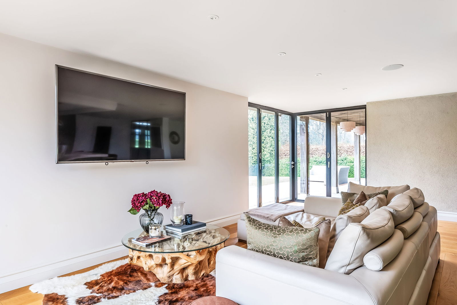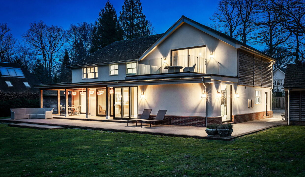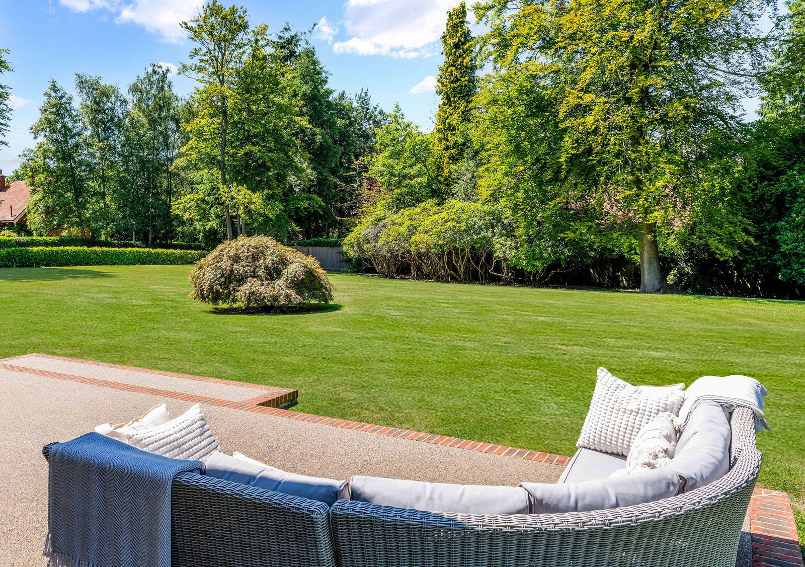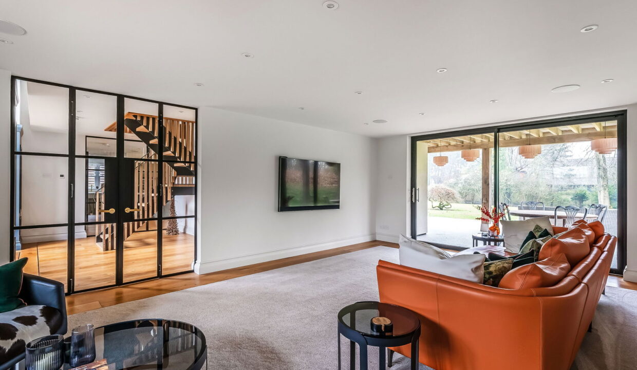 This distinctive detached country residence has been the subject of comprehensive extension and rebuilding. Completed only in 2023, the house is designed for opulent living. Whilst there is an ‘open’ feel, bespoke Bomen doors with complimentary Buster & Punch brass furniture stylishly divide the ground floor rooms into specific living areas. The kitchen/family room is firmly at the heart of the house. With bespoke cabinetry, the thoughtful design caters for the demands of modern living, retaining functionality and style. On the first floor, the principle bedroom is a further feature with vaulted ceiling, twin dressing rooms, well appointed en-suite bathroom, and doors to terrace/balcony which enjoys views over the rear garden. Stepping outside, the house is approached by automatic gates opening to an impressive driveway which features a mature olive tree. There is a detached triple garage block and an oak framed barn style double carport provides further under cover parking.