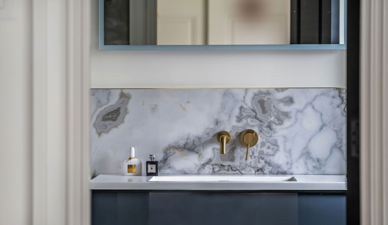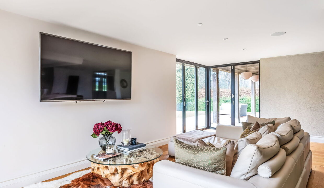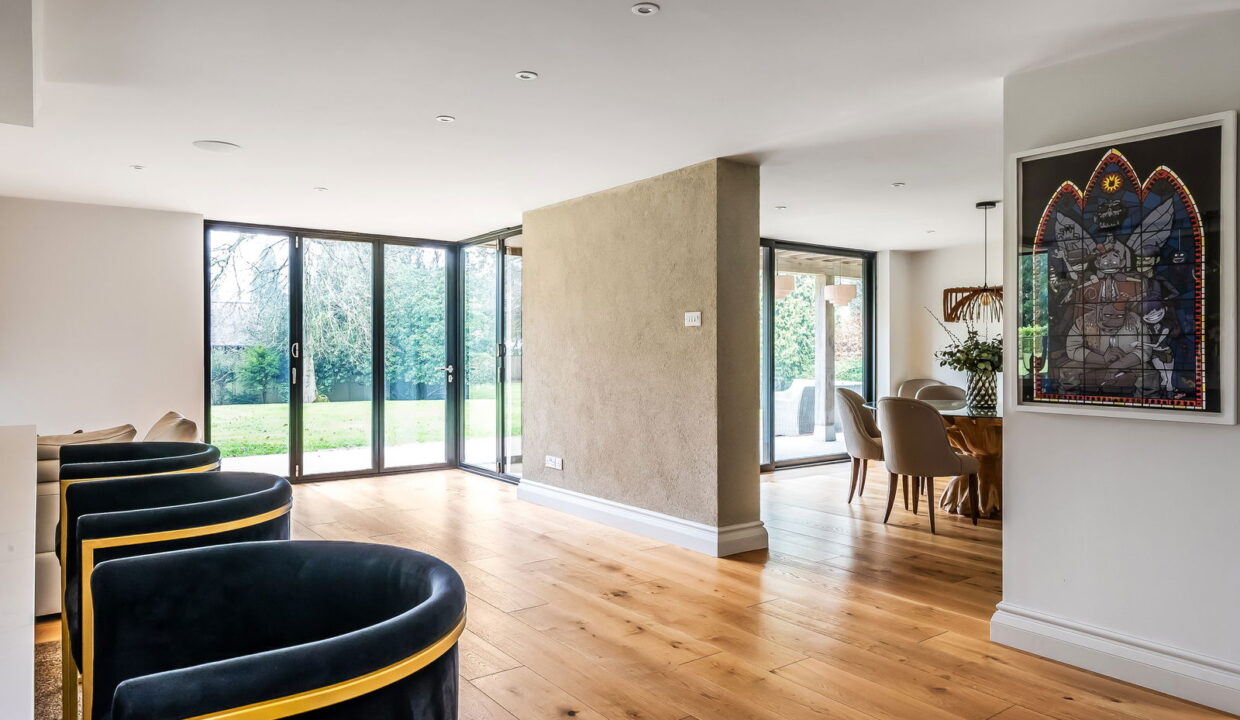 • Outstanding Kitchen/Family Room – Tastefully designed bespoke handmade kitchen with large island finished with Quartz worktop, incorporating inset sink, induction hob and adjacent bar. The flooring specification in this room is another feature – engineered oak is bordered with a brass inlay then finished with a resin floor. Bi-fold doors provide large areas of glass, bringing the outside gardens ‘inside’.