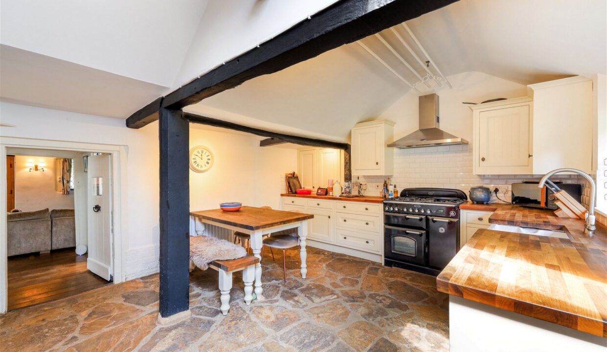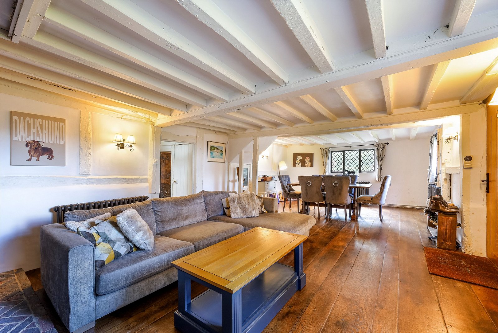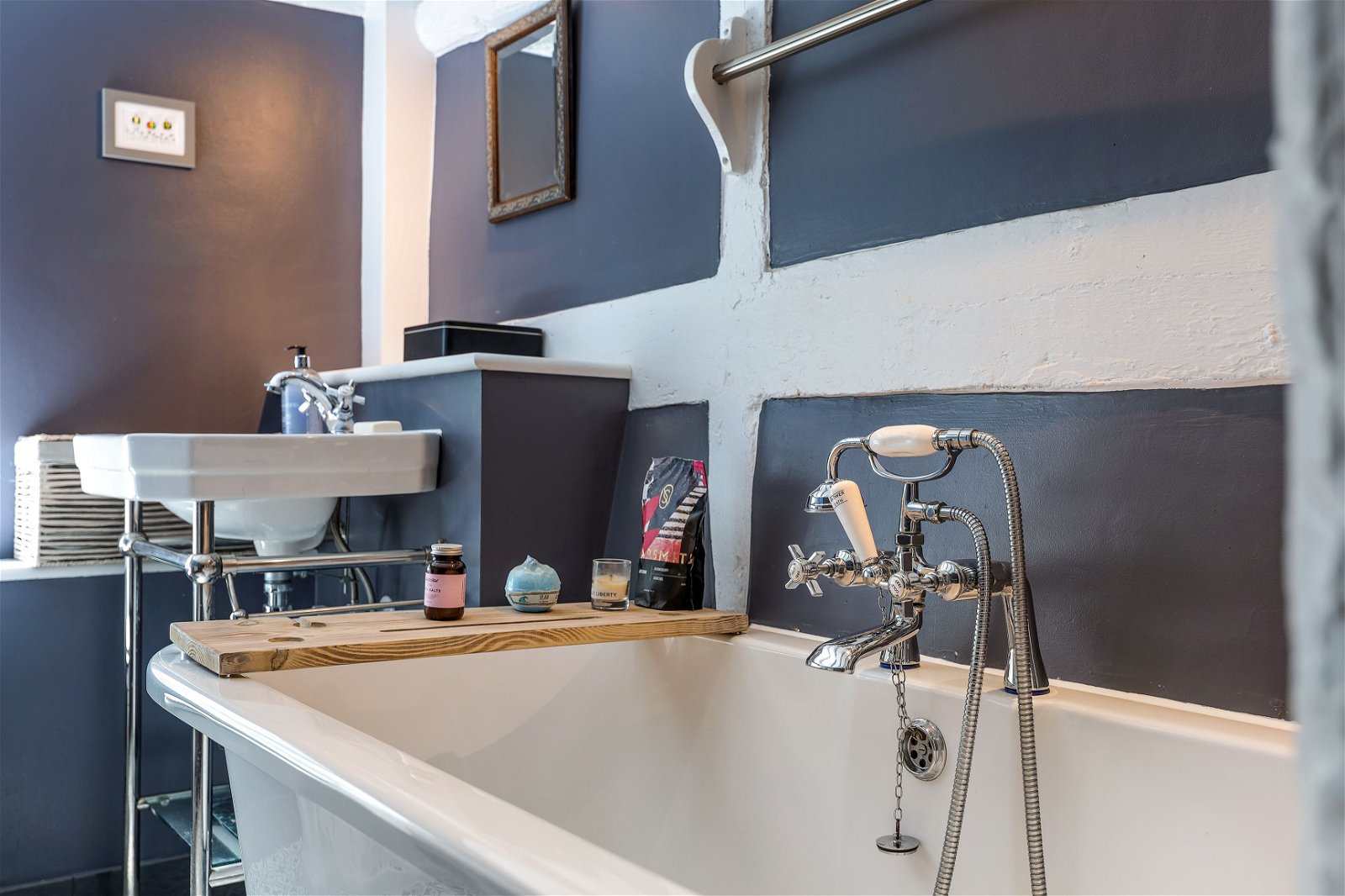 The double aspect Reception/Dining Room with exposed beams, wooden floorboards and stunning inglenook fireplace with wood burner. An attractive Shaker-style kitchen incorporates a butler sink, integrated dishwasher, range cooker, stone tiled floor and pantry. The adjoining utility room has space for a washing machine and fridge/freezer. The extended downstairs bedroom is bright and airy with light coloured beams, wooden floor, vaulted ceiling, bespoke oak bookcase and triple aspect double doors to the garden. The ensuite wet room features underfloor heating, shower, wash basin and w.c. For additional flexibility, the study could also be used as an extra bedroom. A recently refitted family bathroom with freestanding Victorian style bath and underfloor heating completes the downstairs accommodation.