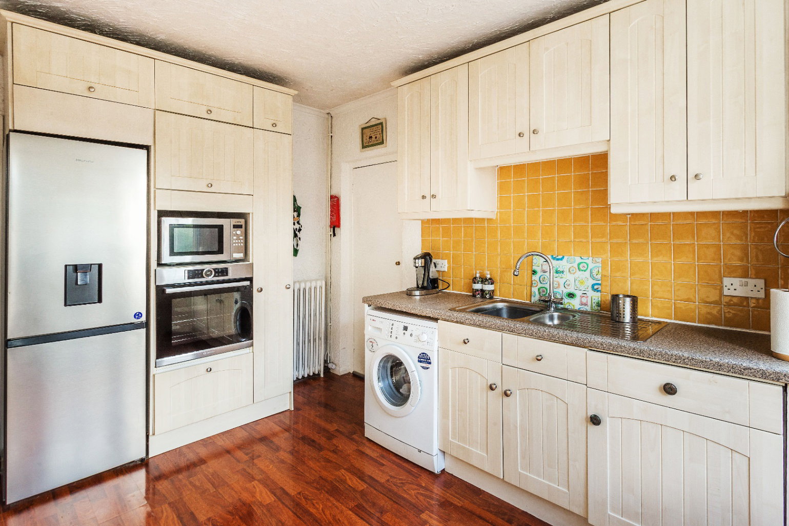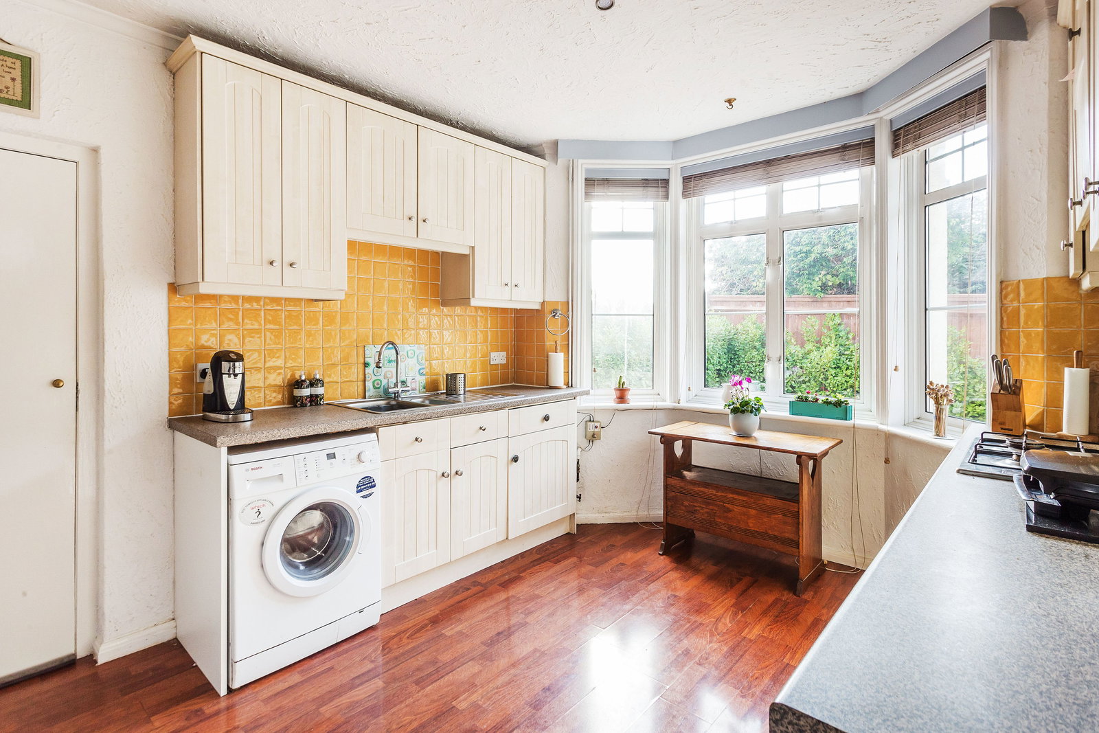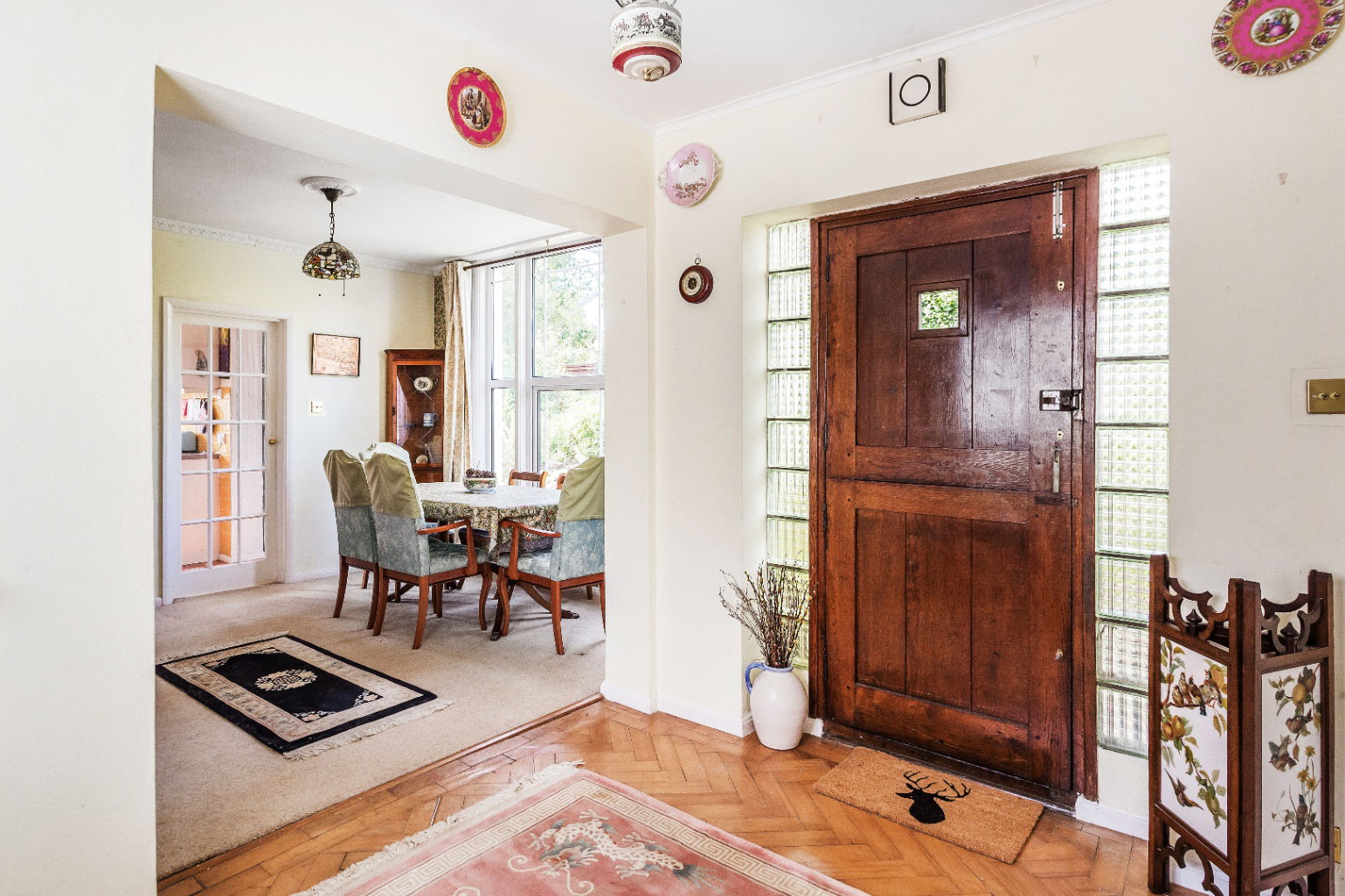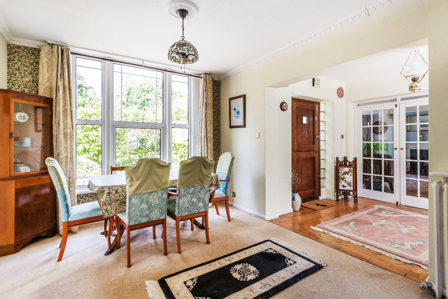 The property is entered via an impressive period oak door, opening into a welcoming reception hall. From here, the dining room and kitchen are positioned to the right, while the sitting room lies to the left. The dining room is generously proportioned and benefits from large picture windows overlooking the garden. The kitchen features a bay window to the front, along with a range of base and eye-level units and a fitted electric oven. A spacious pantry provides additional storage, and a door offers direct access to the garden.