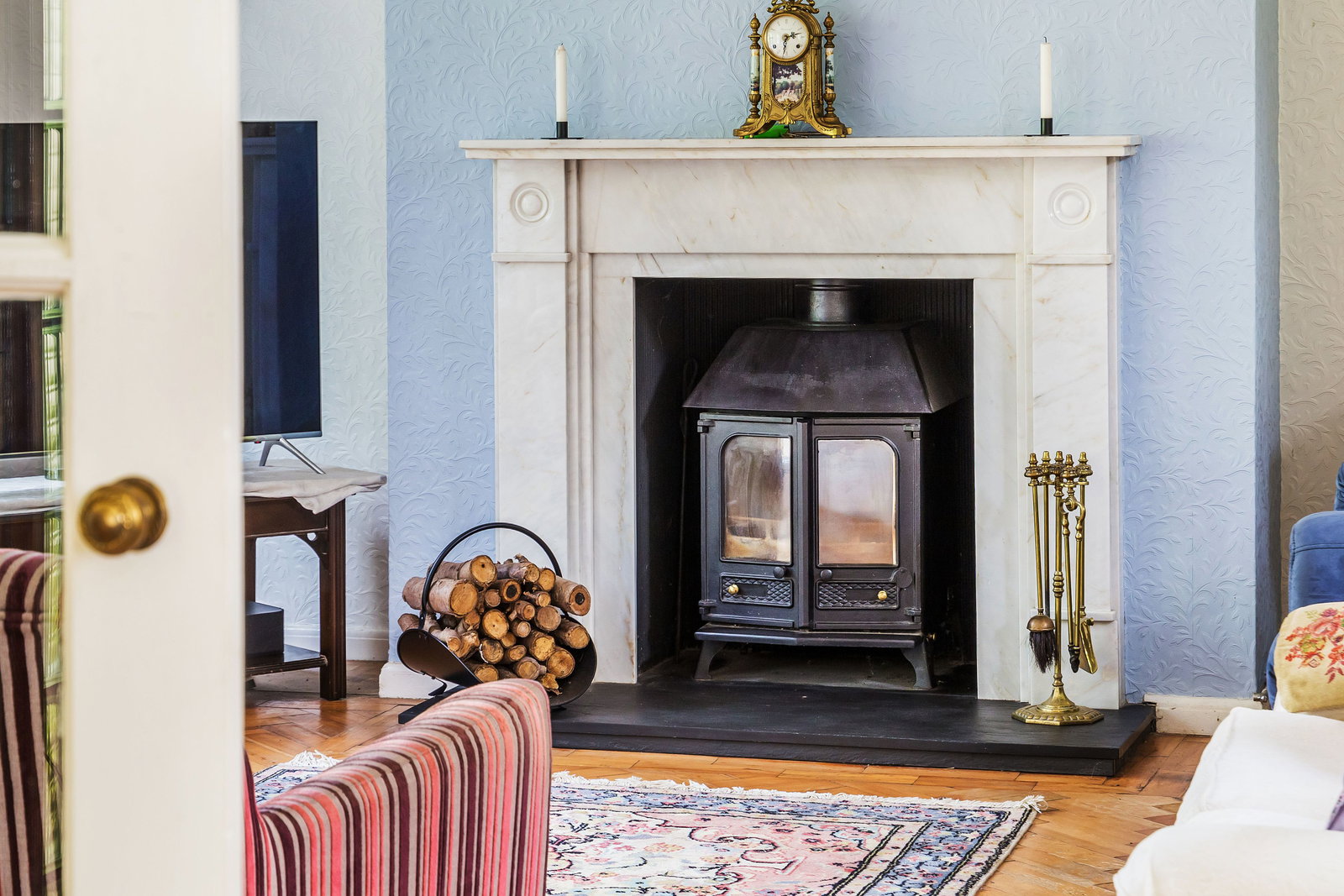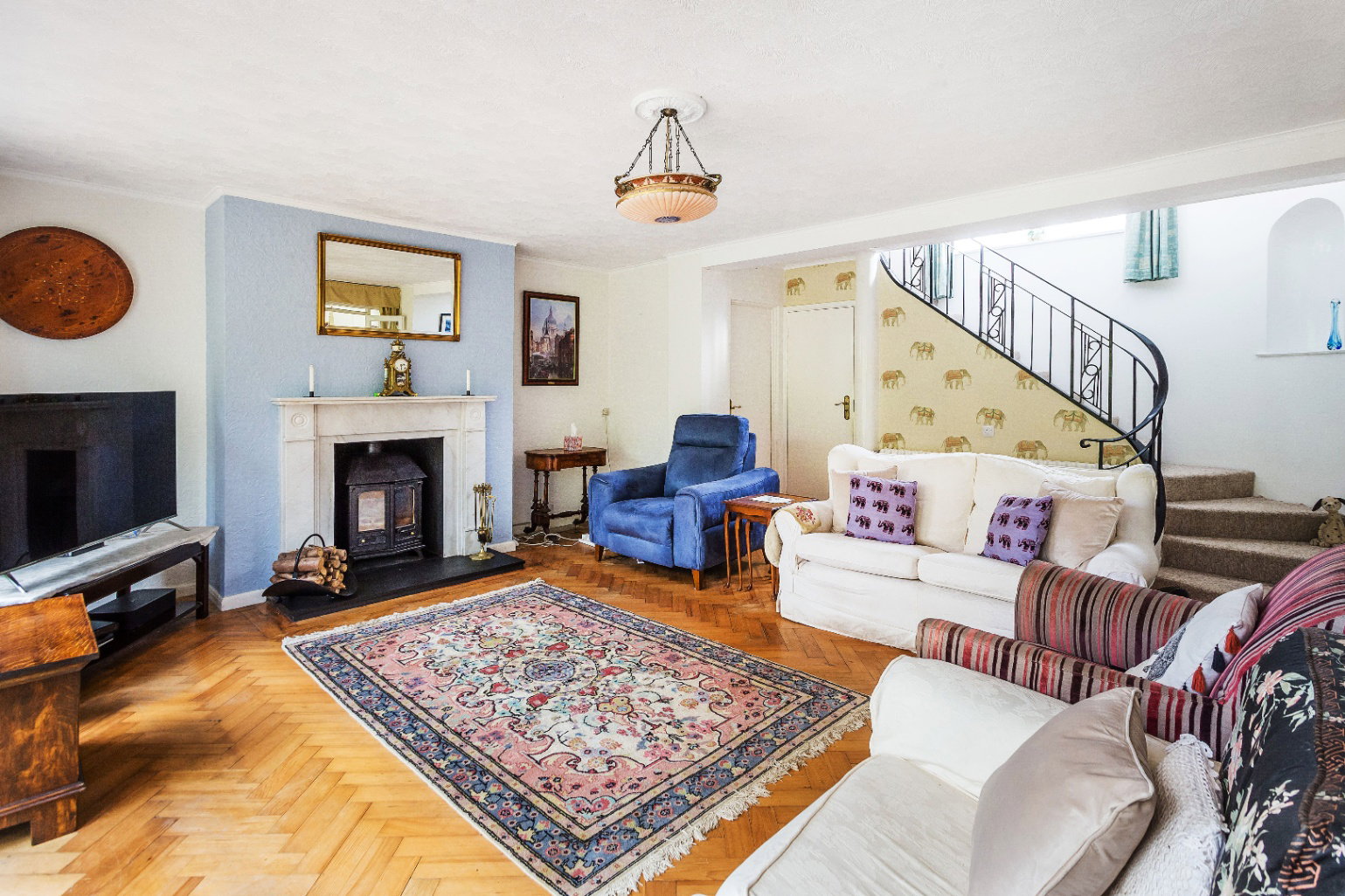 Returning to the reception hall, there is access to a downstairs cloakroom and the main living room. The living room is bright and spacious, with floor-to-ceiling windows, a feature log-burning stove, and attractive views over the garden. A striking staircase to the first floor is also located here. The ground floor further comprises a shower room and a corridor leading to the principal bedroom, which is particularly spacious and benefits from a generous en suite bathroom with a bath. The bedroom also provides access to the conservatory.