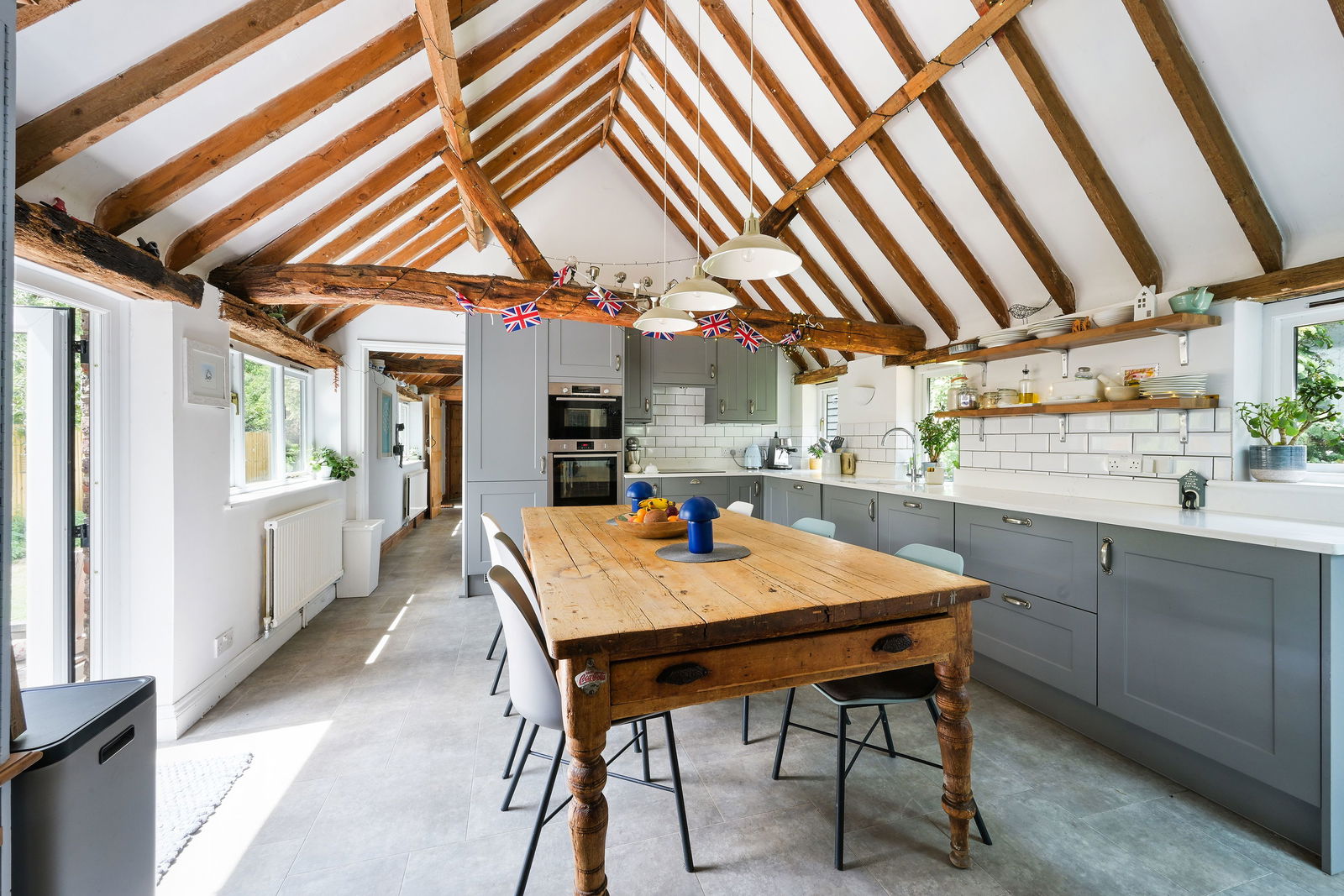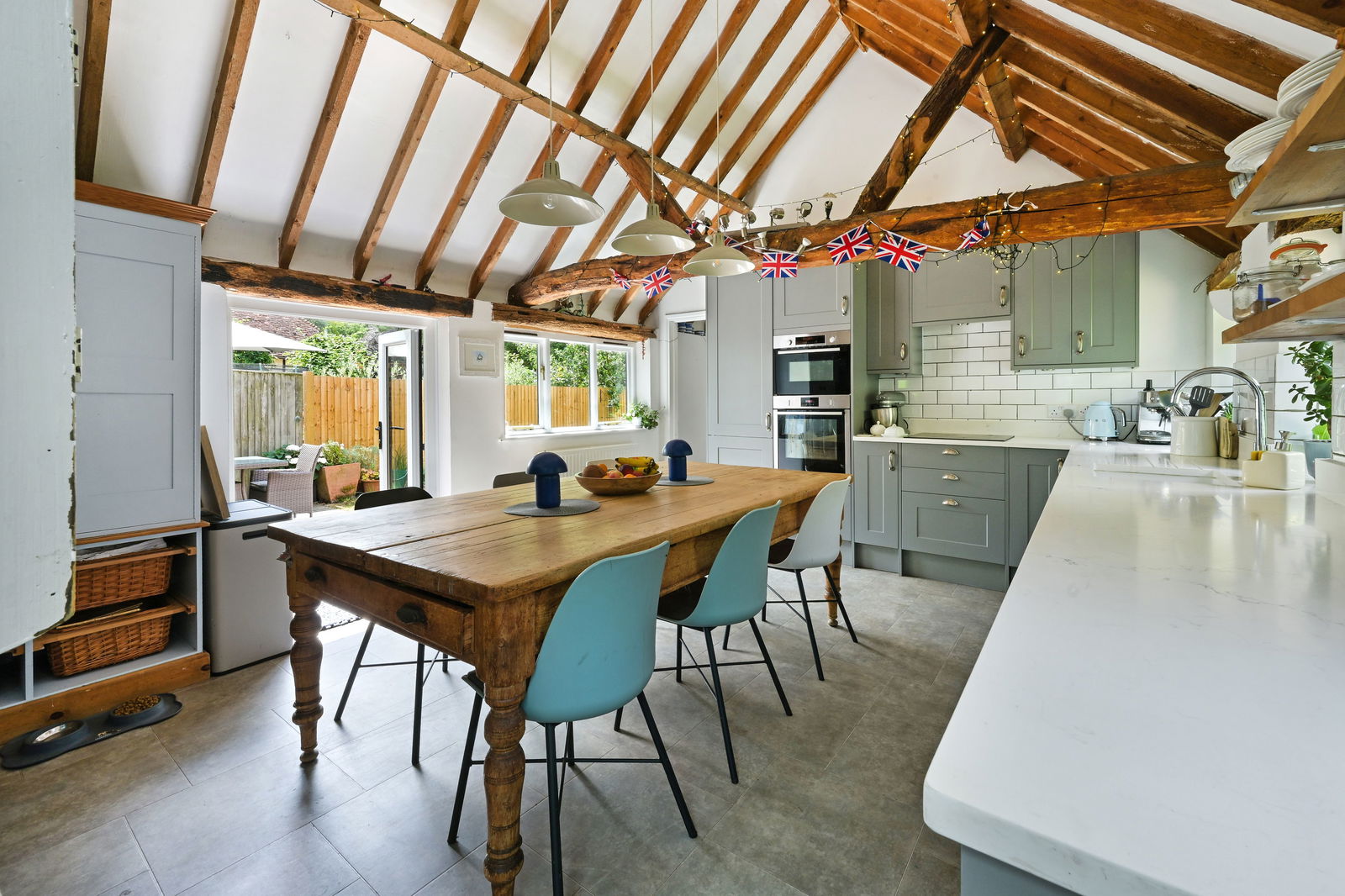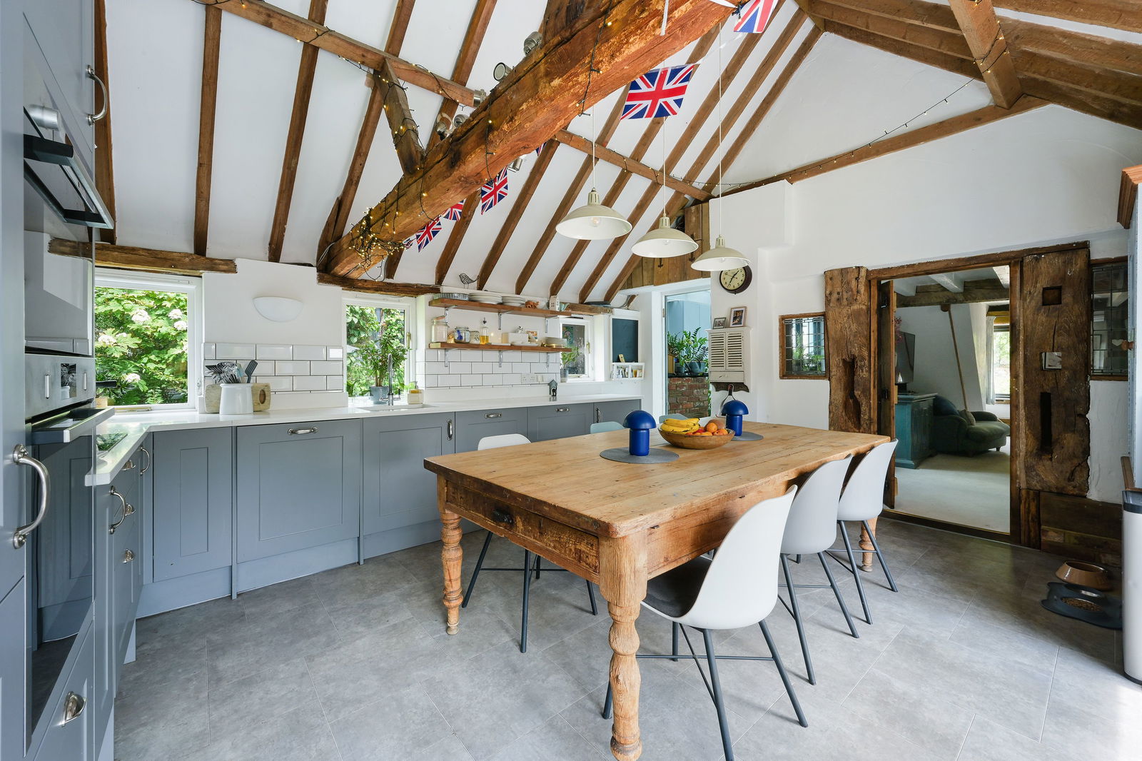 The open-plan kitchen flows into a bright dining area with ample space for entertaining. Adjacent sits a character-rich, dual-aspect sitting room anchored by an impressive inglenook fireplace with open hearth, a cosy centrepiece for relaxing evenings.