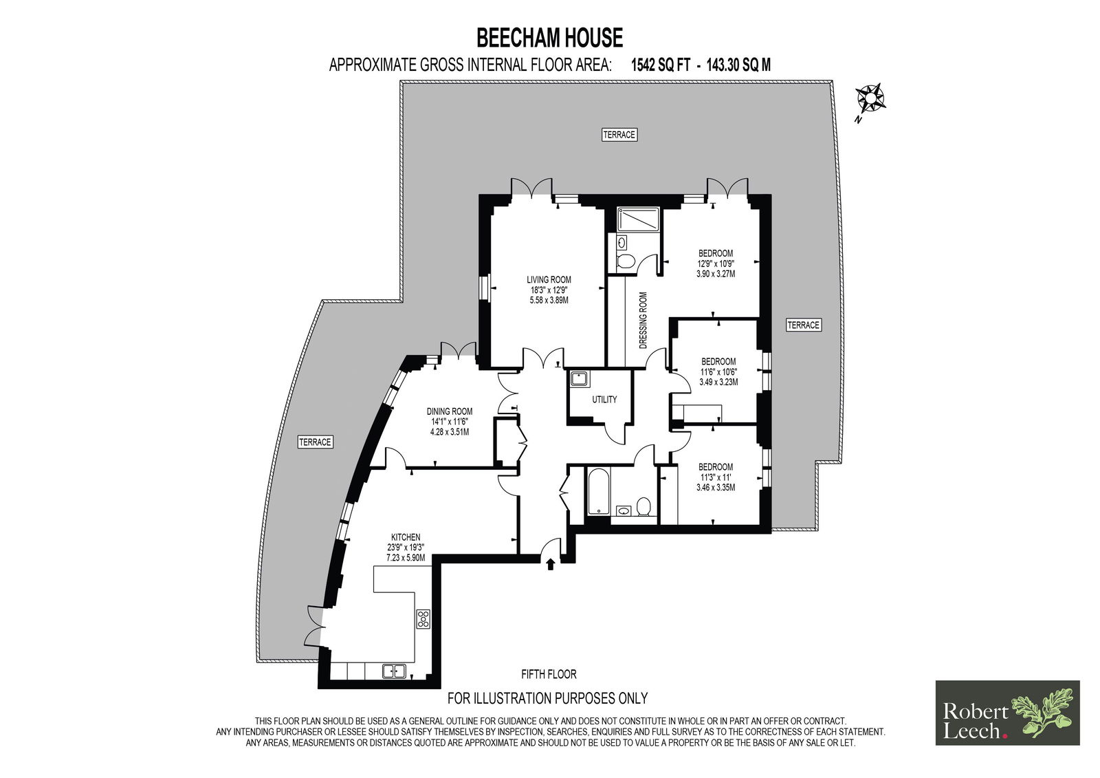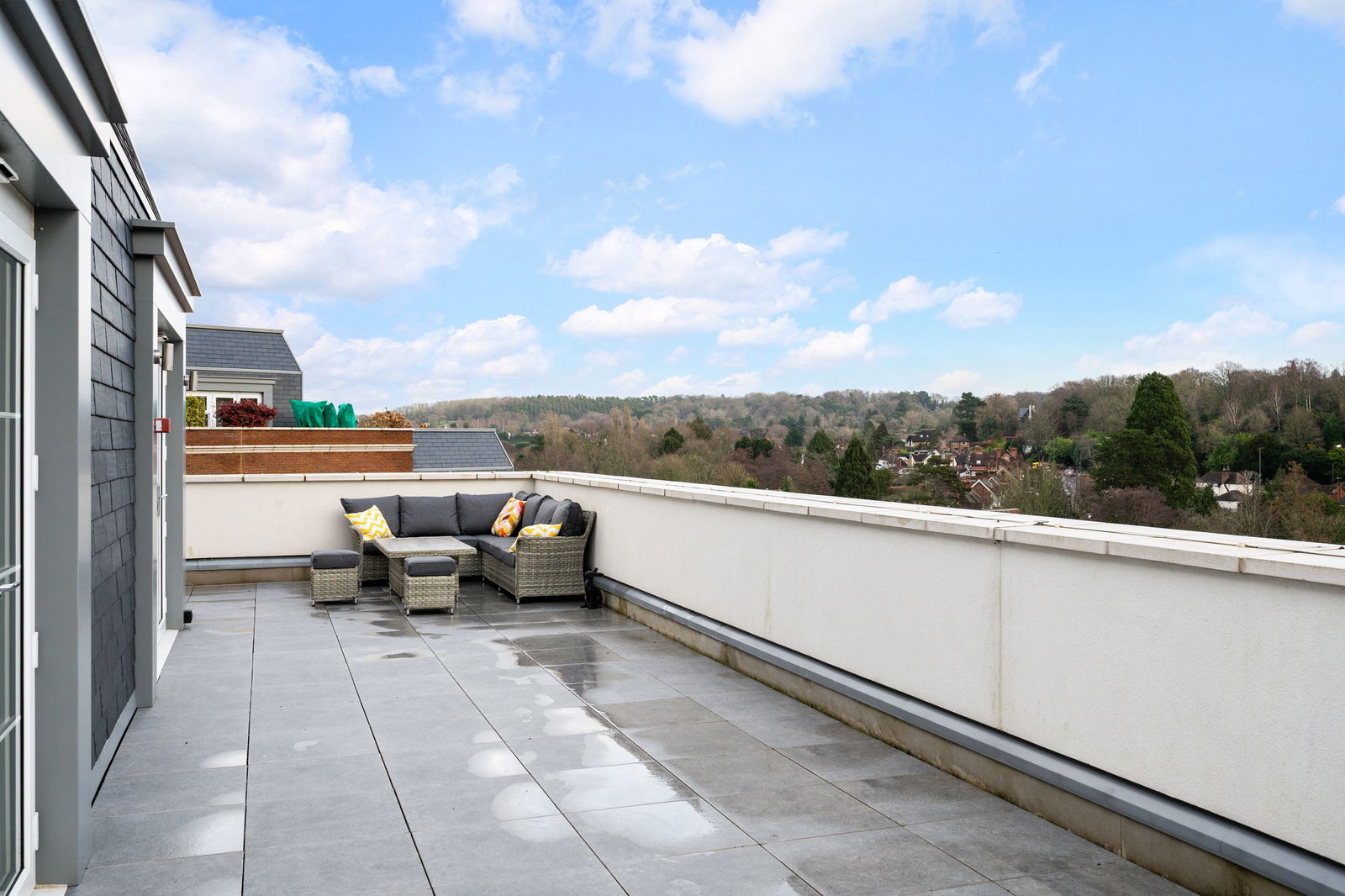 A large private terrace with 360 degree views, which is accessed via all principal rooms. It further benefits from stunning views over the beautiful communal gardens with seating areas, fountain and visitors parking bays.