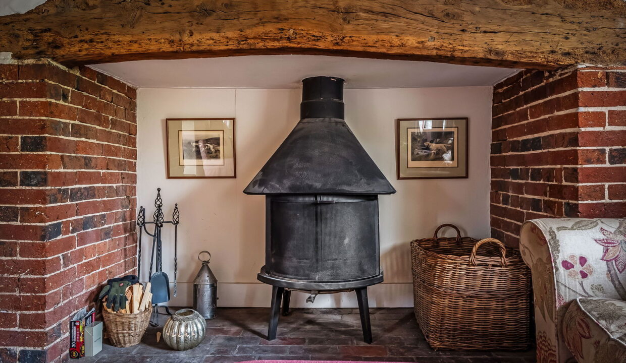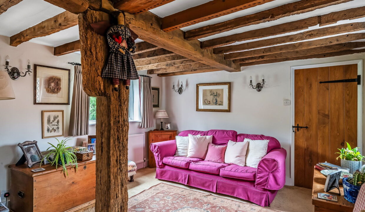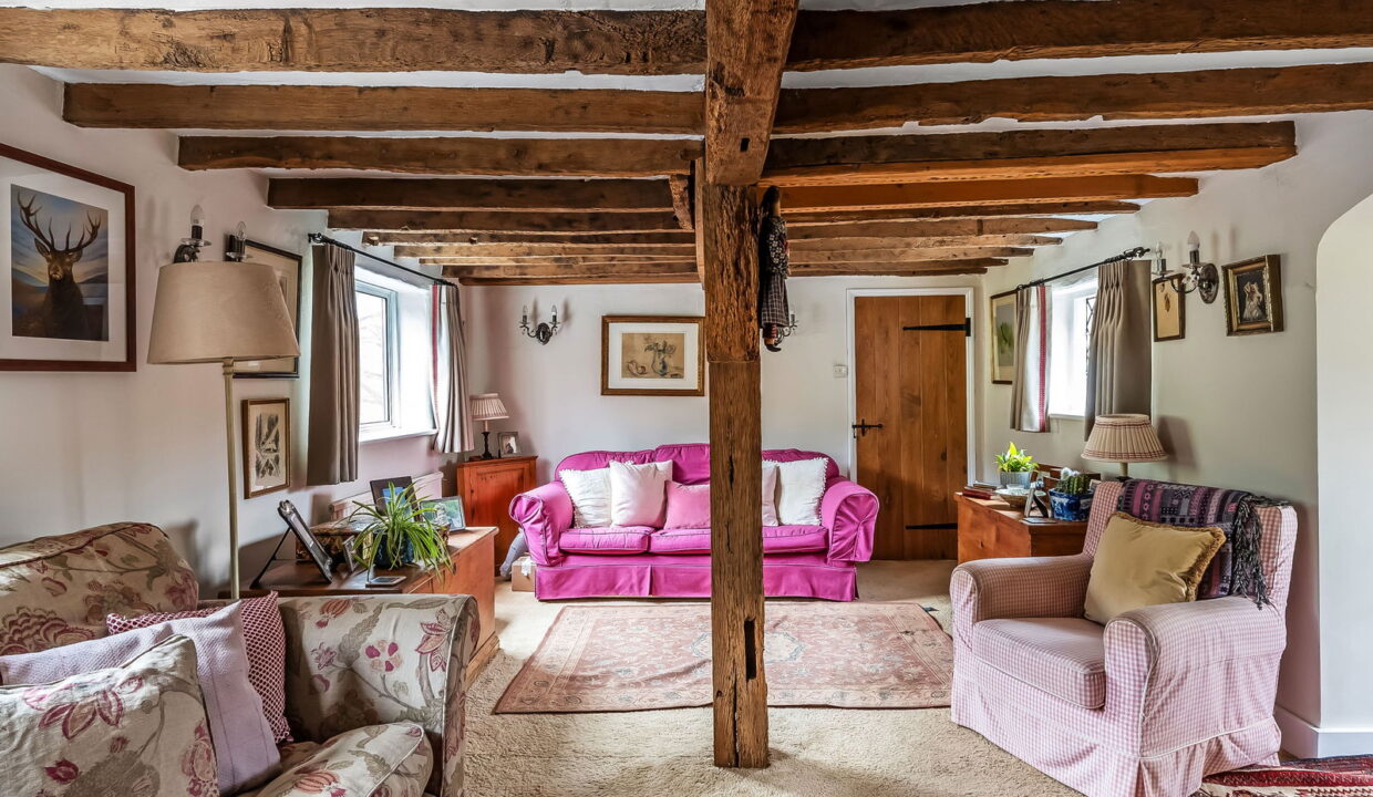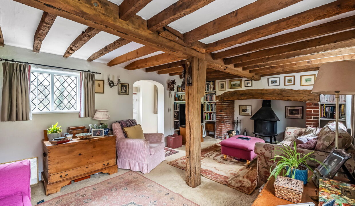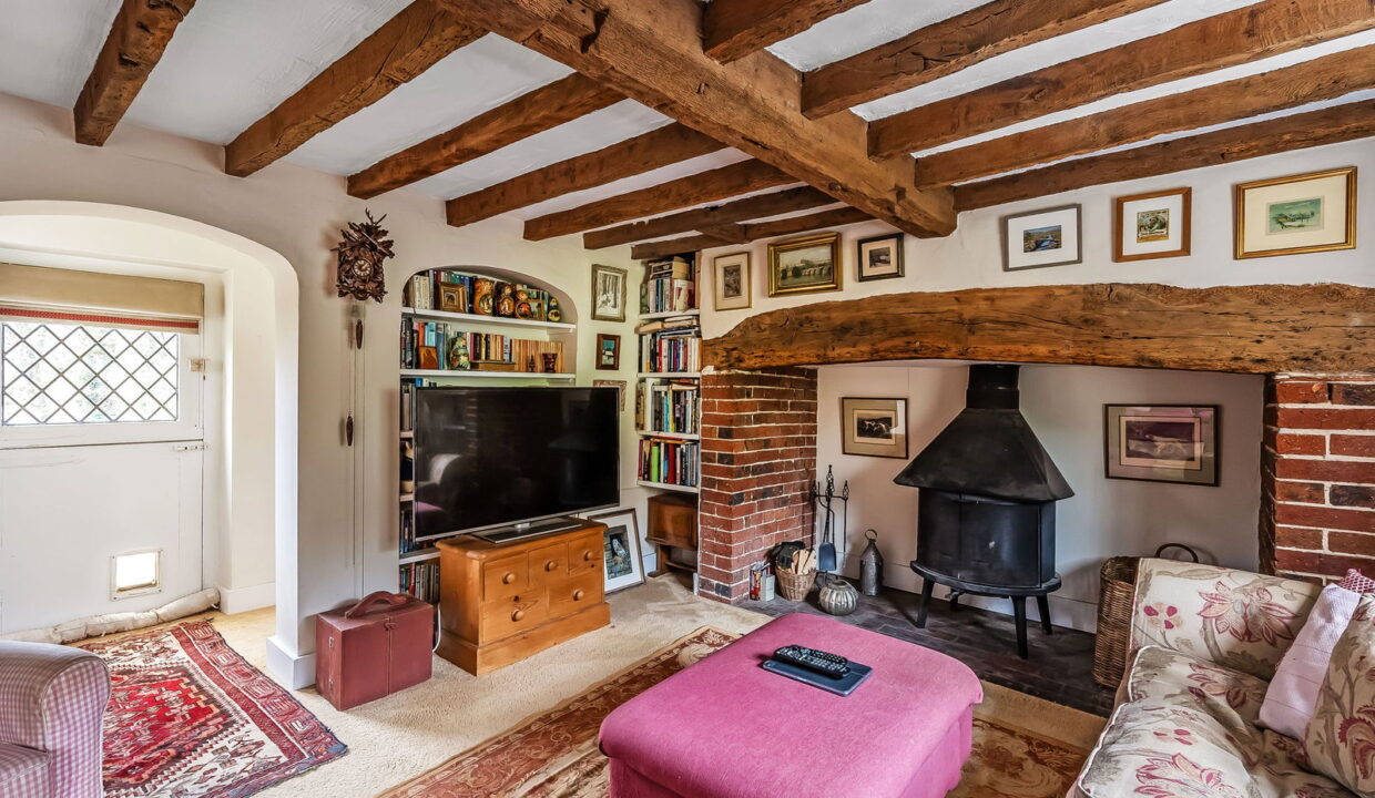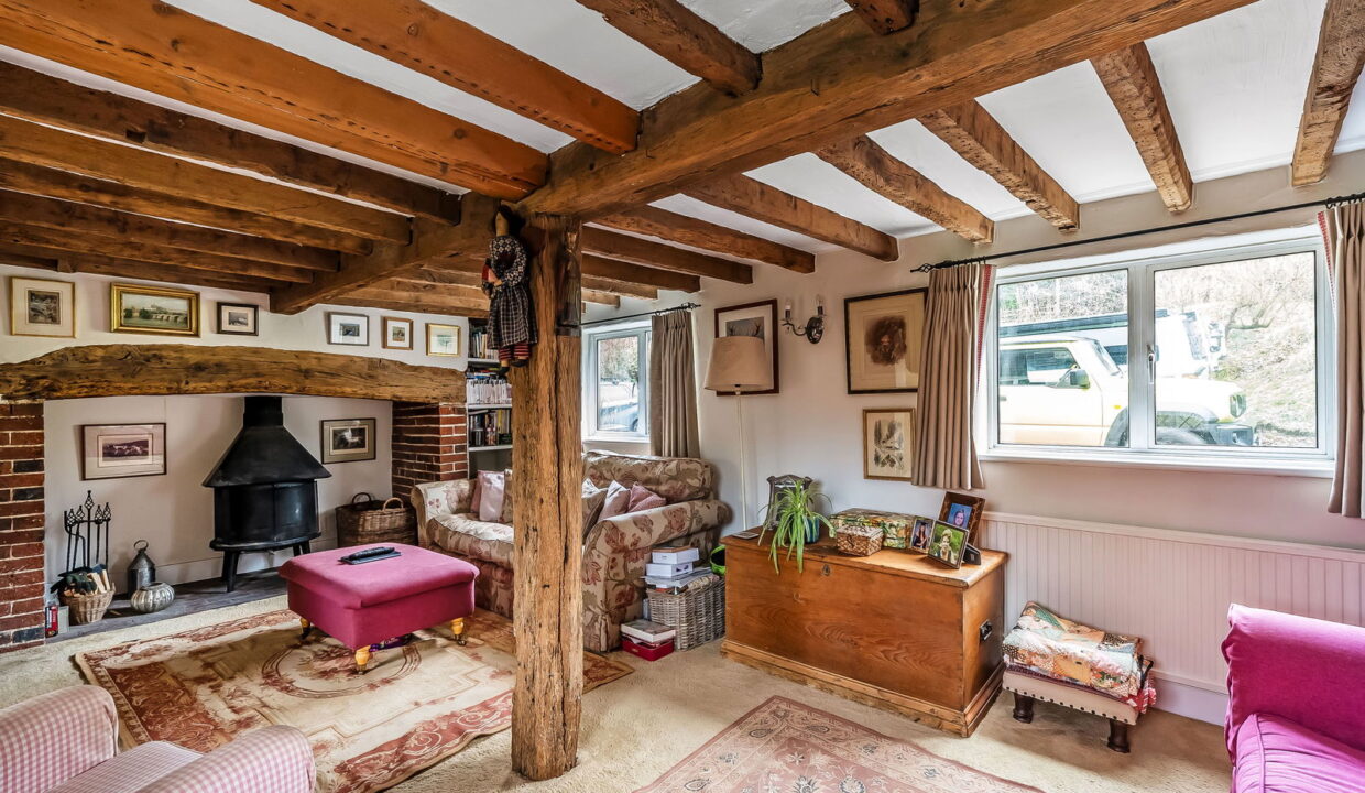 -Impressive Double Aspect Sitting Room. Heavy exposed ceiling timbers, inglenook fireplace with woodburning stove, door to: