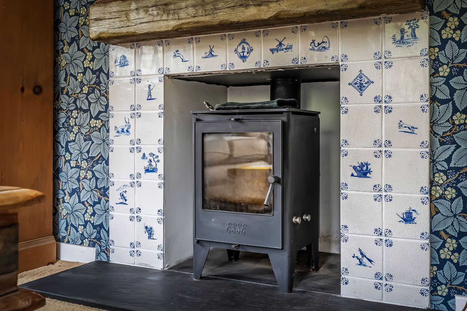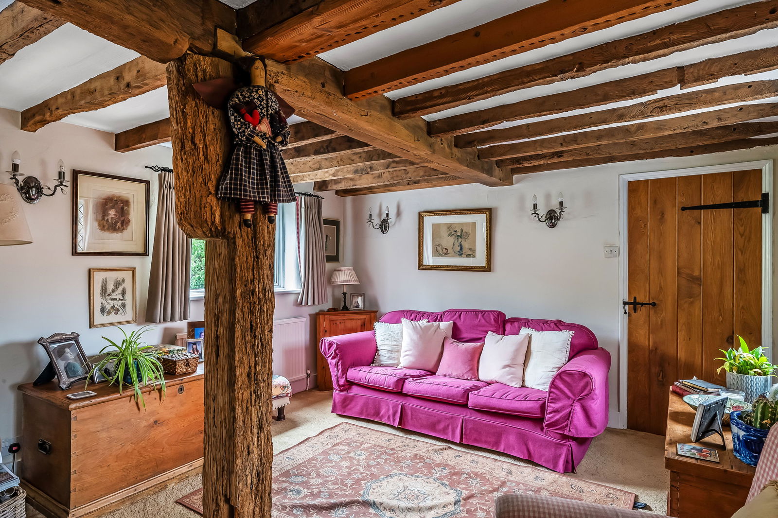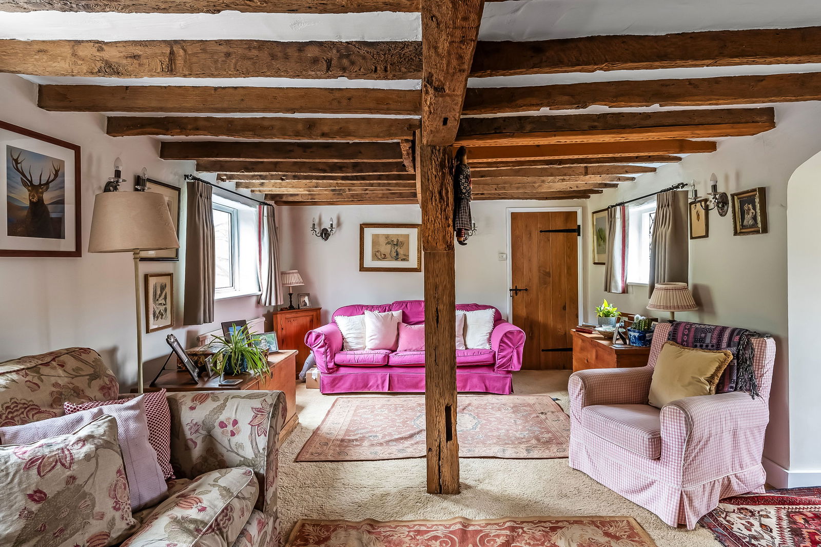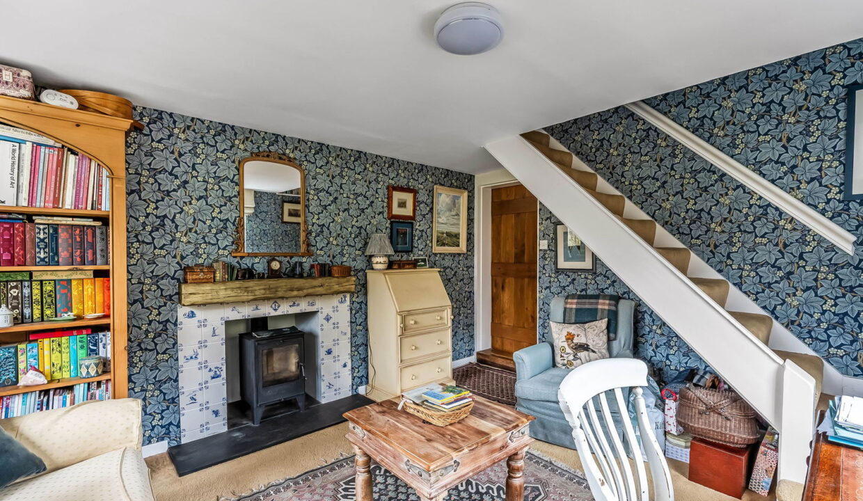 -Impressive Double Aspect Sitting Room. Heavy exposed ceiling timbers, inglenook fireplace with woodburning stove, door to: