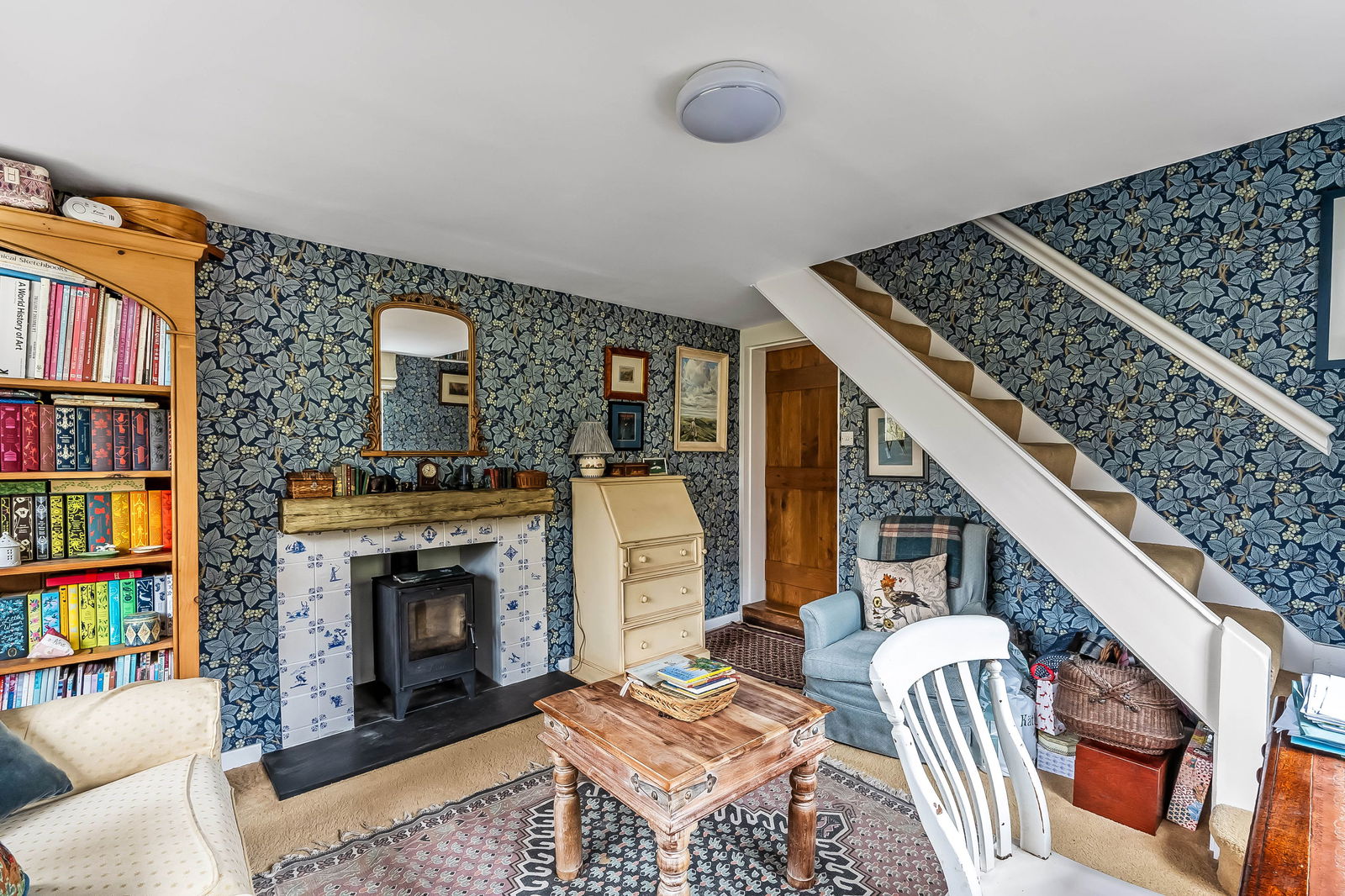 -Delightful Double Aspect Study. Fireplace with woodburning stove, door to garden, staircase to: