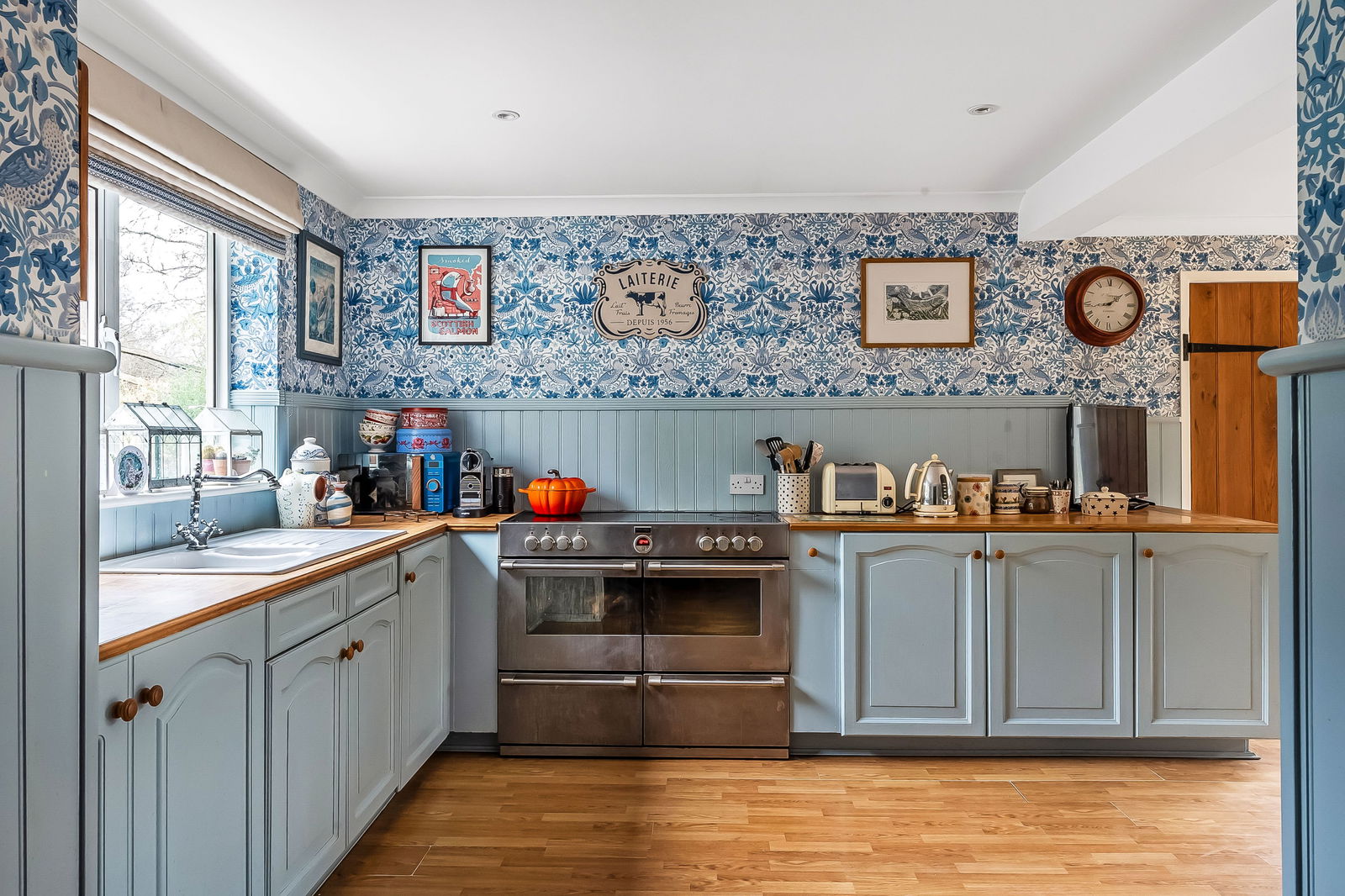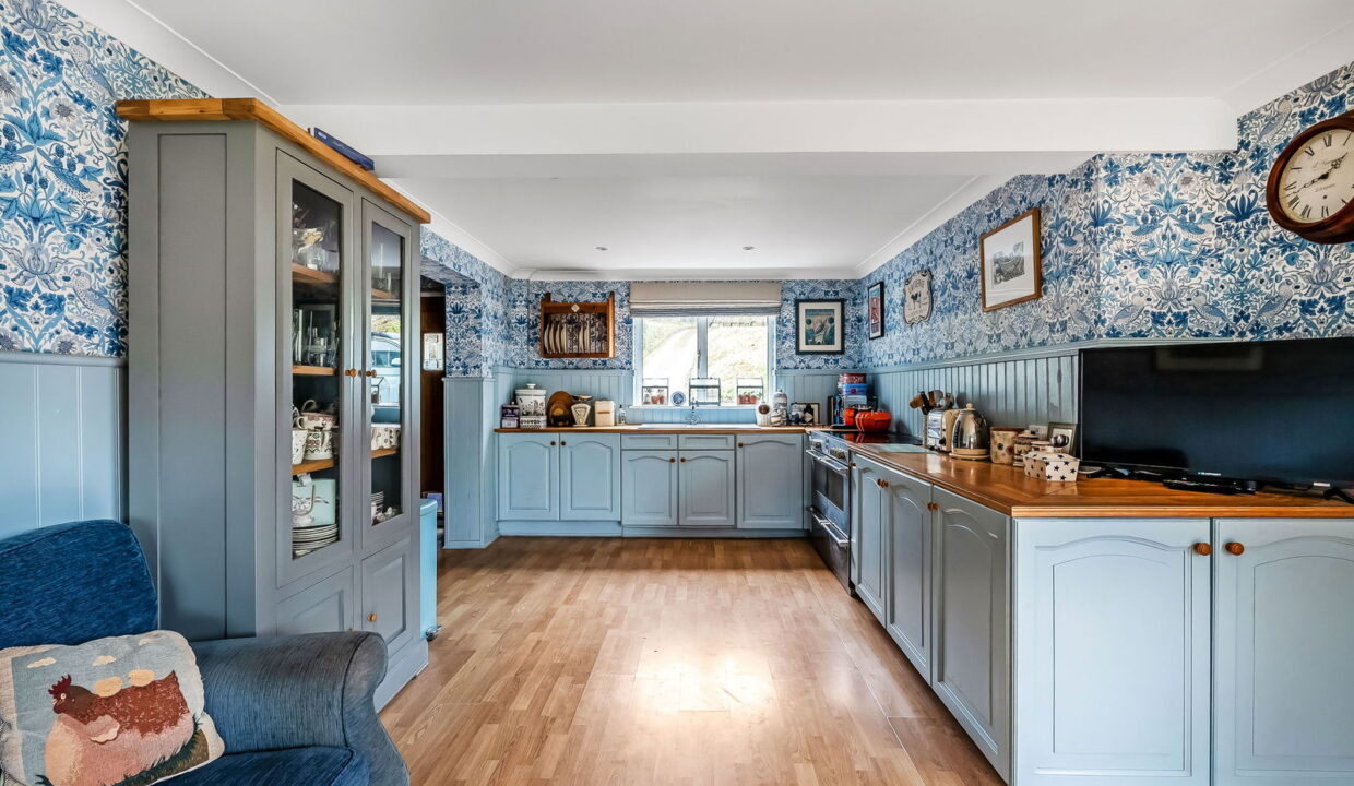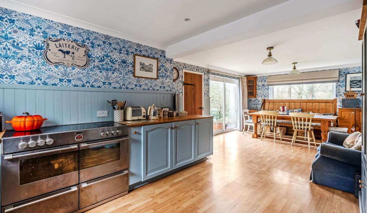-Triple Aspect Farmhouse style Kitchen/Dining Room. Extensive range of timber working surfaces with cupboards and draws below, equipment space, double sliding patio doors to garden.