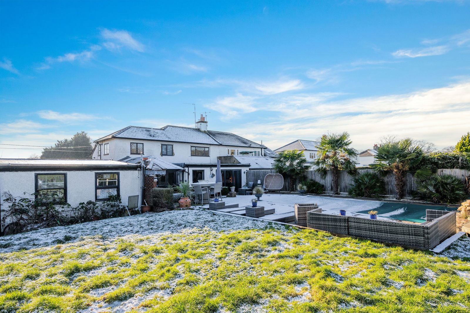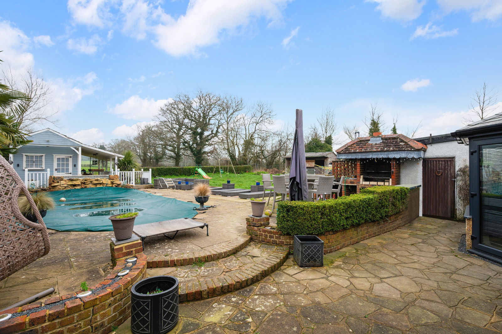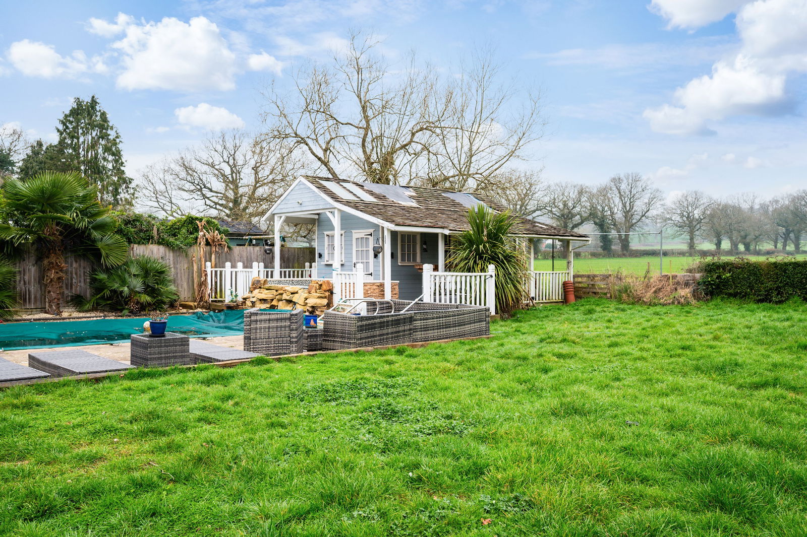 Outside you are greeted by a fabulous swimming pool which has recently been replaced, and a separate hot tub. The pool is heated via an air source heat pump/solar energy, and is all fully automated, controllable via your phone. Changing rooms are also located behind for easy use. The rest of the garden is mainly laid to lawn with a patio area, decking around the summer house, a built in firepit , feature outdoor lighting – perfect for entertaining. The plot extends to almost 1/3 of an acre, with the added benefit of a double garage, wood store and driveway.