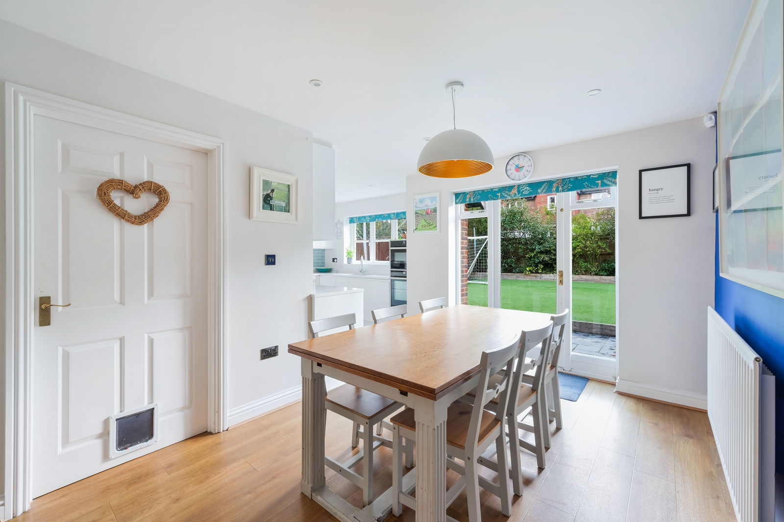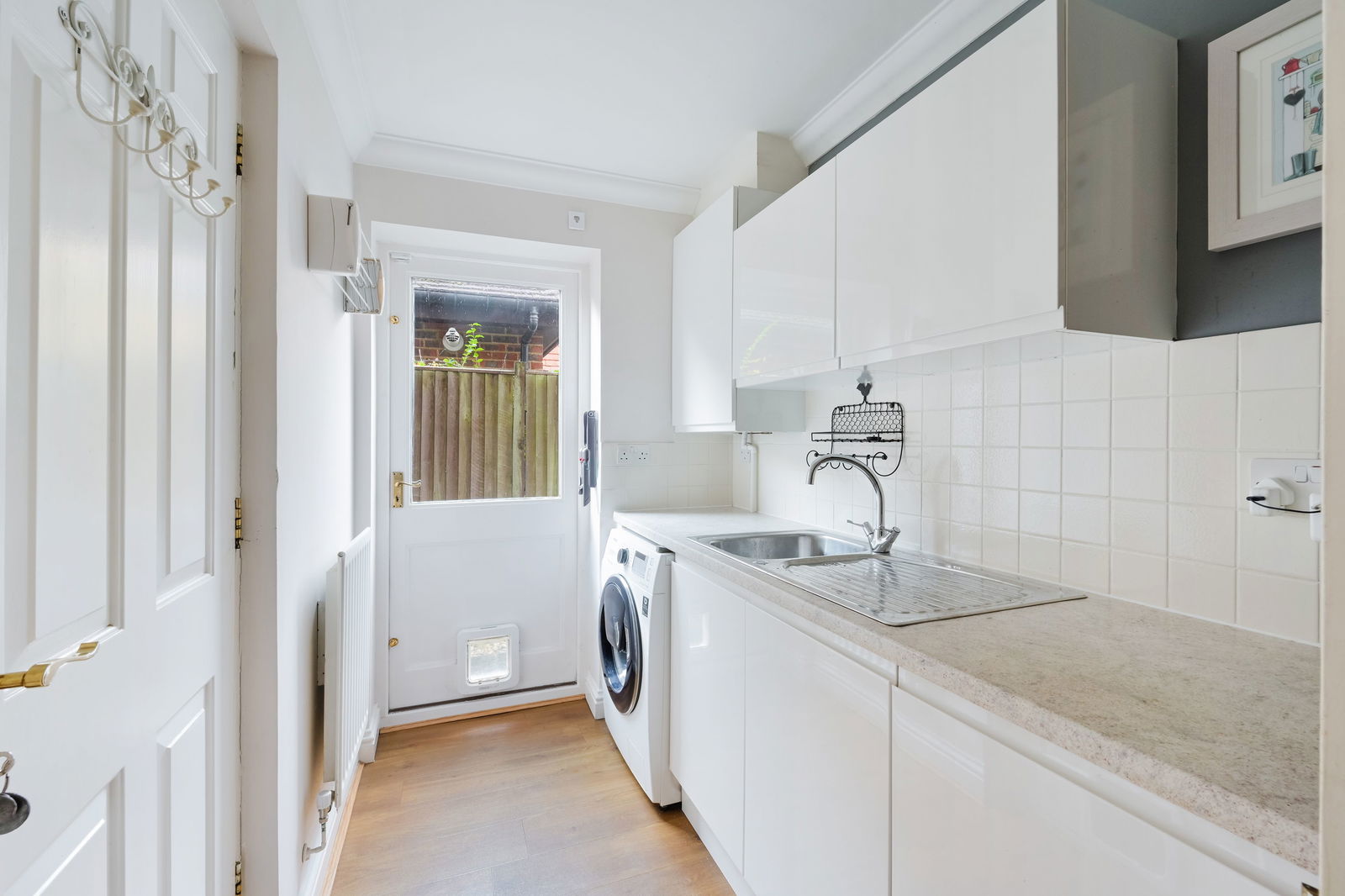 The spacious kitchen/dining area with Antico flooring, is perfect for cooking and gathering, offering a modern matching range of wall and base units, generous work surfaces, modern metro tiles, a one-and-a-half bowl sink with mixer tap. Built in appliances include fridge, dishwasher, eye level double Neff electric double oven and induction hob. Flowing from the kitchen the dining area continues and enjoys plenty of natural light with a double-glazed door and window to the garden. The utility room provides practical workspace with base units, a single drainer sink with mixer tap, space for a washing machine and tumble dryer, and doors leading to both the garage and to the side of the property.