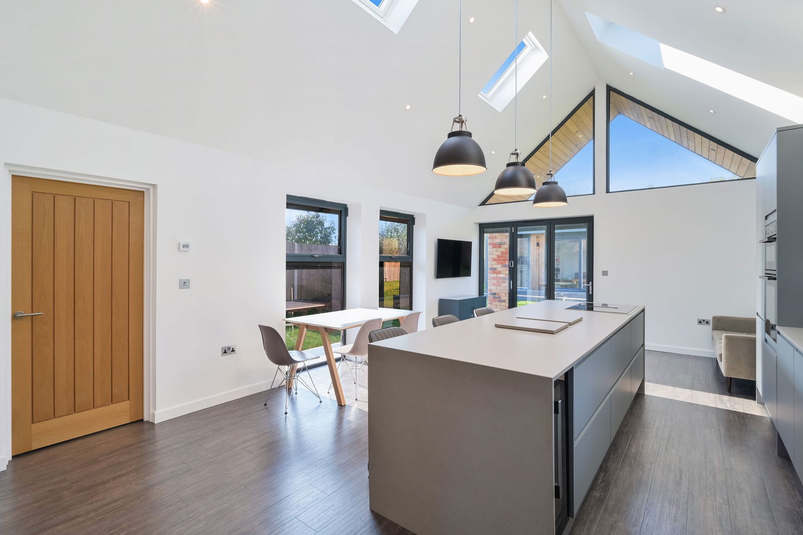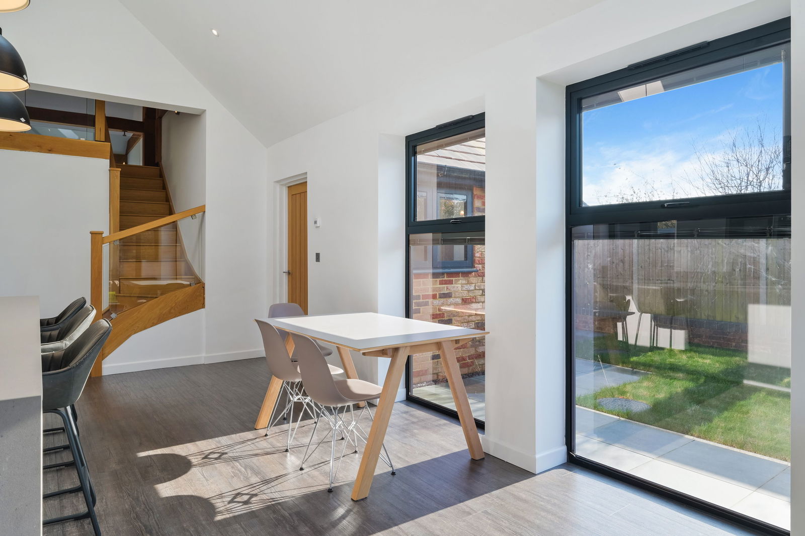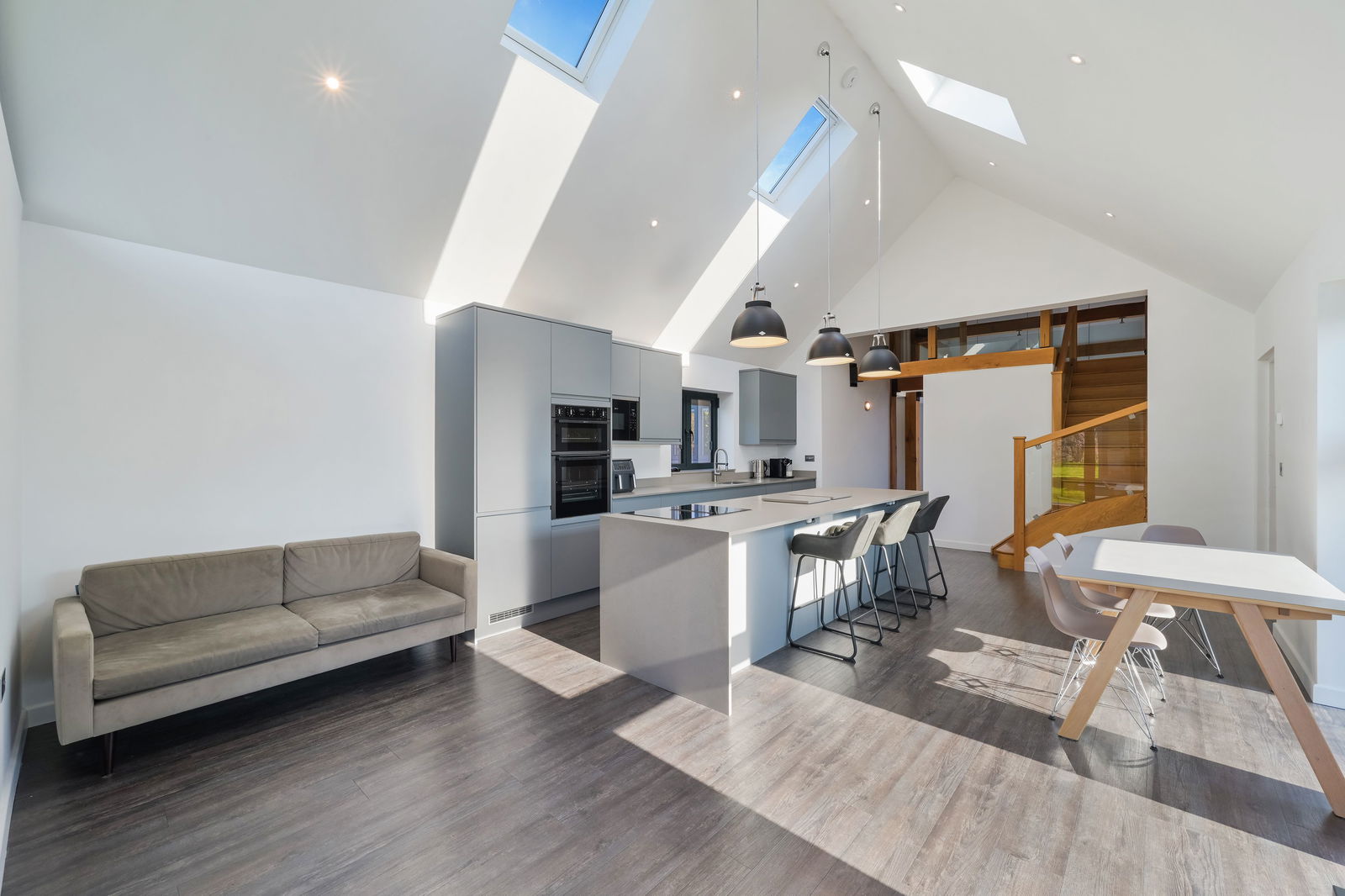 Architectural interest and industrial pendants provide a refined industrial accent, while exposed oak beams and a suspended first-floor glass walkway frame a dramatic double-height vaulted ceiling above the kitchen/ dining area. Floor-to-ceiling glazing floods the space with natural light and offers uninterrupted views over the garden, perfectly mirroring the barn’s architectural symmetry.