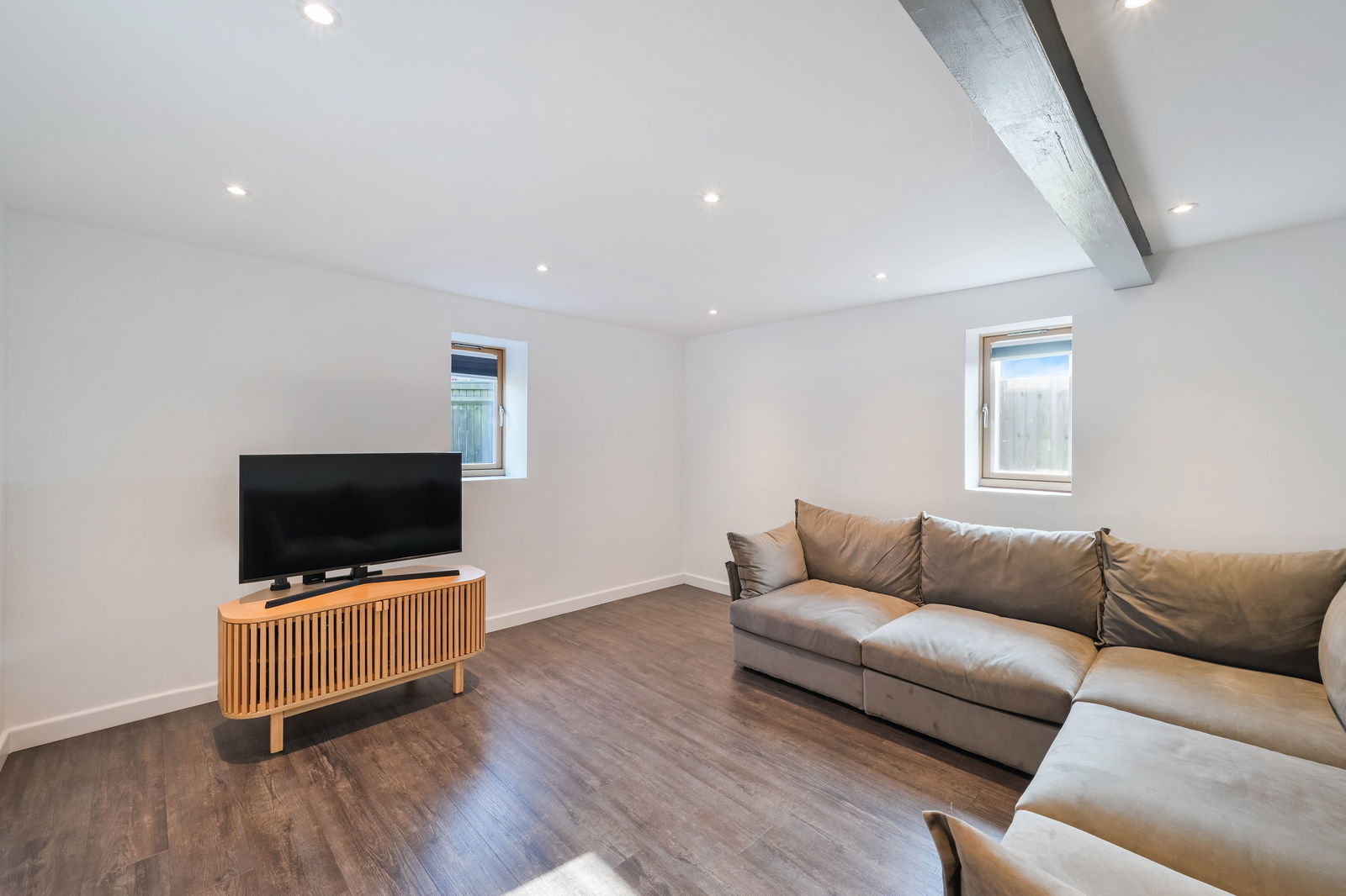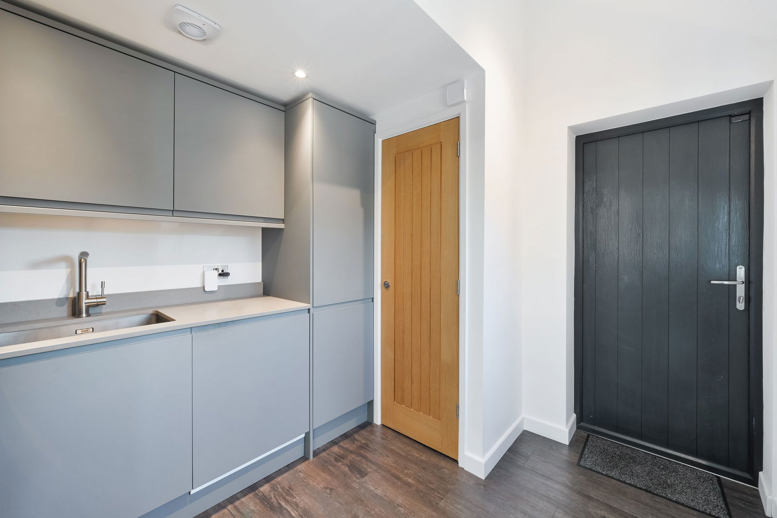 The bespoke kitchen combines timeless craftsmanship with high-specification finishes, featuring sleek grey wall and base units complemented by bespoke worktops and a franke sink with Villeroy and Boch ware. Premium integrated appliances include a Neff double oven with Neff Induction hob, Neff microwave, Bosch Perfect Dry / Home Connect Dishwasher, built in fridge and wine fridge. Light fills the room from the Velux windows which you can open and close with a special APP plus modern bi fold doors, which open on to the garden have incorporated blinds. Adjoining the kitchen/diner the utility room includes a range of units, with space for a washing machine and tumble dryer and built in freezer. A cupboard houses the air source heat pump and water softener.