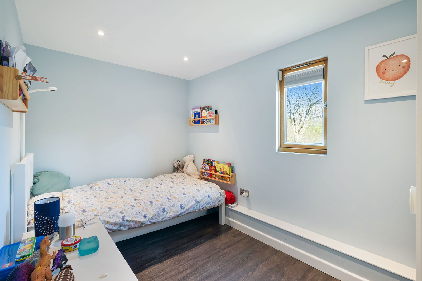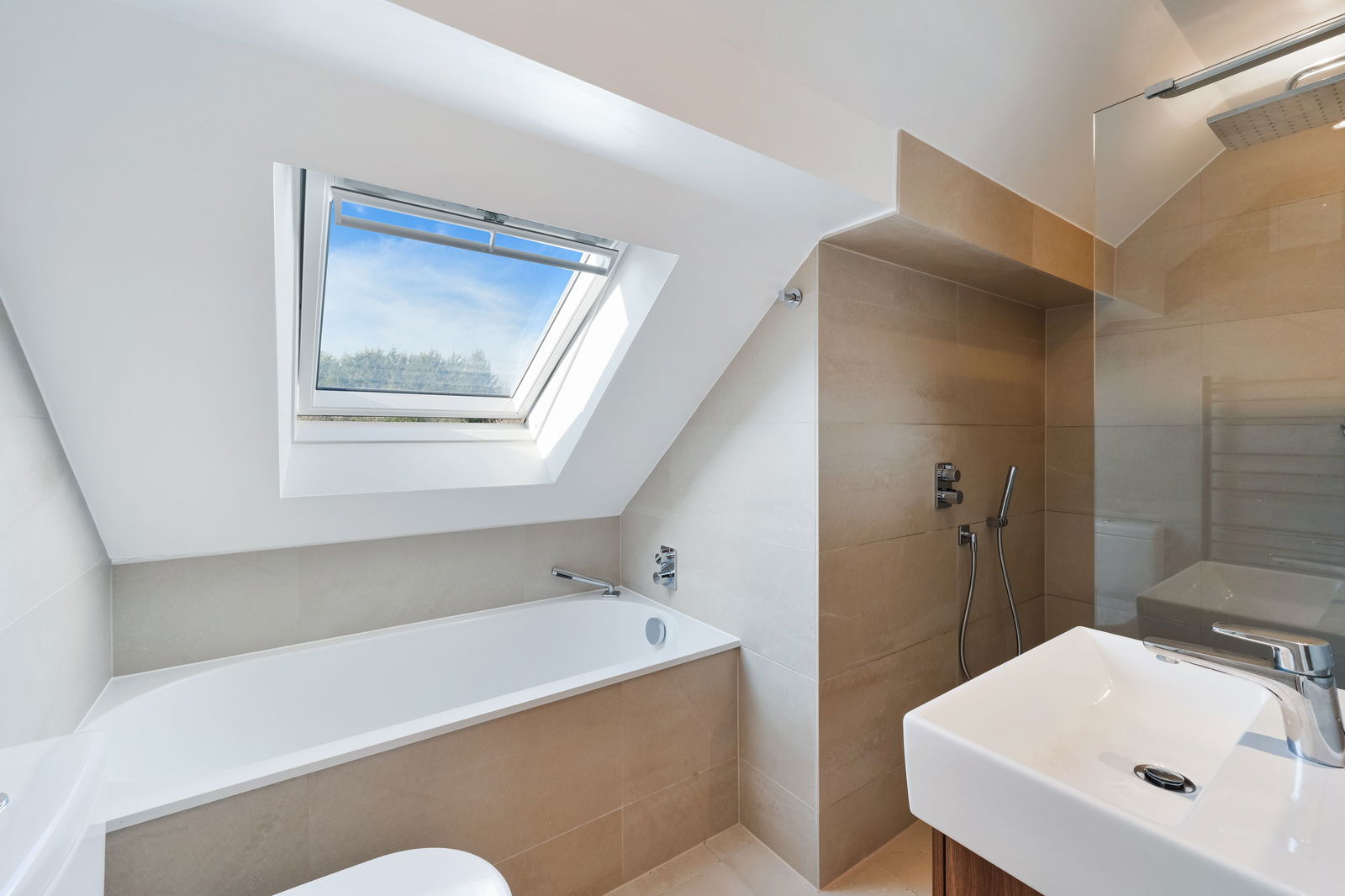 The principal bedroom is a serene retreat, featuring bespoke fitted wardrobes by John Lewis and a floor-to-ceiling window that frames delightful views. The en-suite wet room is elegantly finished with Villeroy & Boch tiles, sink and WC, complemented by Keuco chrome accessories and a Velux window for natural light.