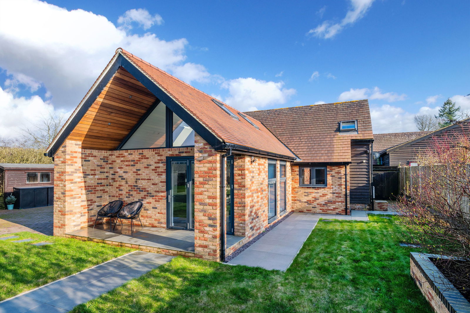 The rear garden is thoughtfully landscaped, featuring a porcelain patio —ideal for al fresco dining and entertaining. The remainder of the garden is laid to lawn, creating a generous and private outdoor space. Two garden sheds provide practical storage.