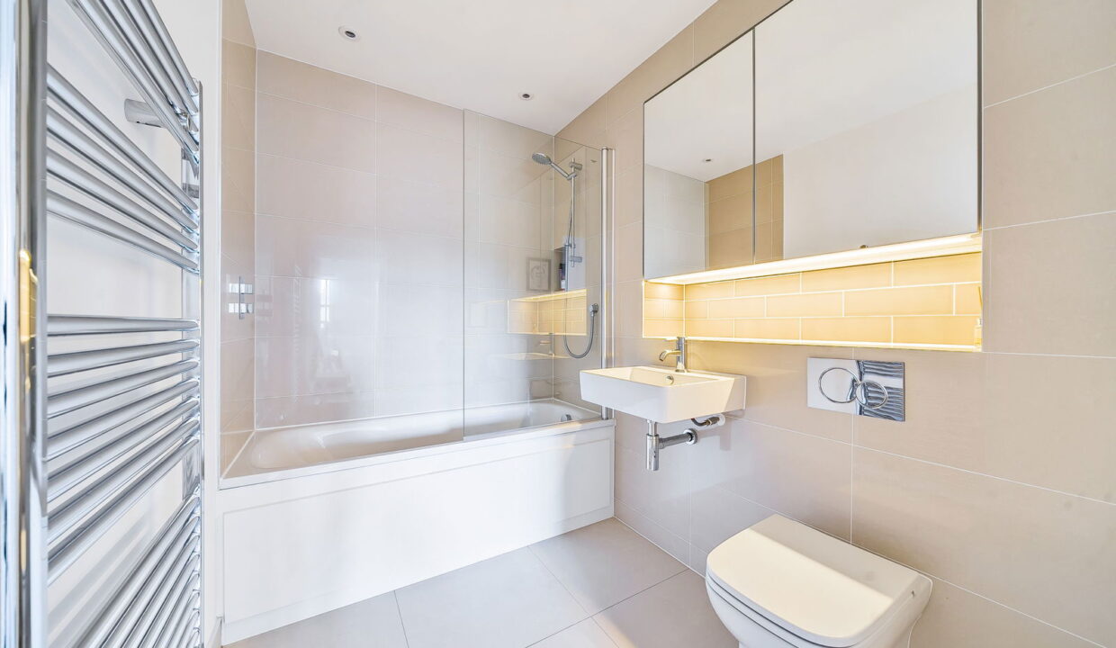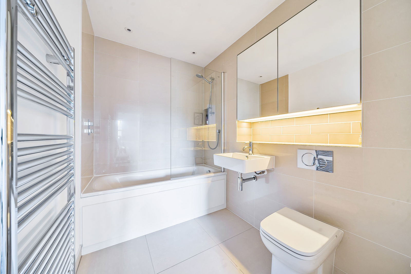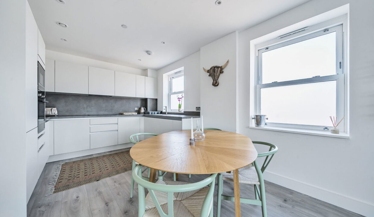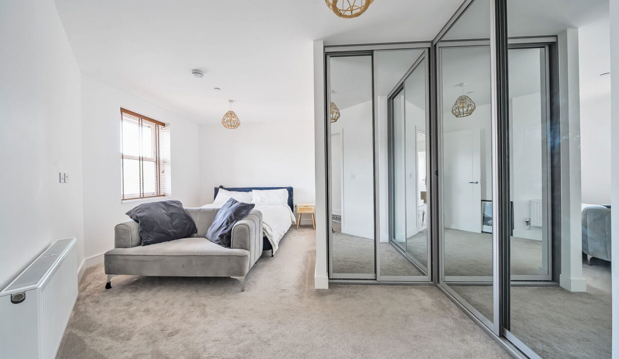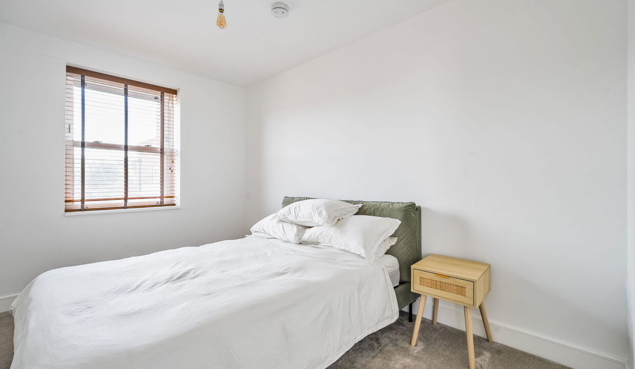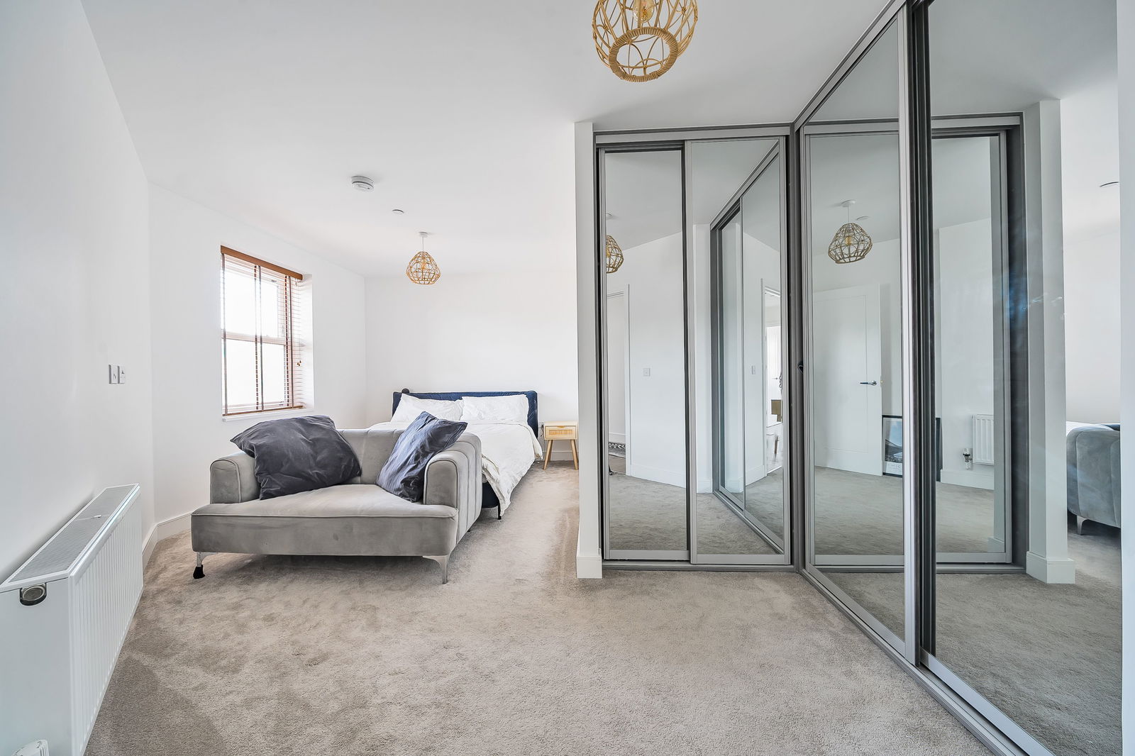 The main bedroom features a modern ensuite shower room and a distinctive angular layout that adds character and charm. A second double bedroom offers versatility for guests, a home office, or a growing family. The family bathroom is finished to a high standard, while a separate utility room provides further convenience and storage options, enhancing the apartment’s practicality.