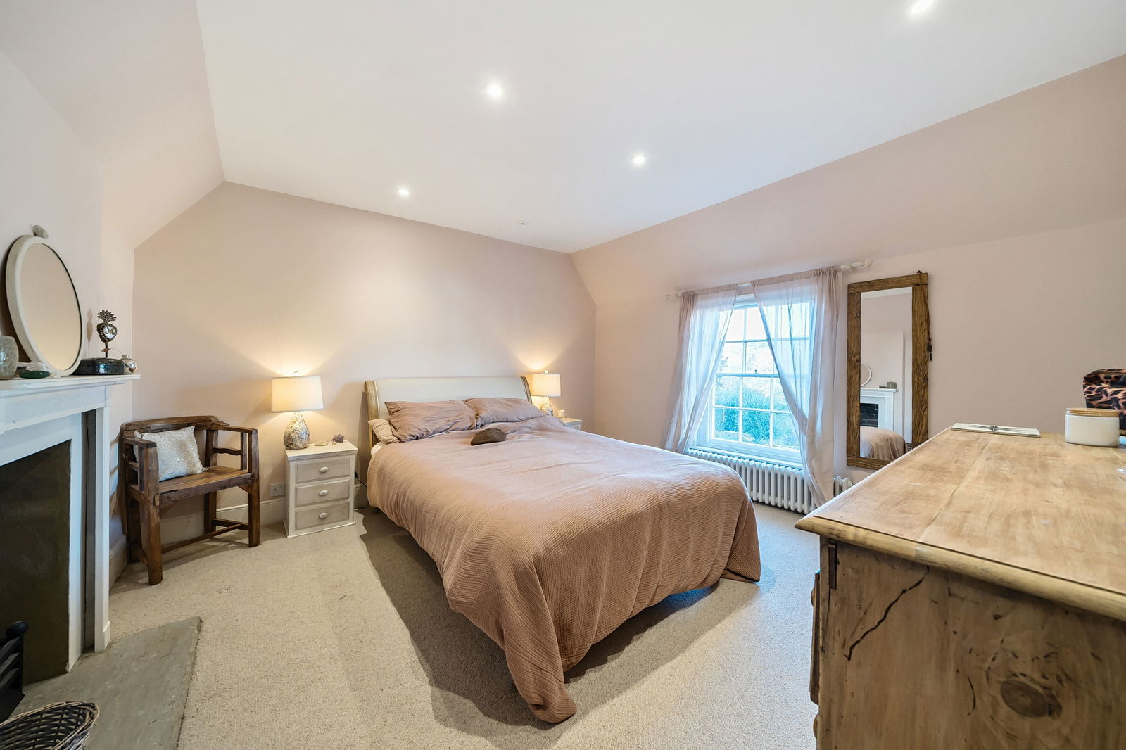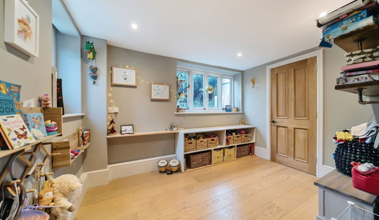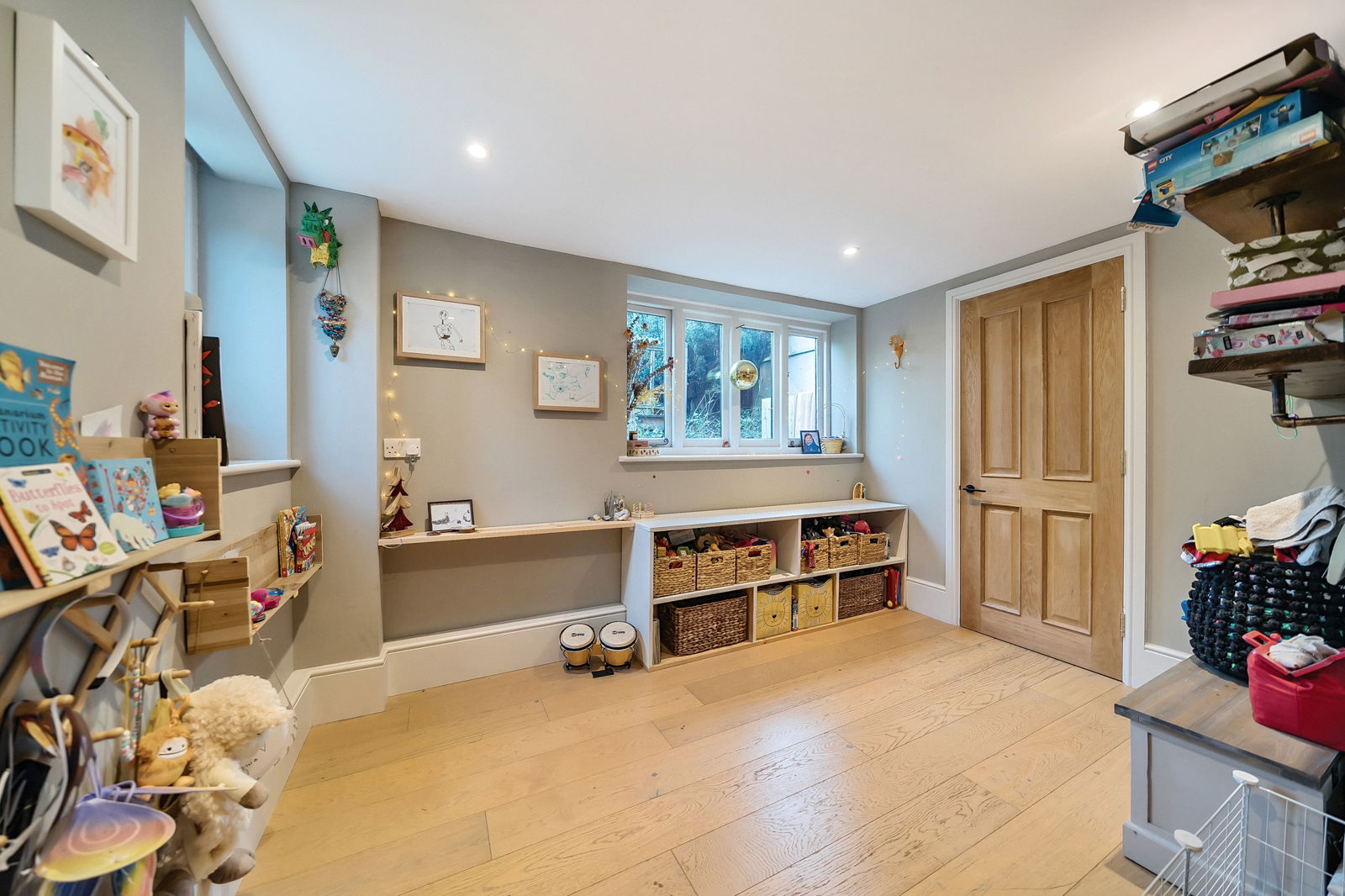 An inner hallway leads to the snug, currently used as a playroom, which offers views of the rear and side garden. The cozy living room exudes character with its beamed ceiling and fireplace, creating a tranquil retreat for evenings at home. A staircase from the inner hall descends to a lower-level study with natural light, underfloor heating, and exposed beams, making it a versatile space ideal for a home office or additional bedroom.