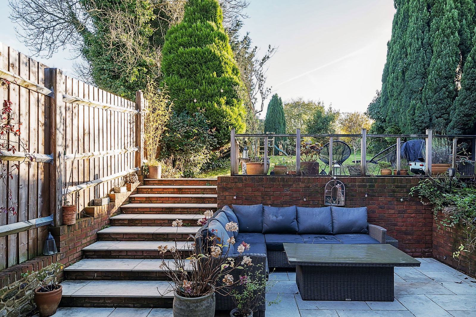 The south-facing rear garden is a true highlight, offering privacy and space to enjoy outdoor living. A patio, accessible from the kitchen/dining room and a side gate, leads to a decked seating area and a large, level lawn. With a fenced border on one side and a raised walled bed on the other, the garden also features a vegetable patch, compost area, two sheds, and a charming summer house/gym.