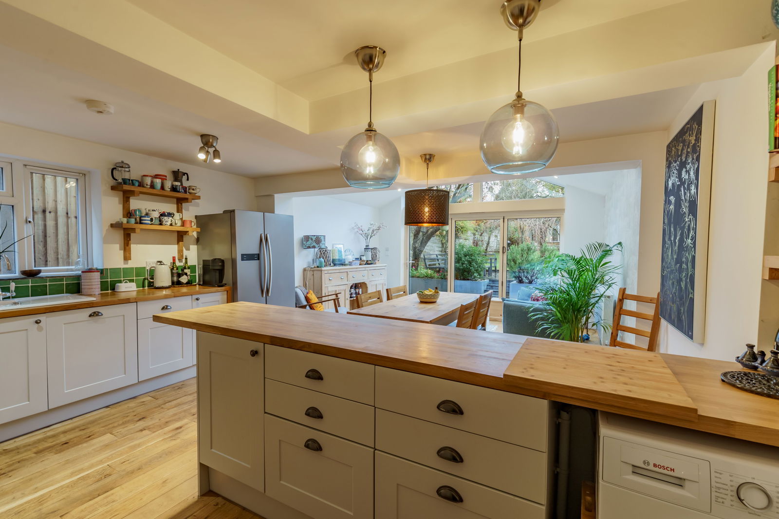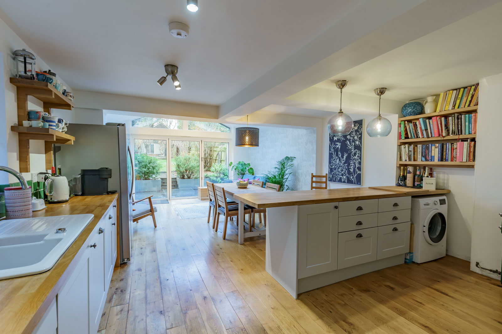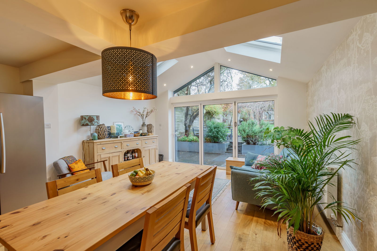 The ground floor begins with a warm and welcoming reception room featuring attractive original details and a traditional open fireplace. This leads through to an impressive, contemporary kitchen and dining space that has been thoughtfully redesigned to suit modern lifestyles. The room is flooded with natural light thanks to its striking double-height ceiling and dramatic floor-to-ceiling window overlooking the landscaped garden. Bi-fold doors open directly onto the outdoor seating area, creating a seamless flow between indoor and outdoor living. A newly fitted shower room completes the ground floor.