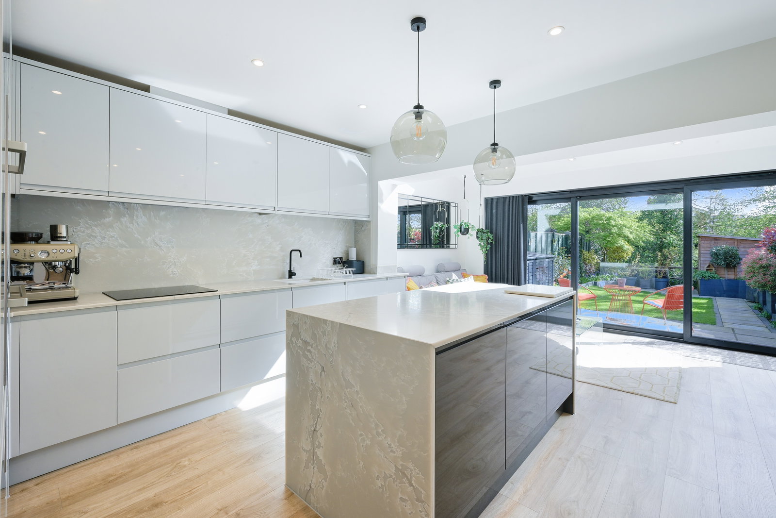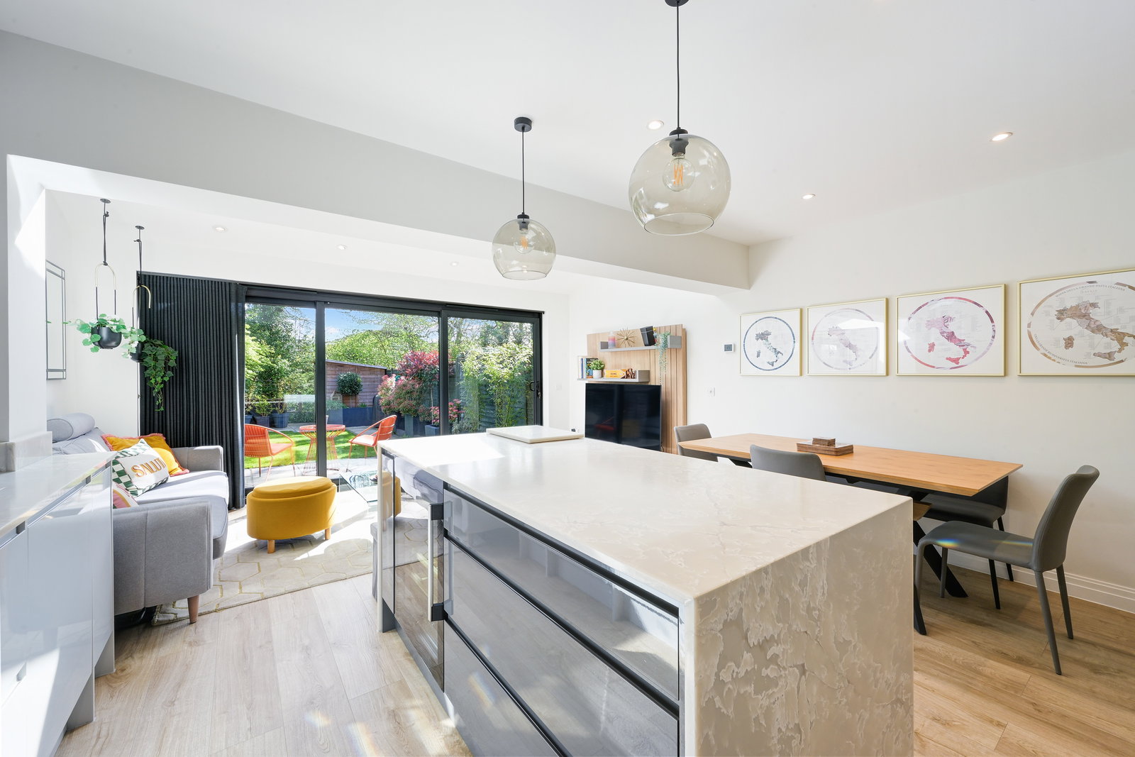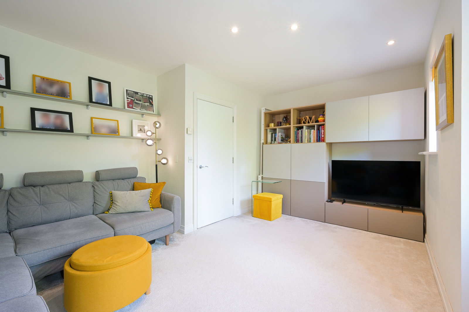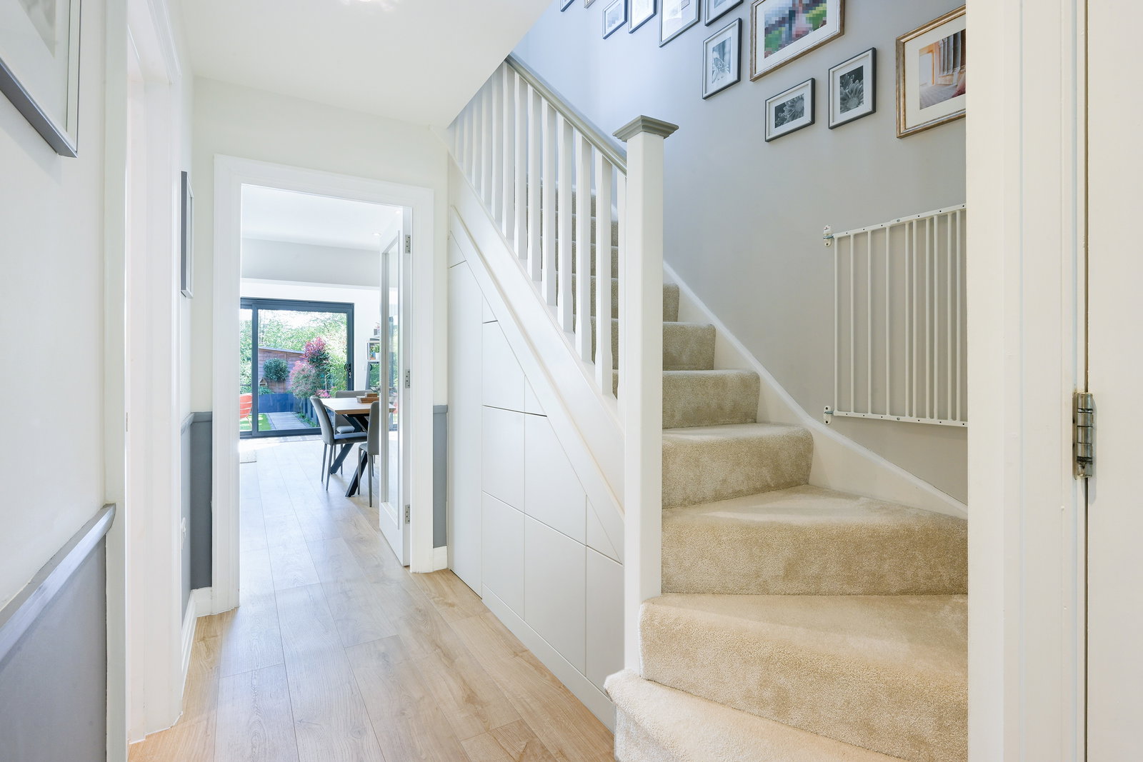 As you enter the home, you are welcomed by a spacious hallway that leads you through the heart of the ground floor. Built in storage has been cleverly created within the staircase, with additional storage in the coat cupboard. The modern and airy kitchen/dining room with a central island as its focus, includes built in storage, this is thoughtfully designed for family meals and social gatherings and sits at the rear of the property. Natural light floods the space through the sliding doors creating a warm and welcoming atmosphere, while underfloor heating throughout the entire house ensures comfort year-round. The ground floor also benefits from a dedicated utility room with modern storage units, sink and space for washing machine, a convenient downstairs cloakroom, and a versatile study/home office at the front, making it perfect for modern family life.