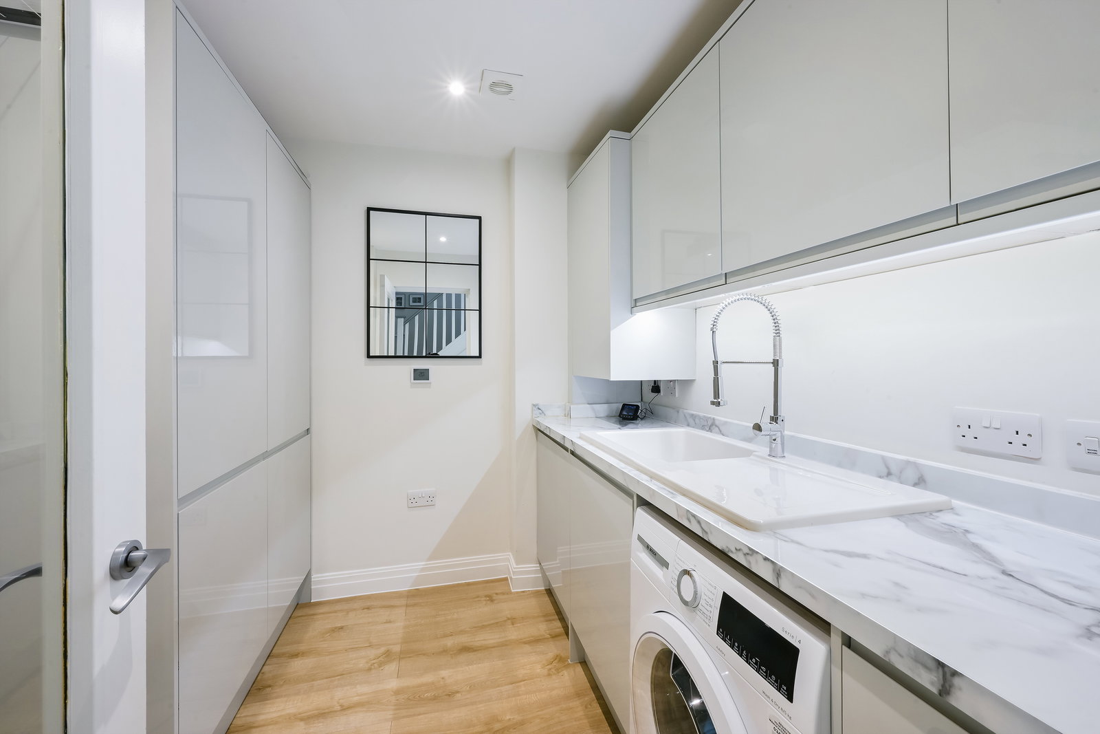The first floor is home to the principal suite, which boasts a spacious double bedroom, bespoke fitted sliding wardrobes, and a stunning luxurious ensuite shower room. This floor also features a large, light-filled living room with built in storage overlooking the peaceful square.