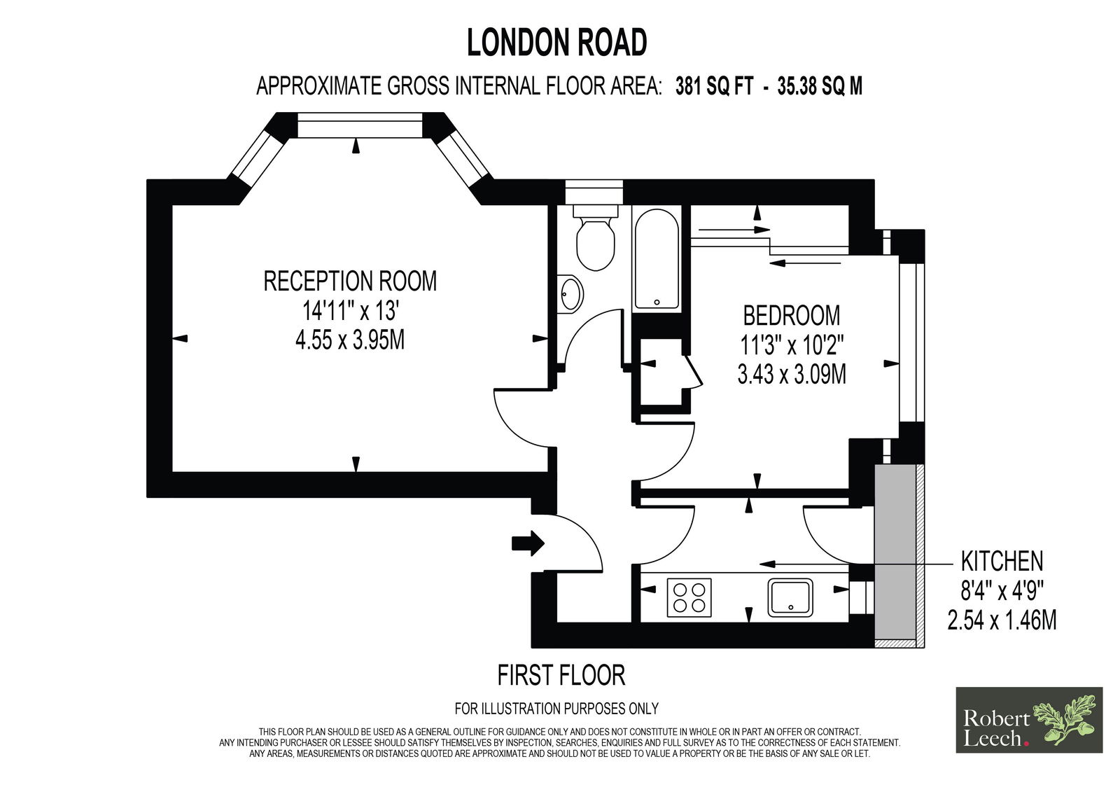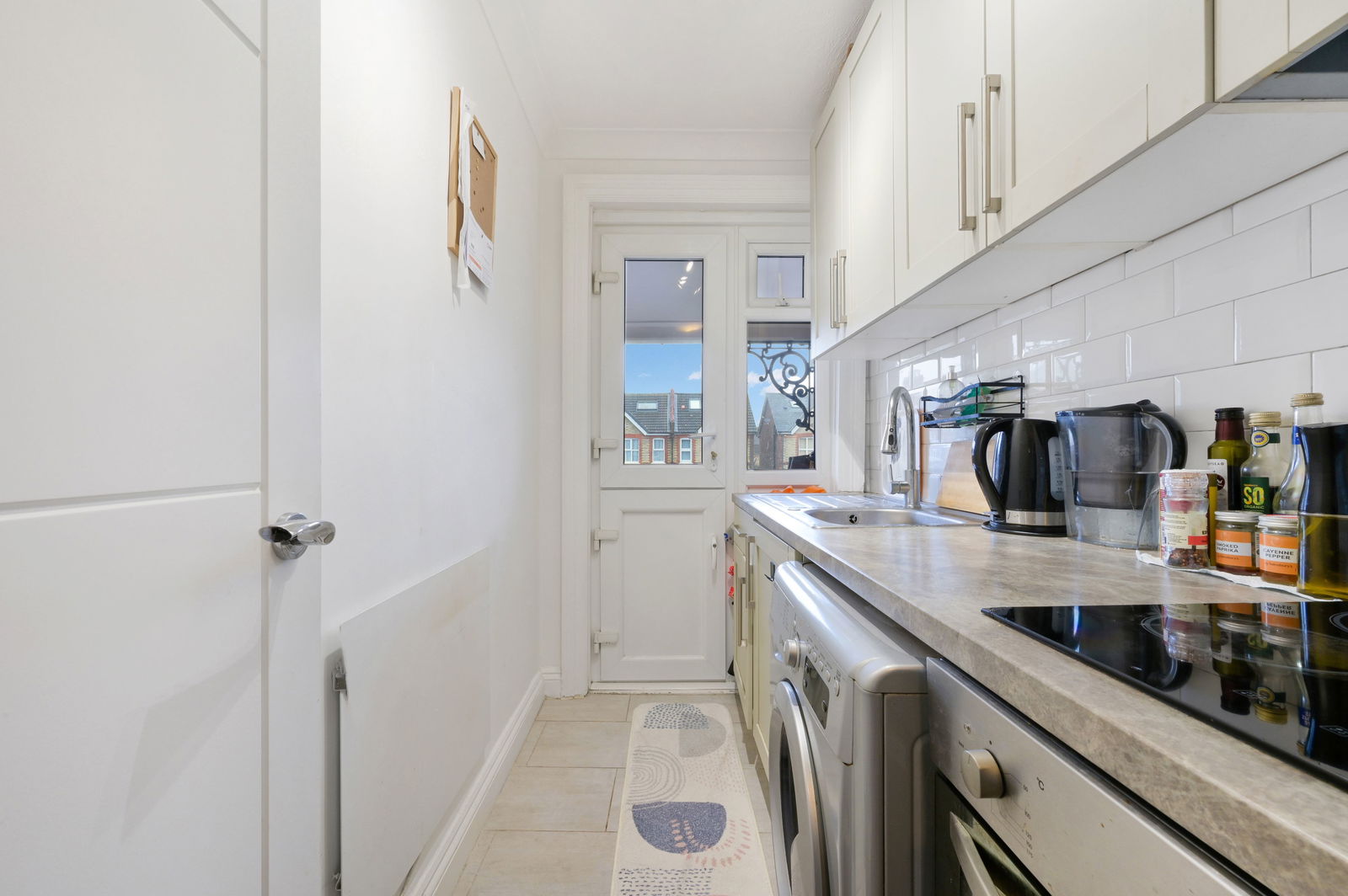 This apartment is in a pretty Victorian building and as such enjoys character features. The reception room is of good size, with a delightful bay window to the rear elevation, flooding the room with natural light and providing a great feeling of space. A feature cast iron fireplace creates a wondeful focal point to the room. The bedroom is also well proportioned, with a box bay window to the front aspect, with fitted wardrobes with sliding, mirrored doors giving ample storage. The kitchen has a range of cabinets and a washer/dryer and fridge/freezer, whilst a door gives access out onto the balcony with pretty cast iron accents. The bathroom has been refurbished with a white suite, bath with shower over and fully tiled walls.
