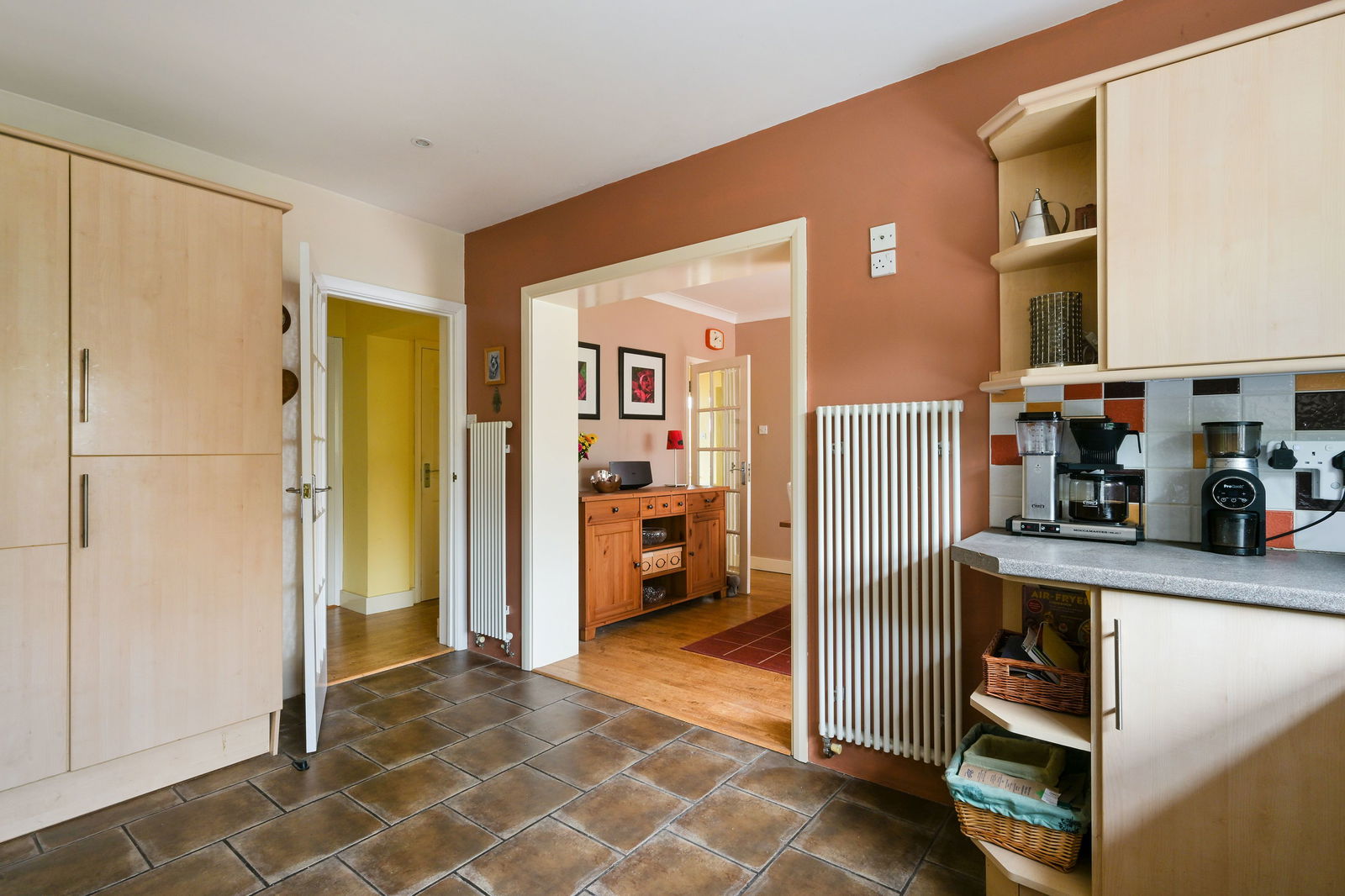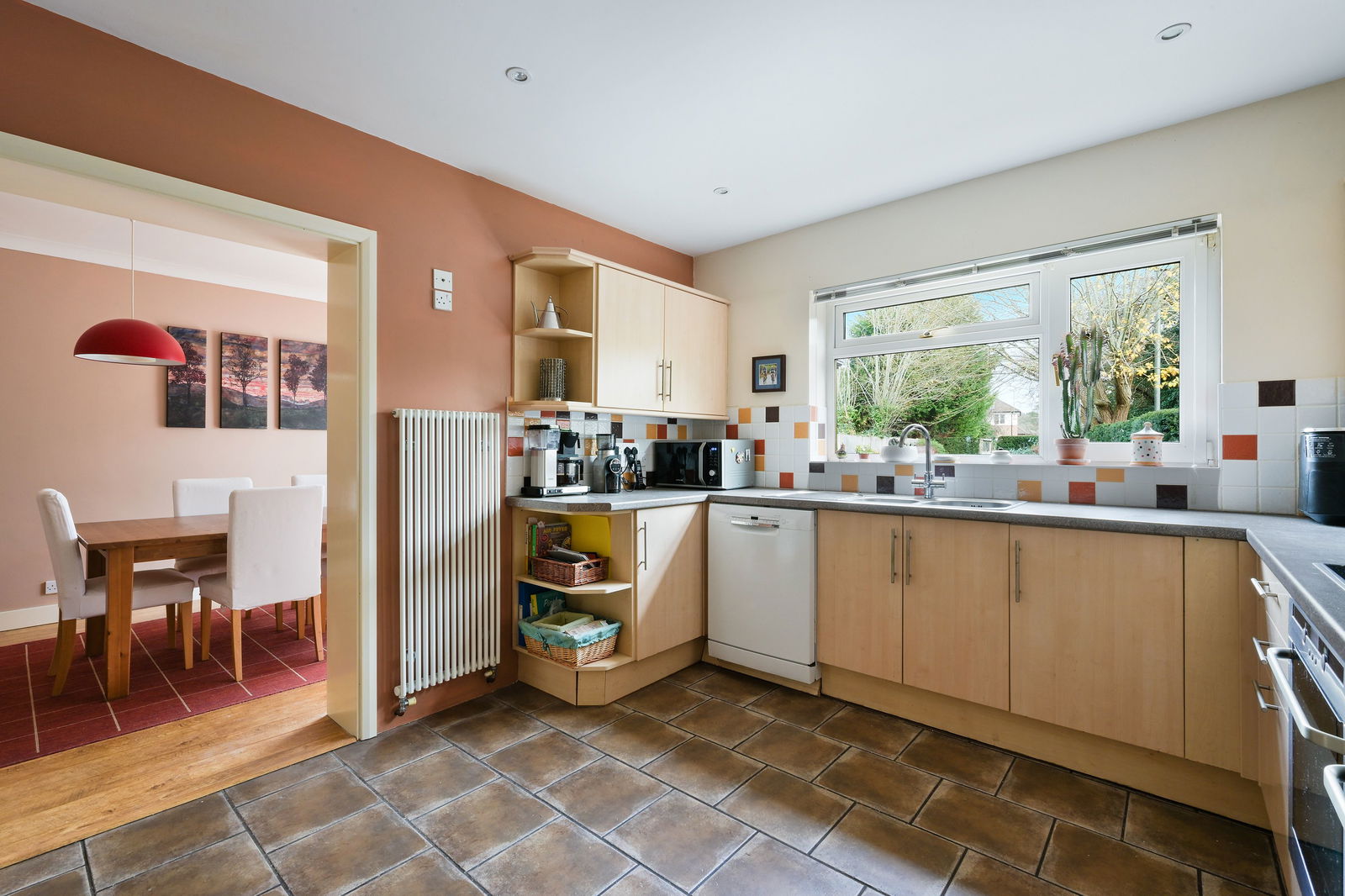 The well-appointed kitchen is fitted with a range of wall and base units, a fridge/freezer, induction hob and double oven, and enjoys pleasant views over the rear garden. Adjoining the kitchen, the dining room provides an ideal area for family meals and hosting guests. A separate utility room and a ground-floor WC further enhance the functionality of the layout, offering excellent flexibility for those working from home.
