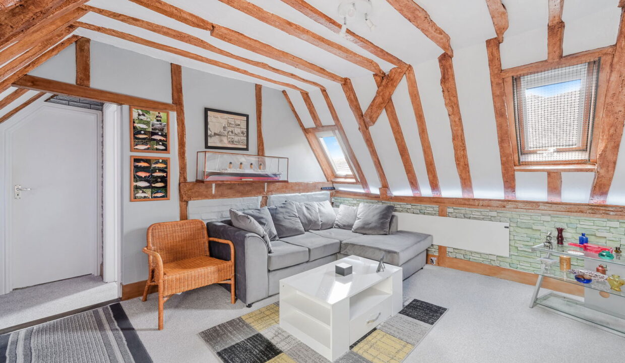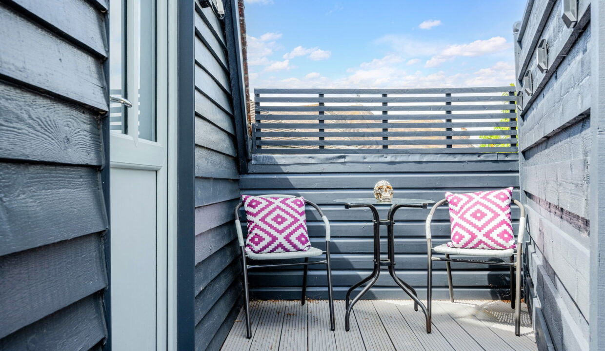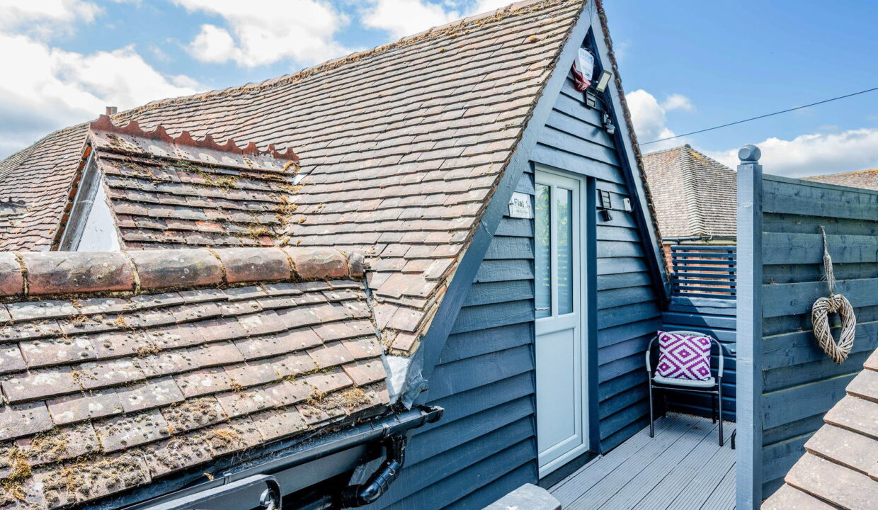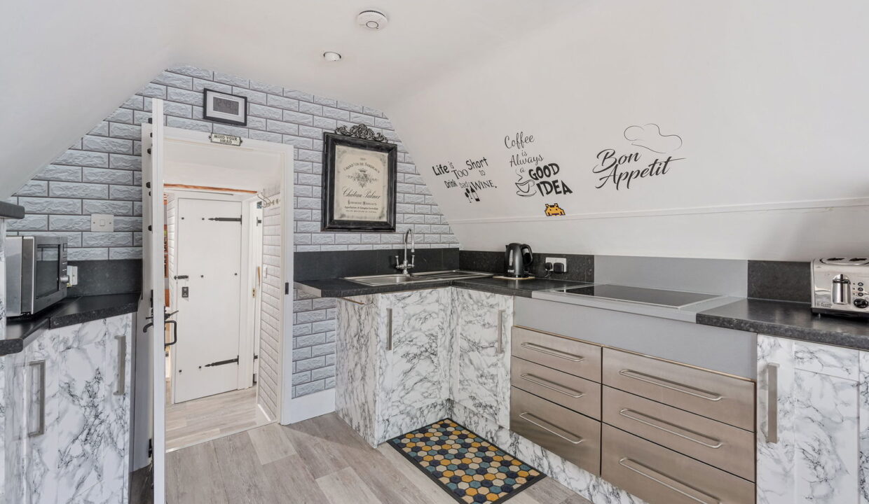 Approached via a spiral staircase which leads to a communal decked area for both apartments. Stepping inside, the refitted kitchen with extensive storage has integrated double oven and electric induction hob. A spacious hallway allowing access to both the bathroom and lounge, currently being utilised as a breakfast area. There is a generous sitting room with two skylights allowing plenty of light to give a spacious feel to the room.