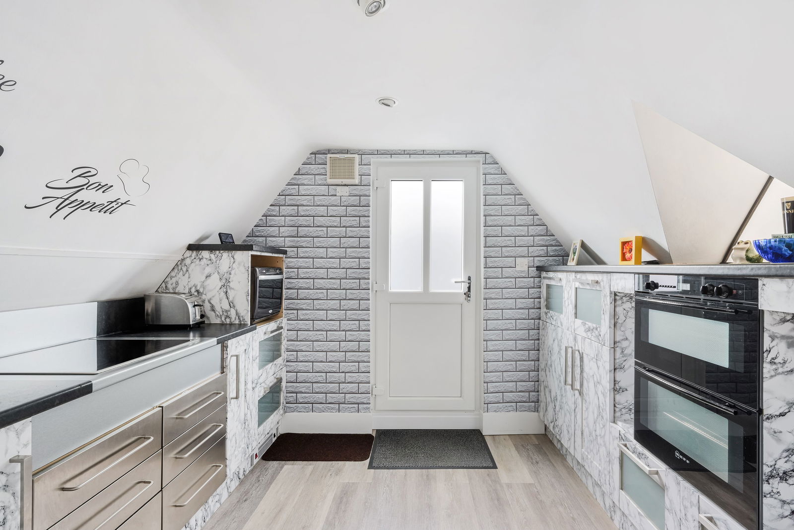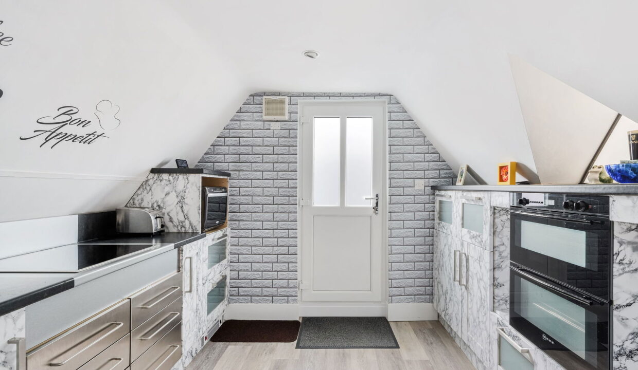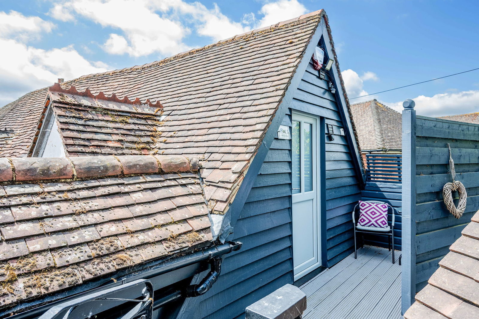Approached via a spiral staircase which leads to a communal decked area for both apartments. Stepping inside, the refitted kitchen with extensive storage has integrated double oven and electric induction hob. A spacious hallway allowing access to both the bathroom and lounge, currently being utilised as a breakfast area. There is a generous sitting room with two skylights allowing plenty of light to give a spacious feel to the room.
