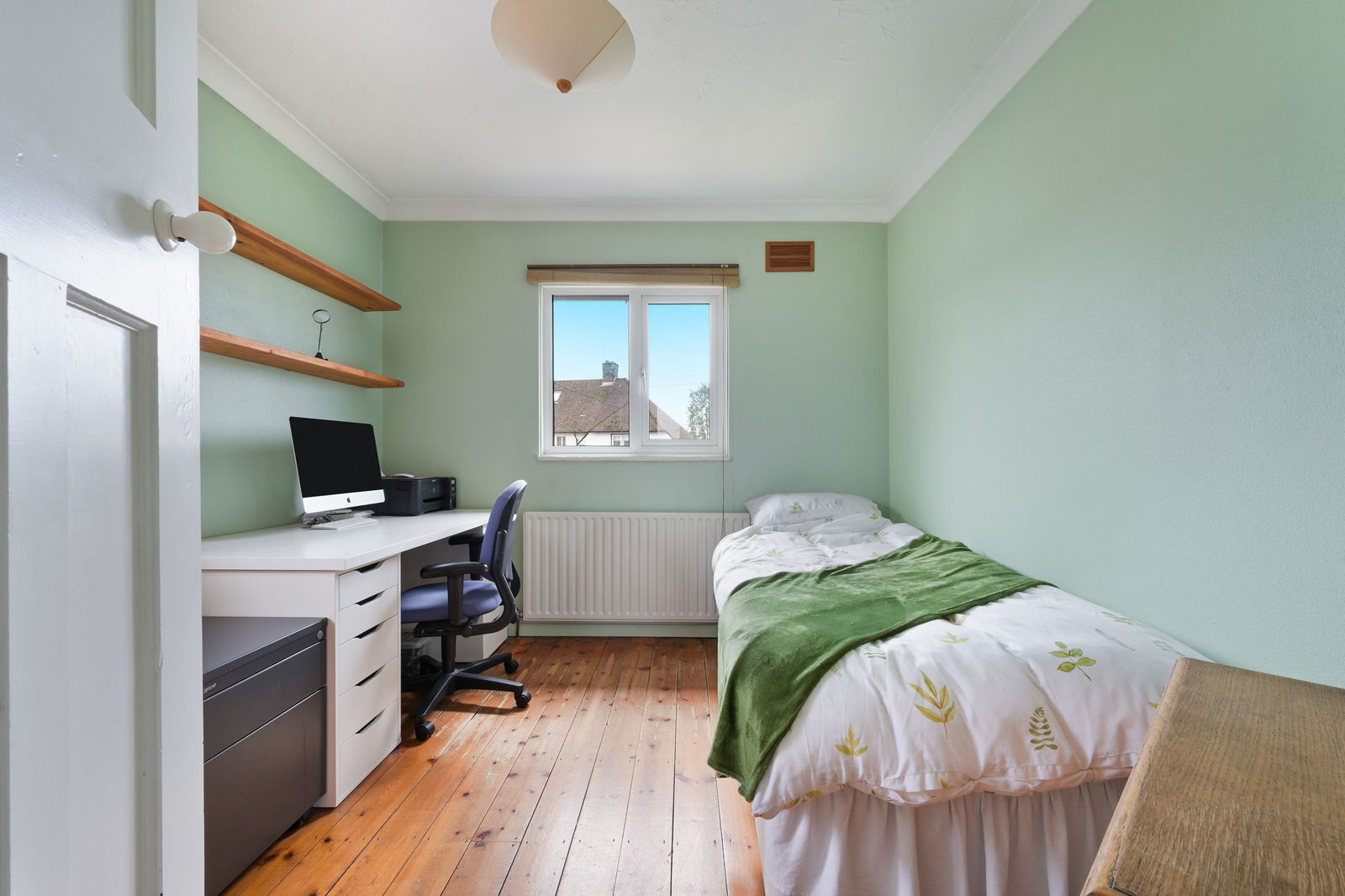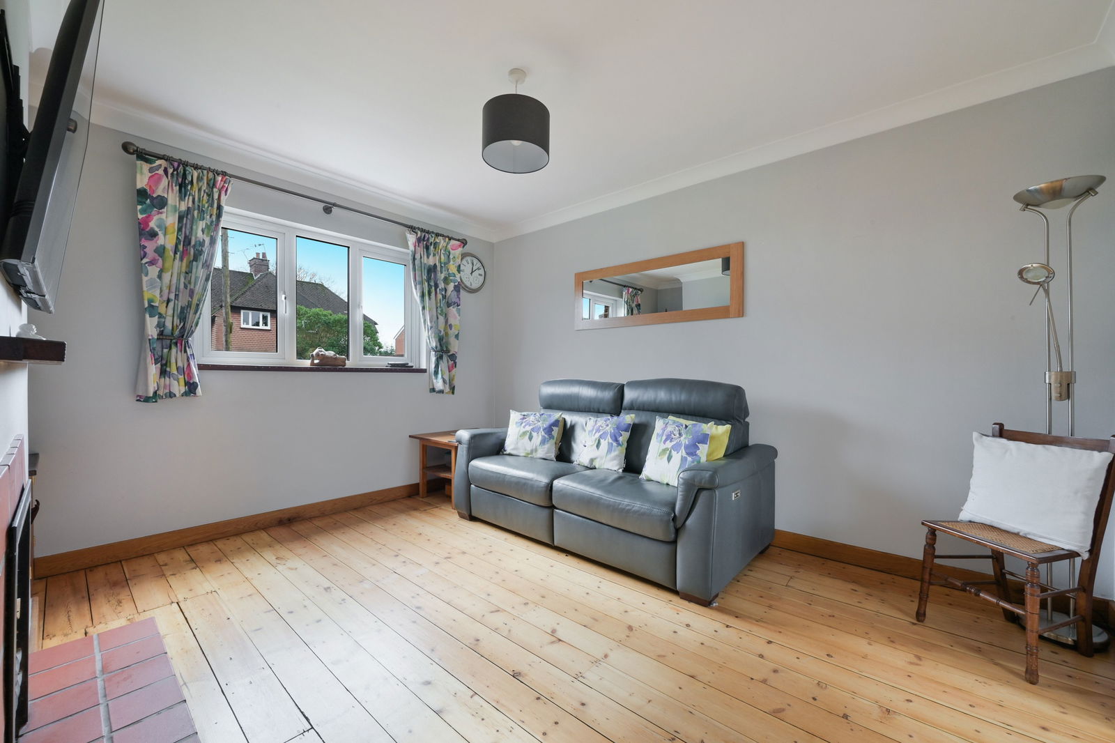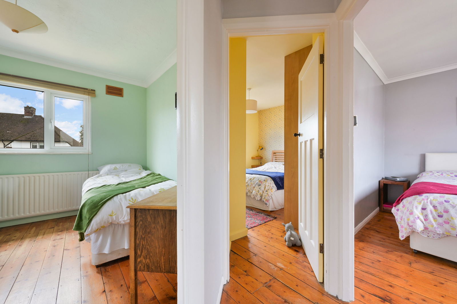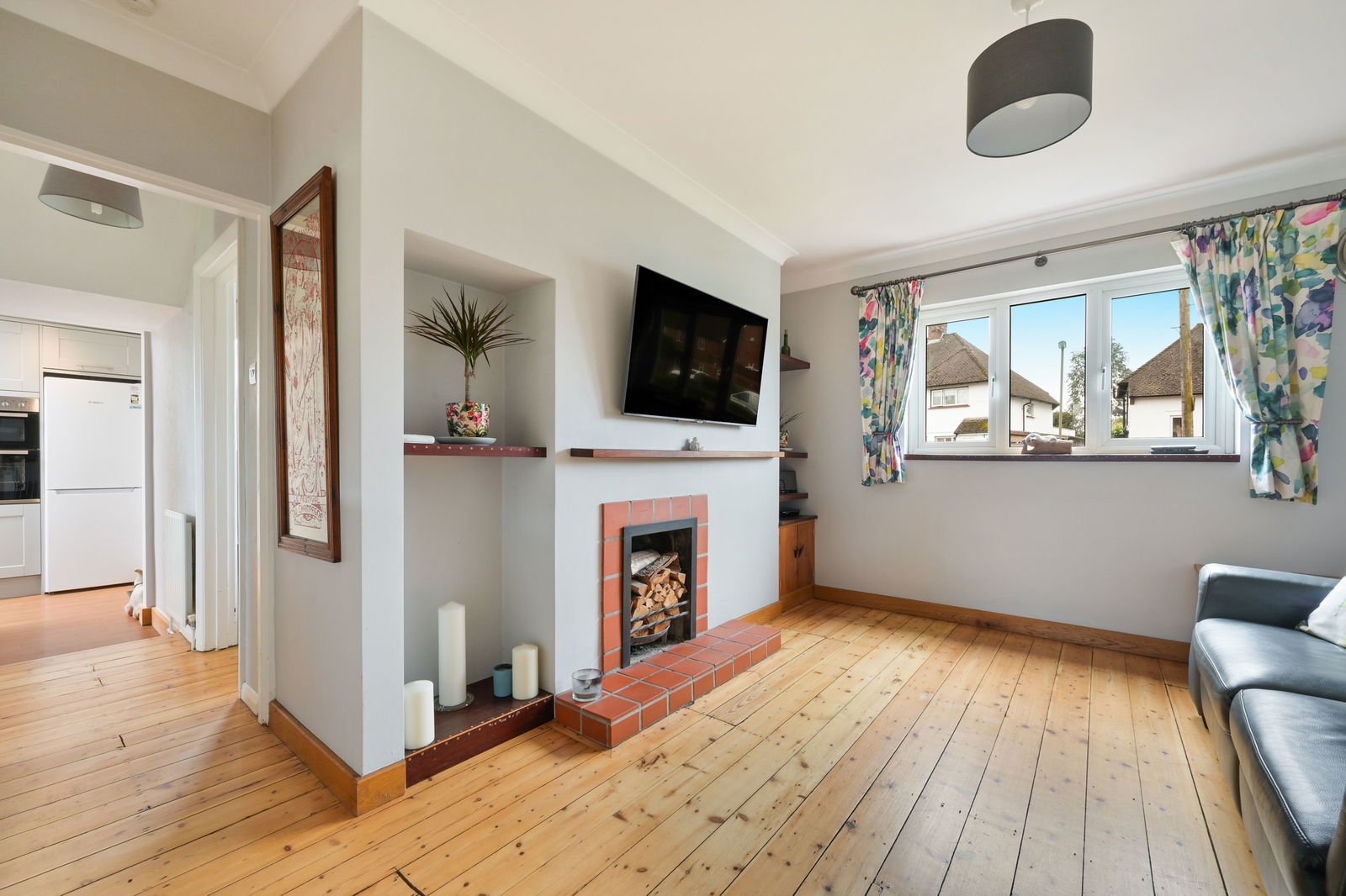 To the first floor are three generous bedrooms arranged around a central landing, together with a family bathroom. The principal bedroom is particularly charming, benefitting from fitted furnishings and a feature fireplace, while the remaining rooms offer flexibility for family life, guests or home working.