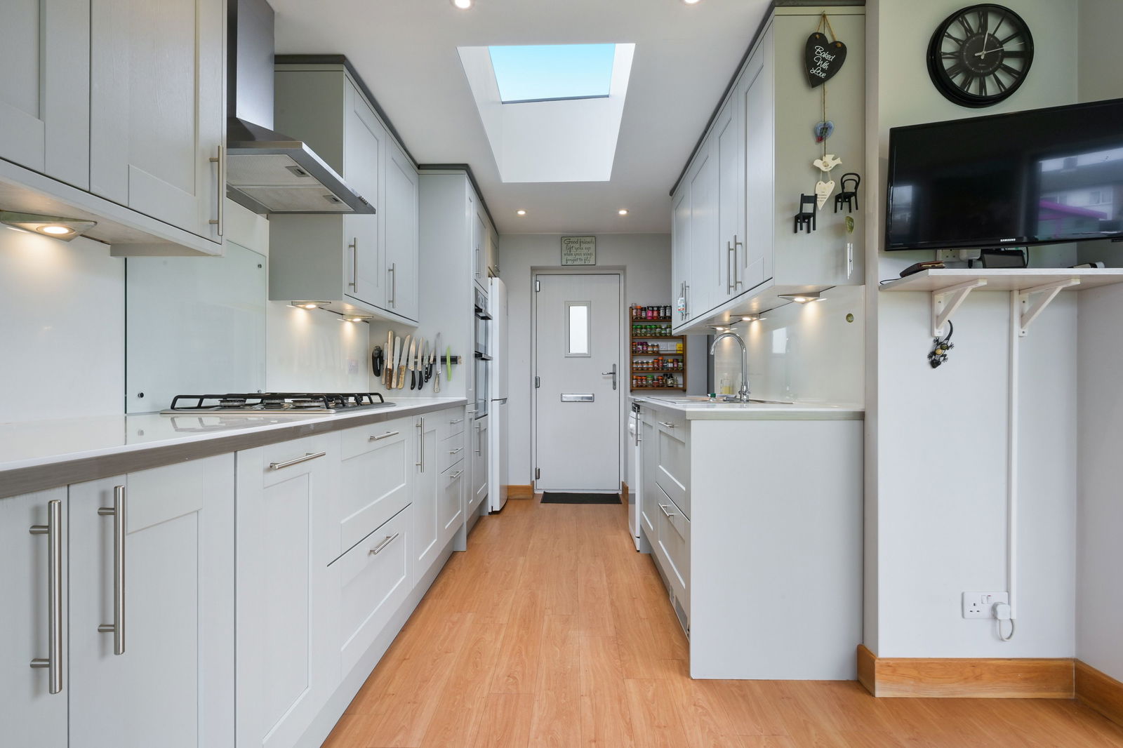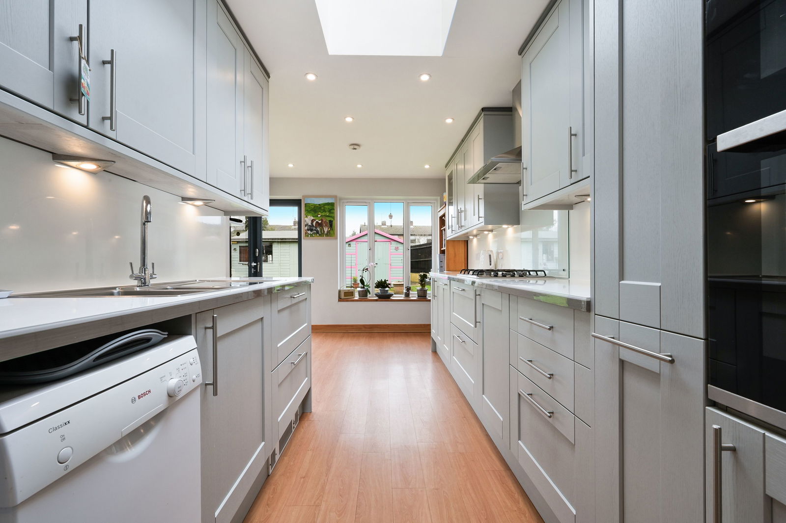 The ground floor is particularly impressive, with a striking open-plan kitchen/breakfast room forming the centrepiece of the house. Designed to maximise light and connection to the garden, this superb space features skylights overhead and bi-fold doors that open directly onto the rear terrace, seamlessly extending the living area outdoors. The kitchen itself is comprehensively fitted with integrated appliances and generous storage, while a separate utility room provides further practicality and keeps the main living space uncluttered. A cloakroom completes the ground floor accommodation.