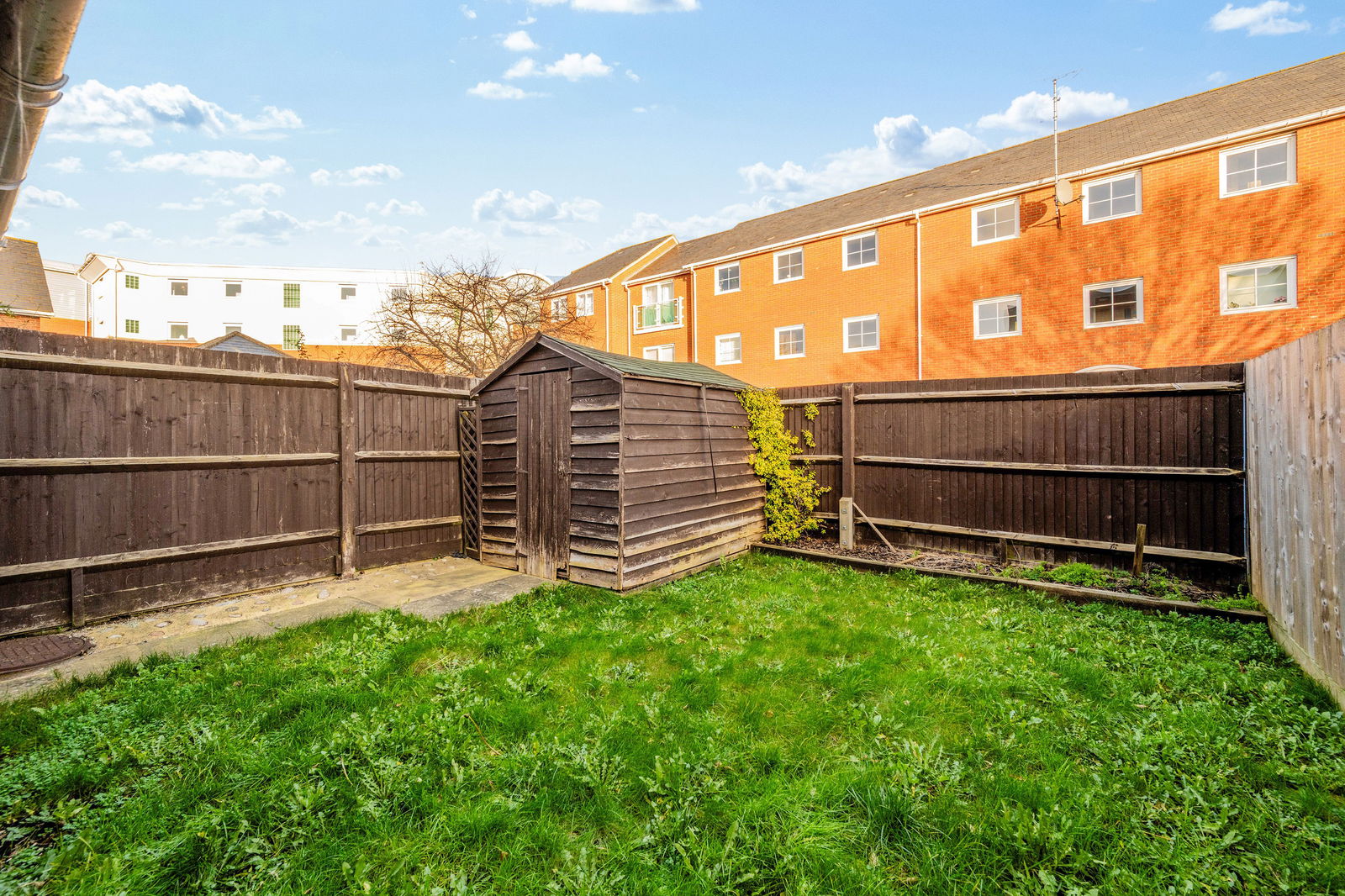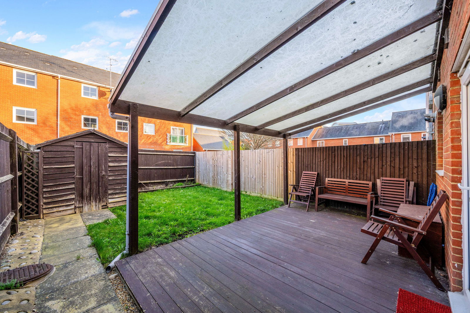Outside, the garden is low maintenance with a covered decking area, lawn, shed, and side access to the front of the property.