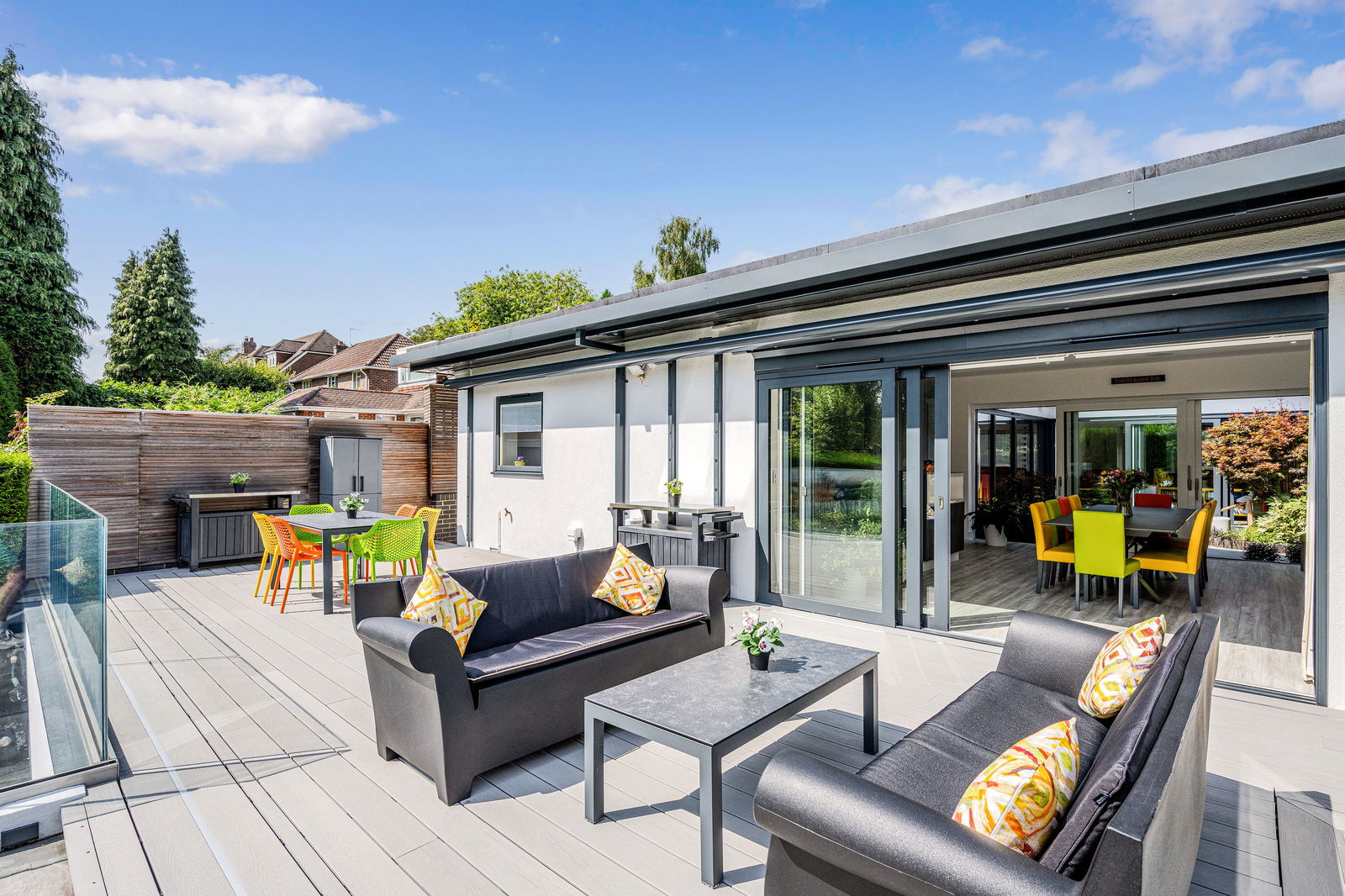 The open plan kitchen is a particularly special feature of this contemporary home. The large sliding doors open on to a composite deck with glass balustrade that is perfect for entertaining and overlooks the large flat lawn area. Cleverly designed to provide both space for entertaining and for play, the garden is low maintenance and south facing – the perfect combination.