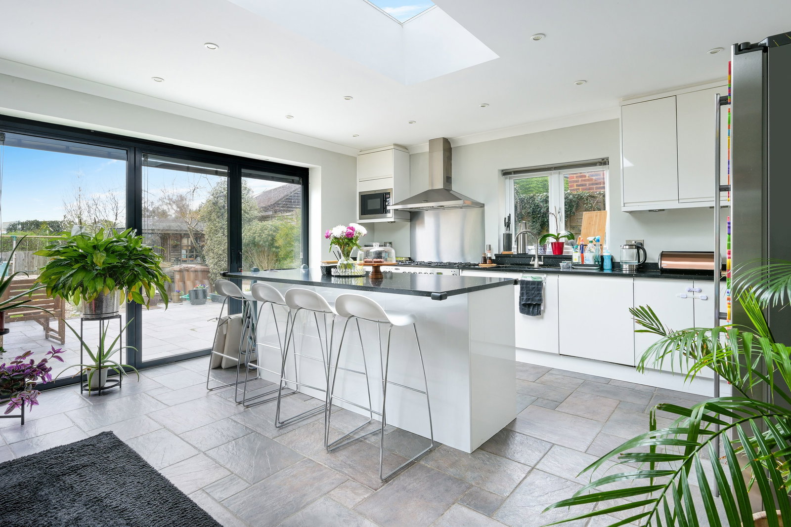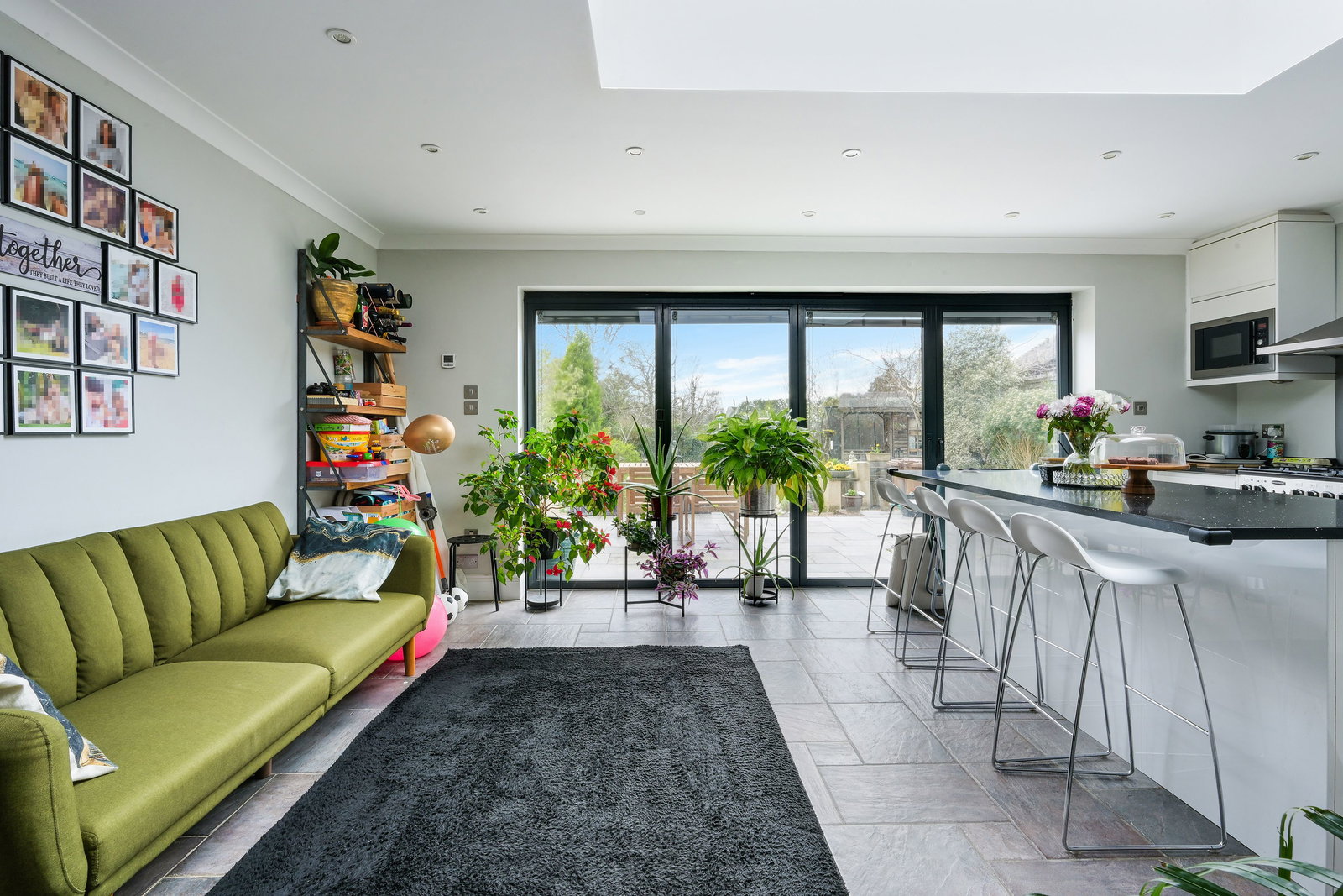 The heart of the home is undoubtedly the impressive family kitchen/dining room, which has a feature island and bi-folding doors that open directly onto the extensive rear garden. This bright and sociable space is perfect for both daily family life and entertaining, seamlessly blending indoor and outdoor living.