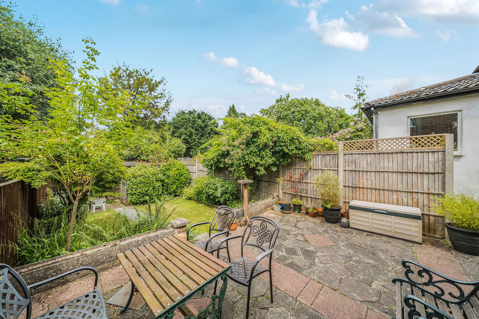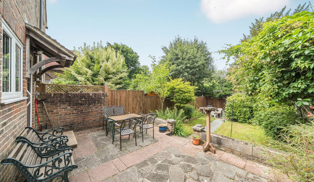 - Rear garden with patio and mature planting