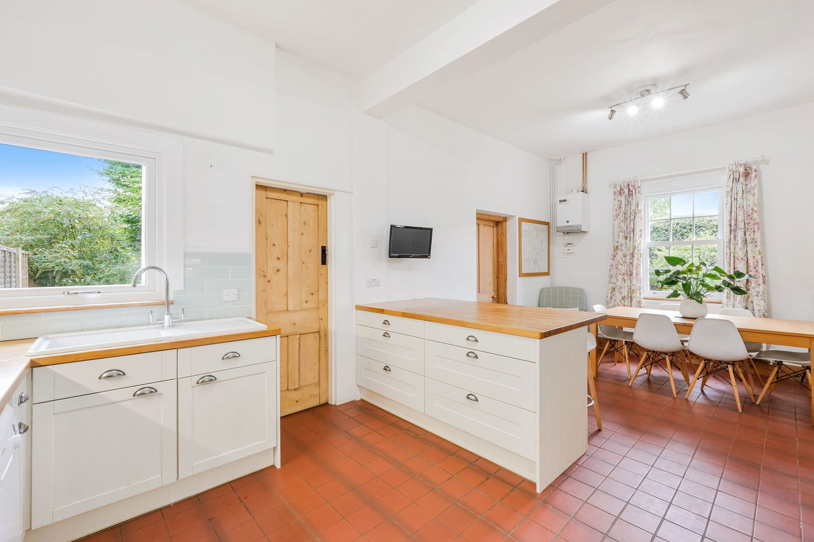 Inside, the heart of the home is the spacious kitchen/dining room, with its solid wood worktops, butler-style sink, and a central island perfect for casual dining or entertaining. The kitchen flows through to a light-filled reception room that opens onto the rear garden, ideal for relaxing or hosting guests. A separate sitting room/study to the front provides a quiet retreat or an excellent home office. Upstairs, four well-proportioned bedrooms are served by a generous family bathroom, making the layout ideal for growing families or visiting guests.