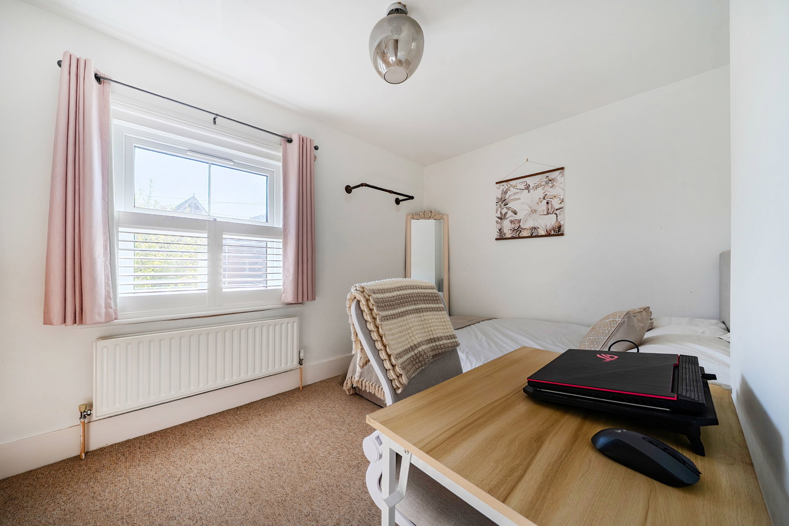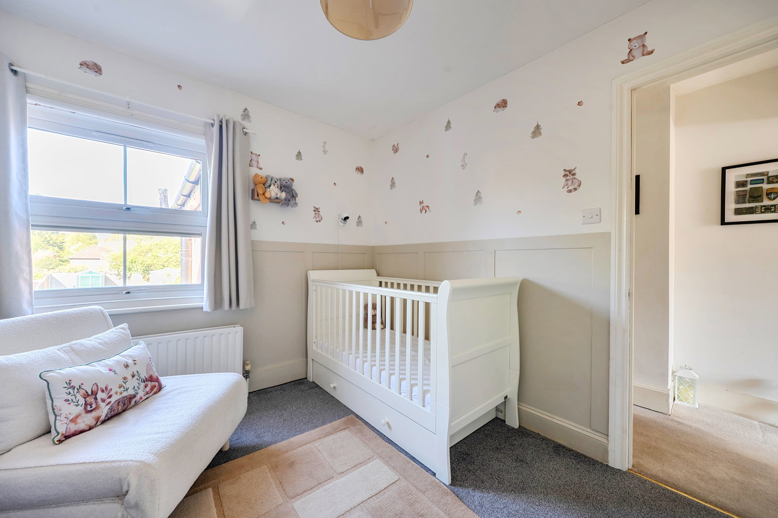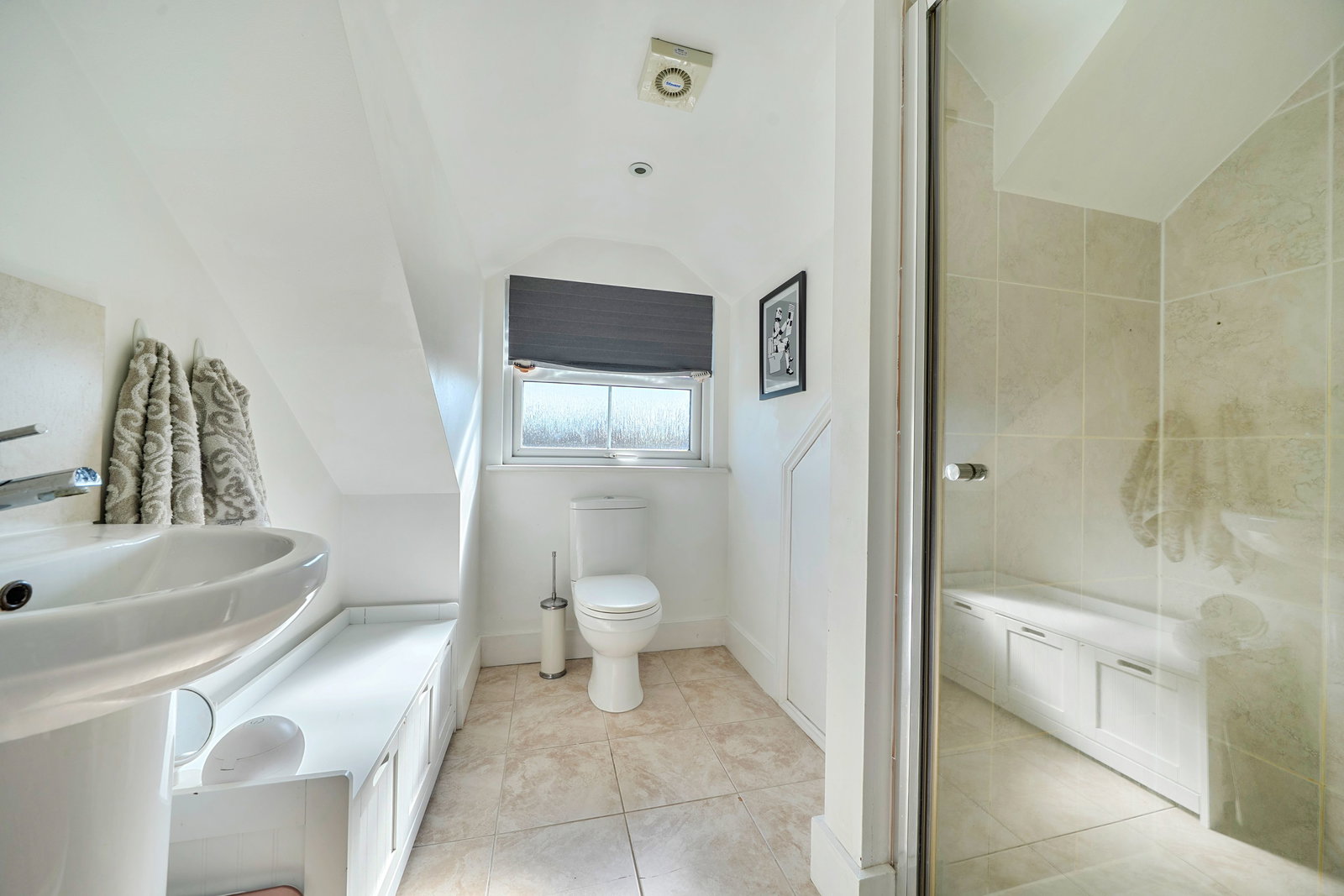 The first floor comprises two bedrooms, including a generous principal bedroom, alongside a family bathroom. A further staircase rises to the second floor where a third bedroom is located, benefiting from useful eaves storage and access to an additional WC, making it an ideal guest room, home office or private retreat.