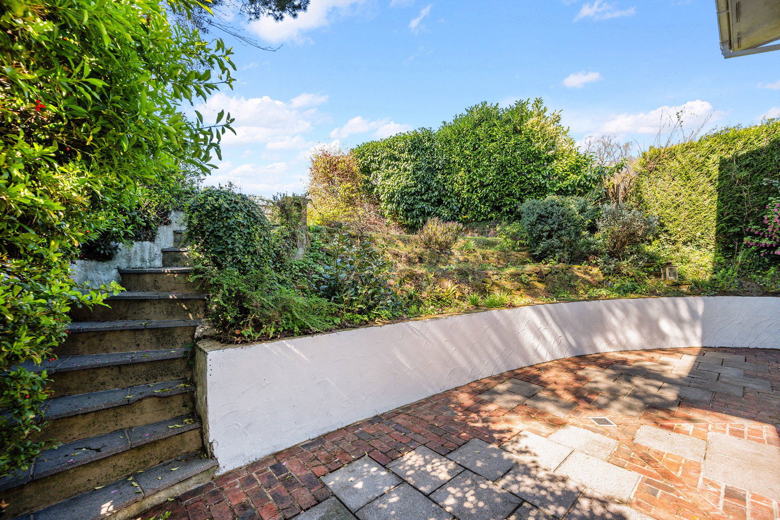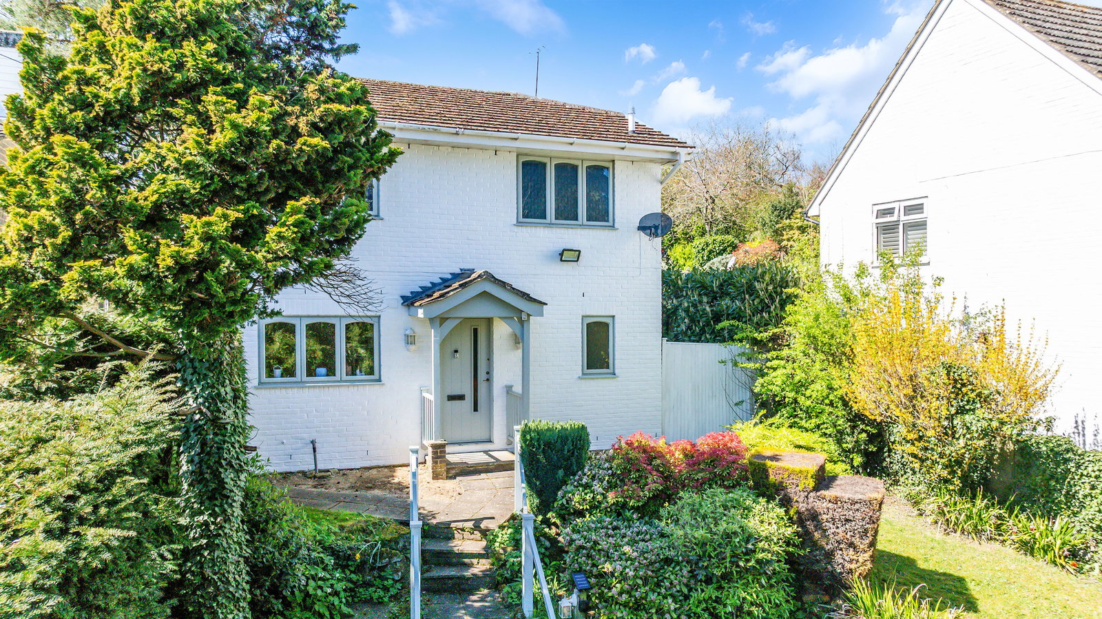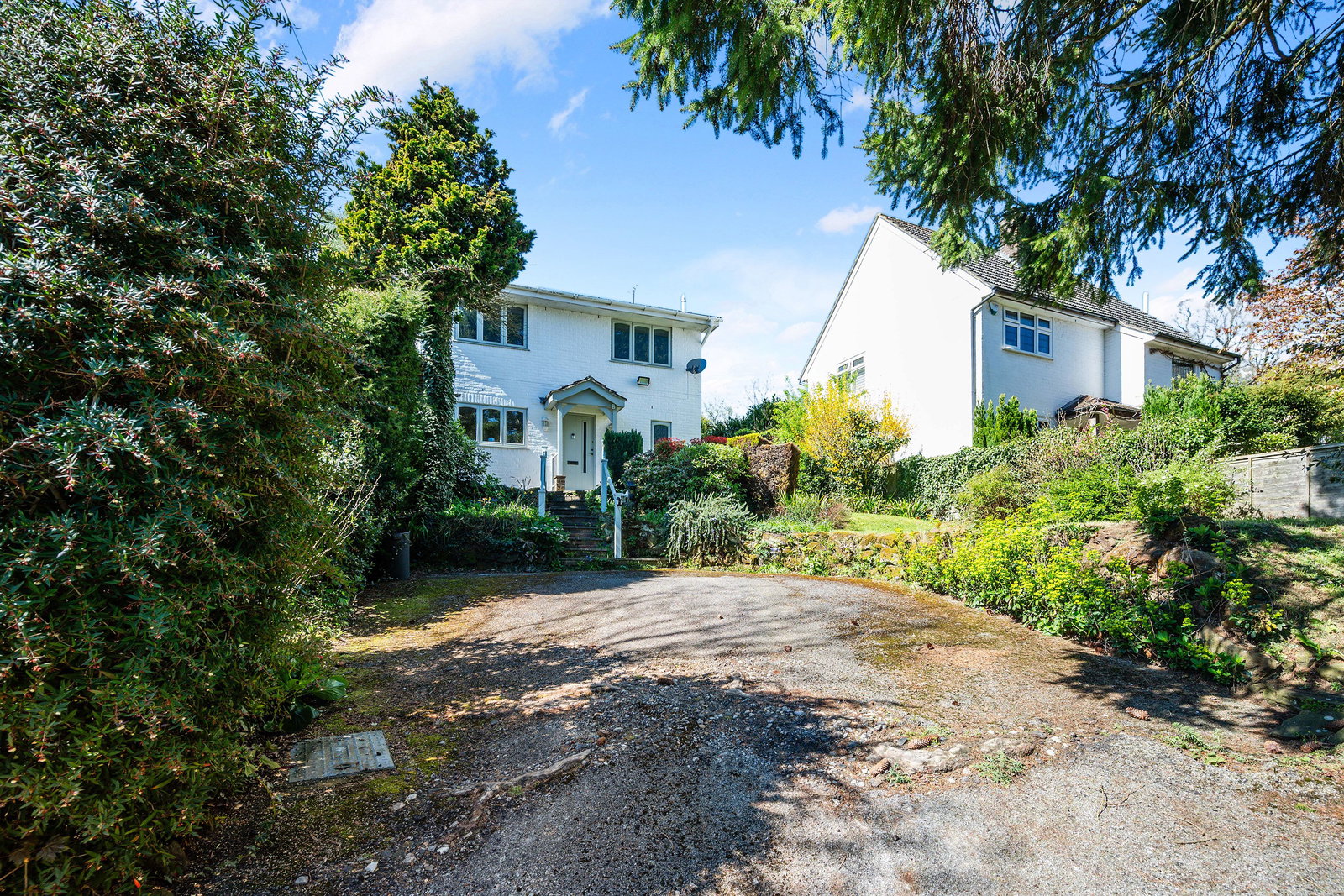 The property is approached via a private driveway, with steps leading to the front entrance, framed by established planting, mature trees and a garden shed.