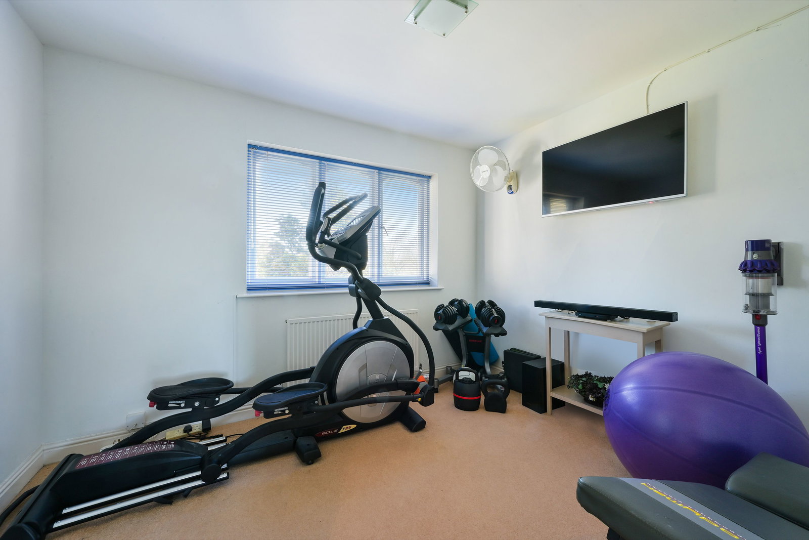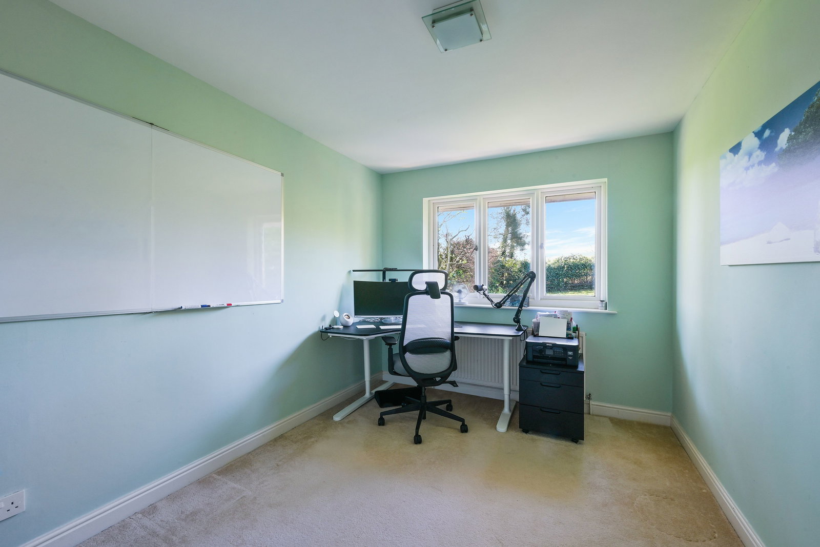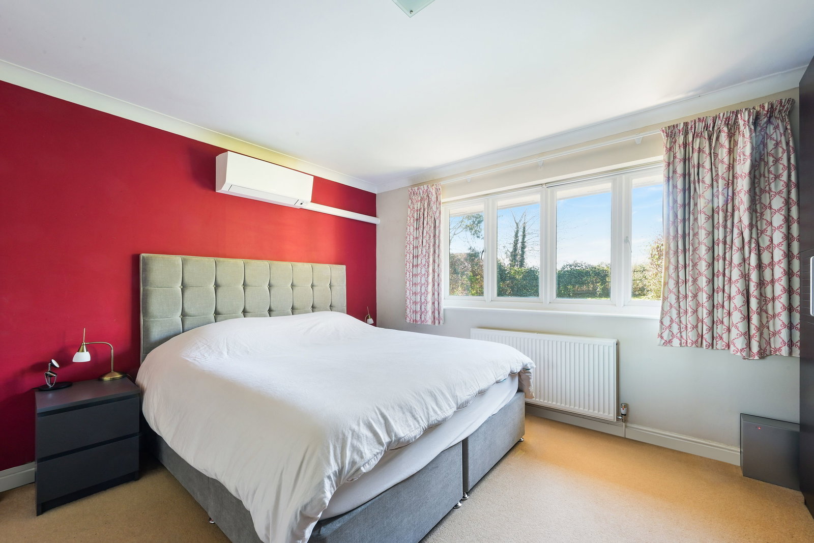Upstairs, a bright and airy landing leads to three well-proportioned double bedrooms. The principal bedroom enjoys pleasant views over the rear garden and benefits from air conditioning and ample space for freestanding wardrobes. The remaining bedrooms are equally versatile, ideal for family living, guests, or home working, with one also featuring air conditioning.